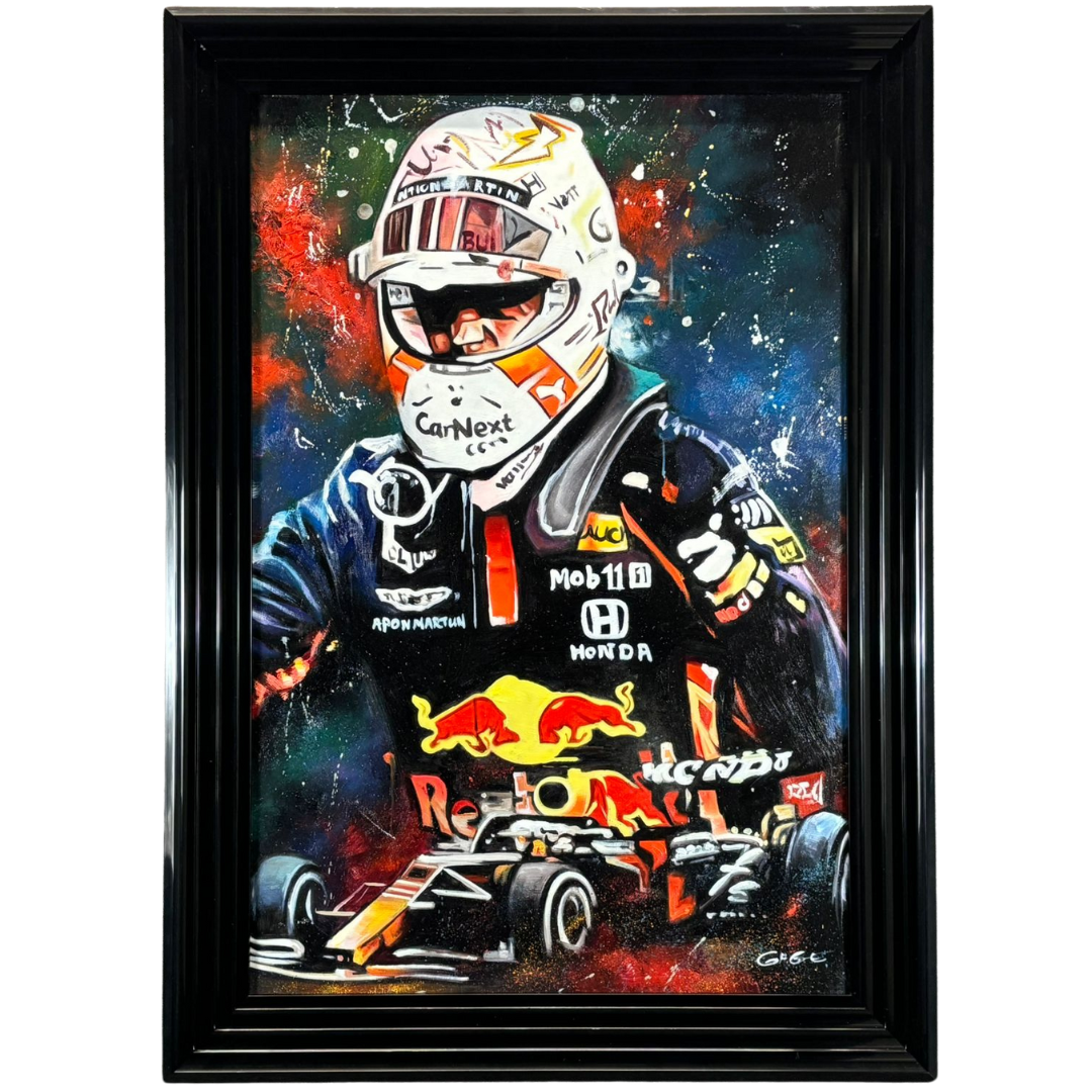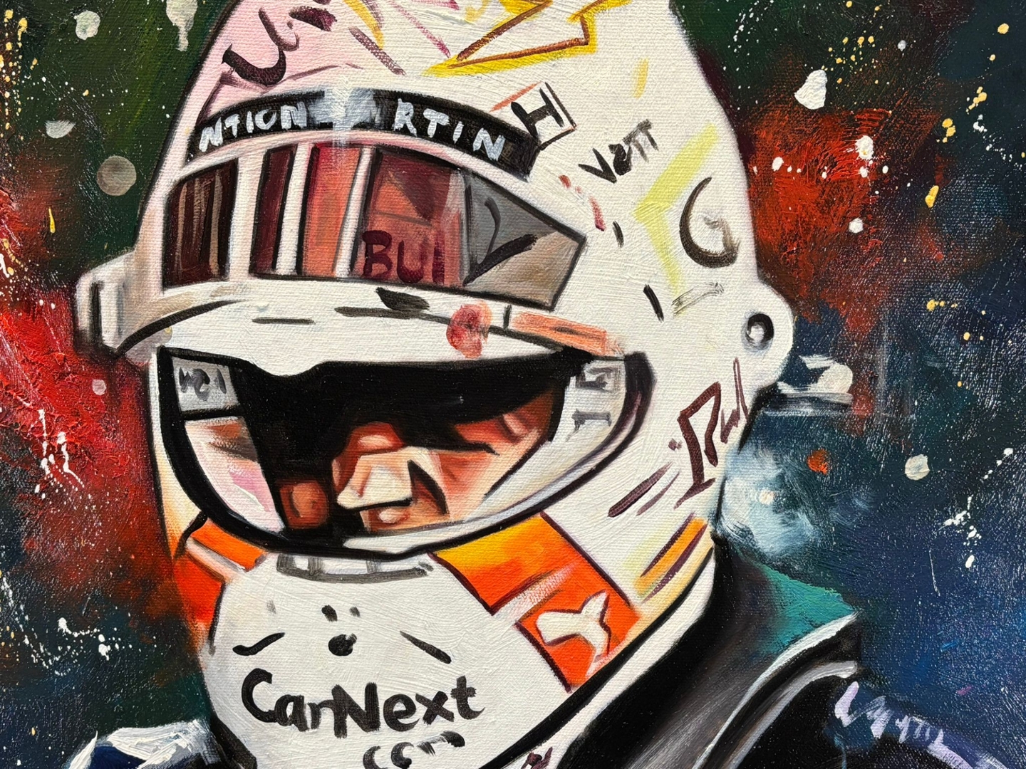 An original oil painting by the artist Gage, titled Max L’as du Volant, is a thrilling tribute to Formula 1 champion Max Verstappen. Measuring 90cm x 60cm, the artwork bursts with energy and precision, capturing the Dutch driver in the heat of competition. Gage’s dynamic brushwork and bold use of colour bring the Red Bull Racing icon to life, conveying both the intensity and speed that define his career.