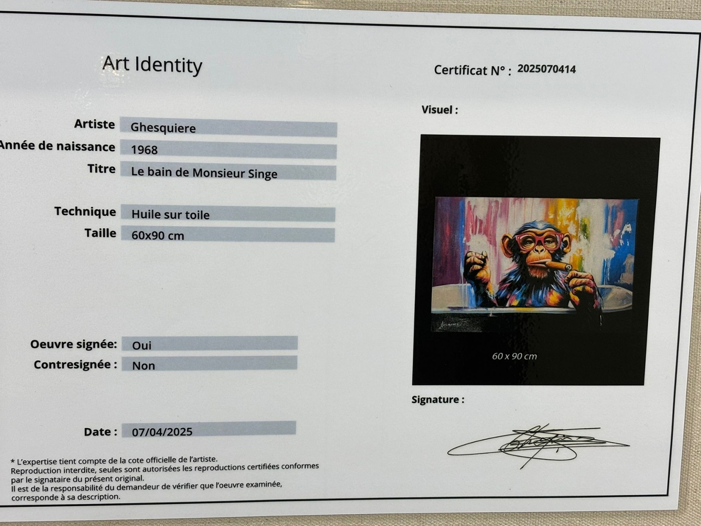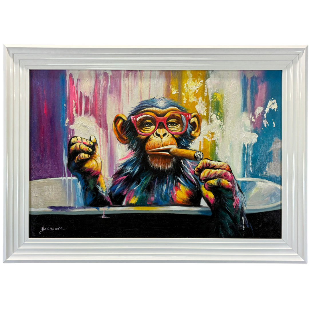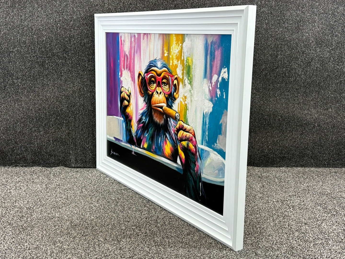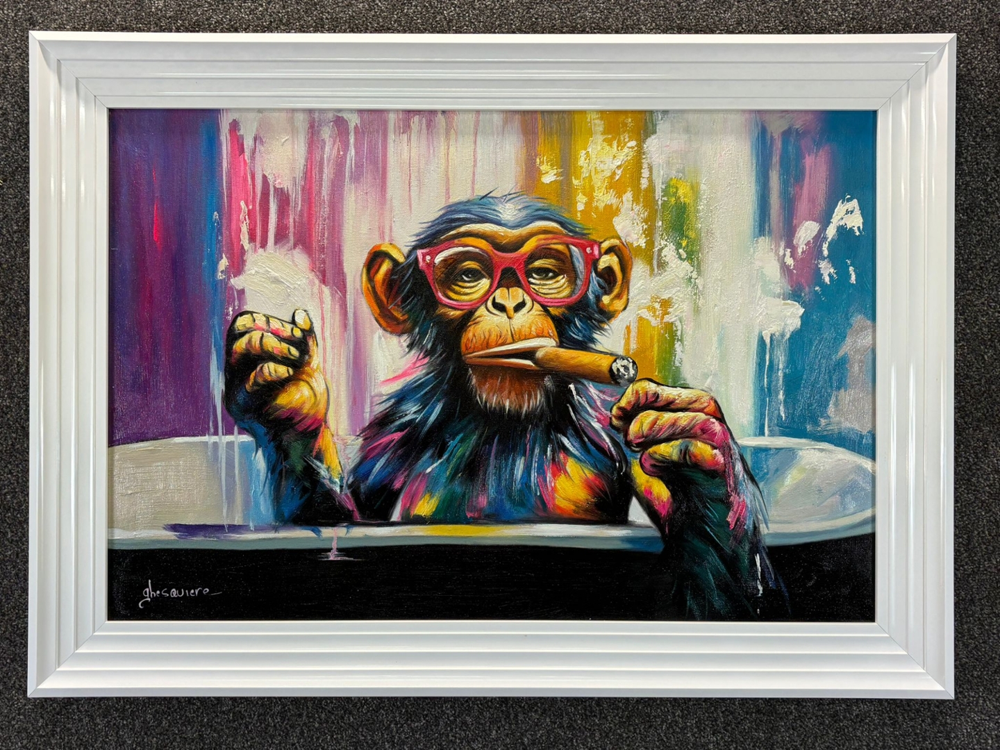 An original oil painting by the artist Ghesquiere, titled Le Bain de Monsieur Singe, is a playful and captivating piece bursting with colour and character. Measuring 60cm x 90cm, the artwork showcases a cheeky chimpanzee relaxing in a bath, confidently holding a cigar and wearing bold red glasses — a humorous yet sophisticated portrayal that instantly captures attention.
