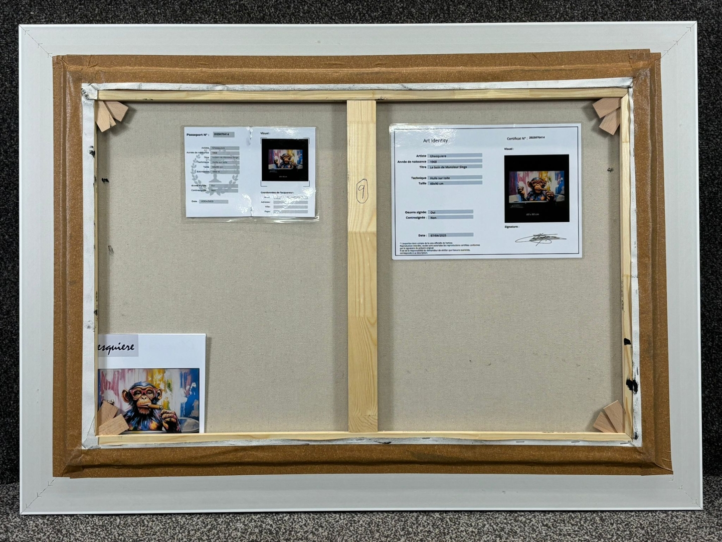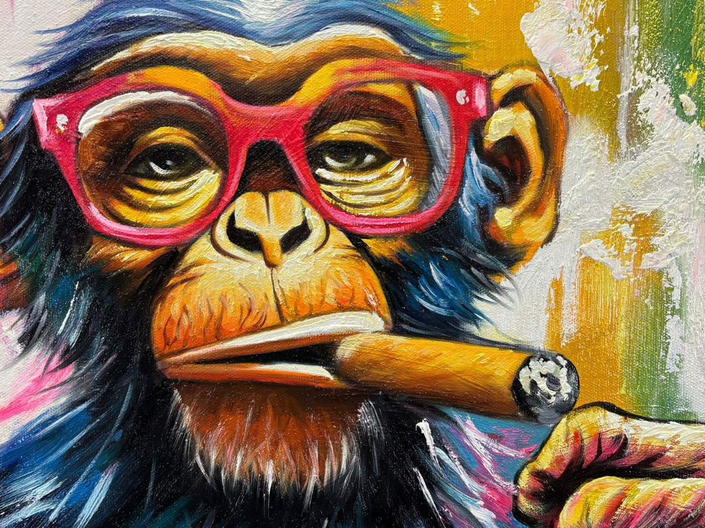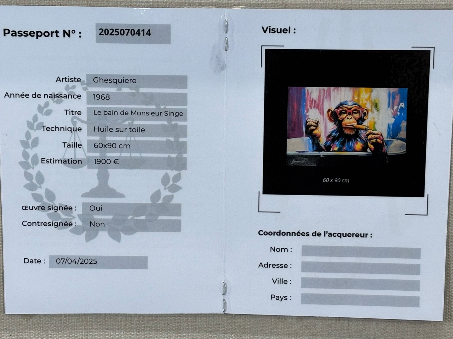 An original oil painting by the artist Ghesquiere, titled Le Bain de Monsieur Singe, is a playful and captivating piece bursting with colour and character. Measuring 60cm x 90cm, the artwork showcases a cheeky chimpanzee relaxing in a bath, confidently holding a cigar and wearing bold red glasses — a humorous yet sophisticated portrayal that instantly captures attention.