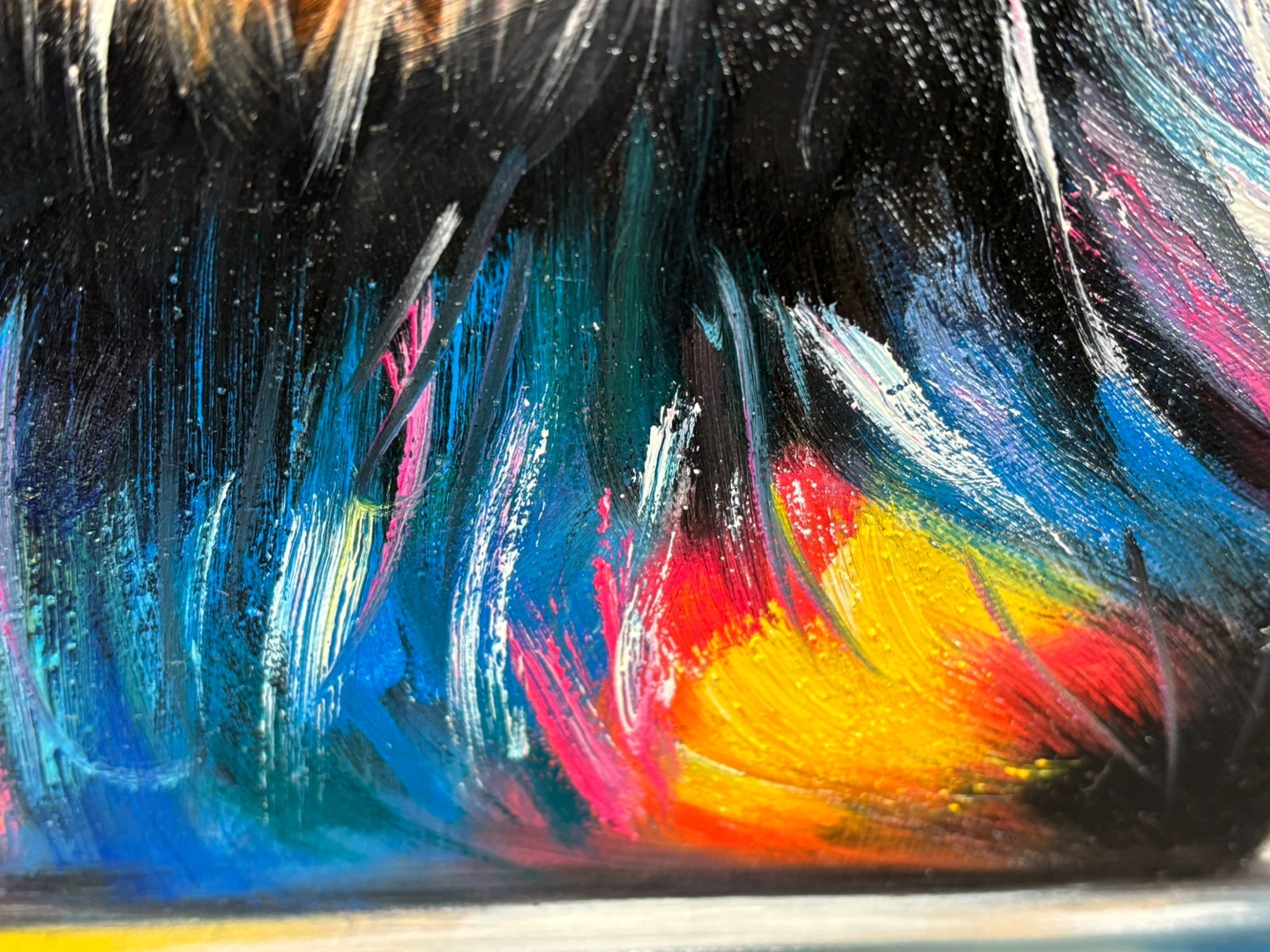 Ghesquiere’s use of vivid tones and expressive brushwork creates a dynamic contrast between the lively subject and the abstract background. Streaks of pink, yellow, blue, and white cascade behind the figure, adding energy and depth while emphasising the whimsical charm of the composition. Every stroke reflects the artist’s flair for blending humour with high-art elegance.