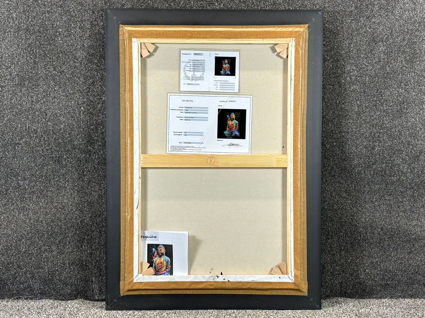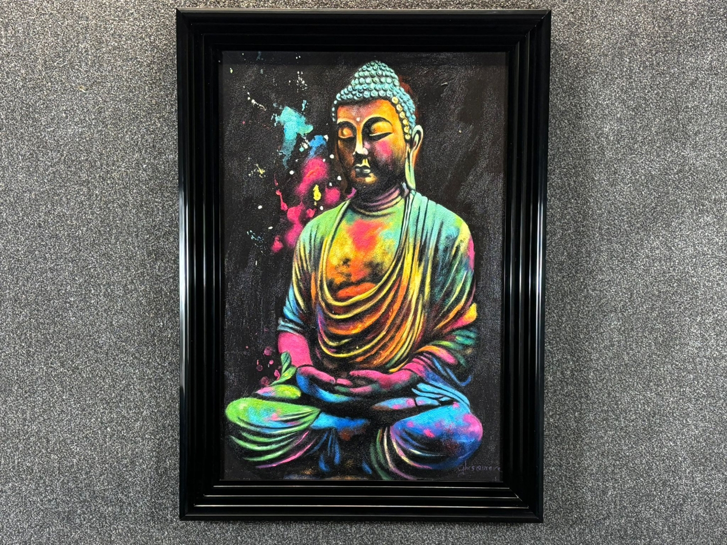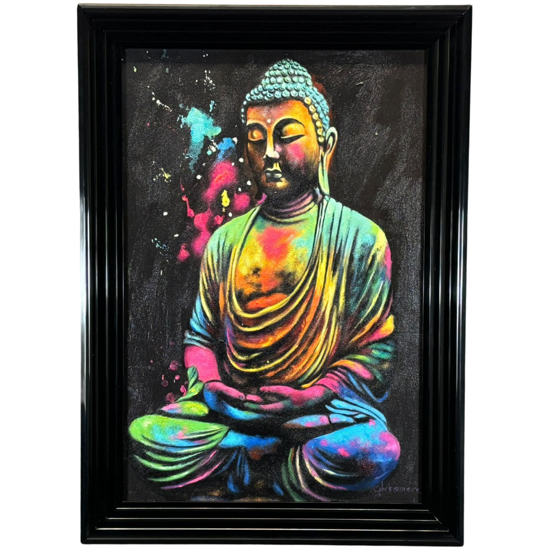 Presented in a sleek black frame and valued at €1900, Méditation Colorée is both a statement of artistic brilliance and a celebration of spiritual tranquillity — a captivating centrepiece for any modern interior.