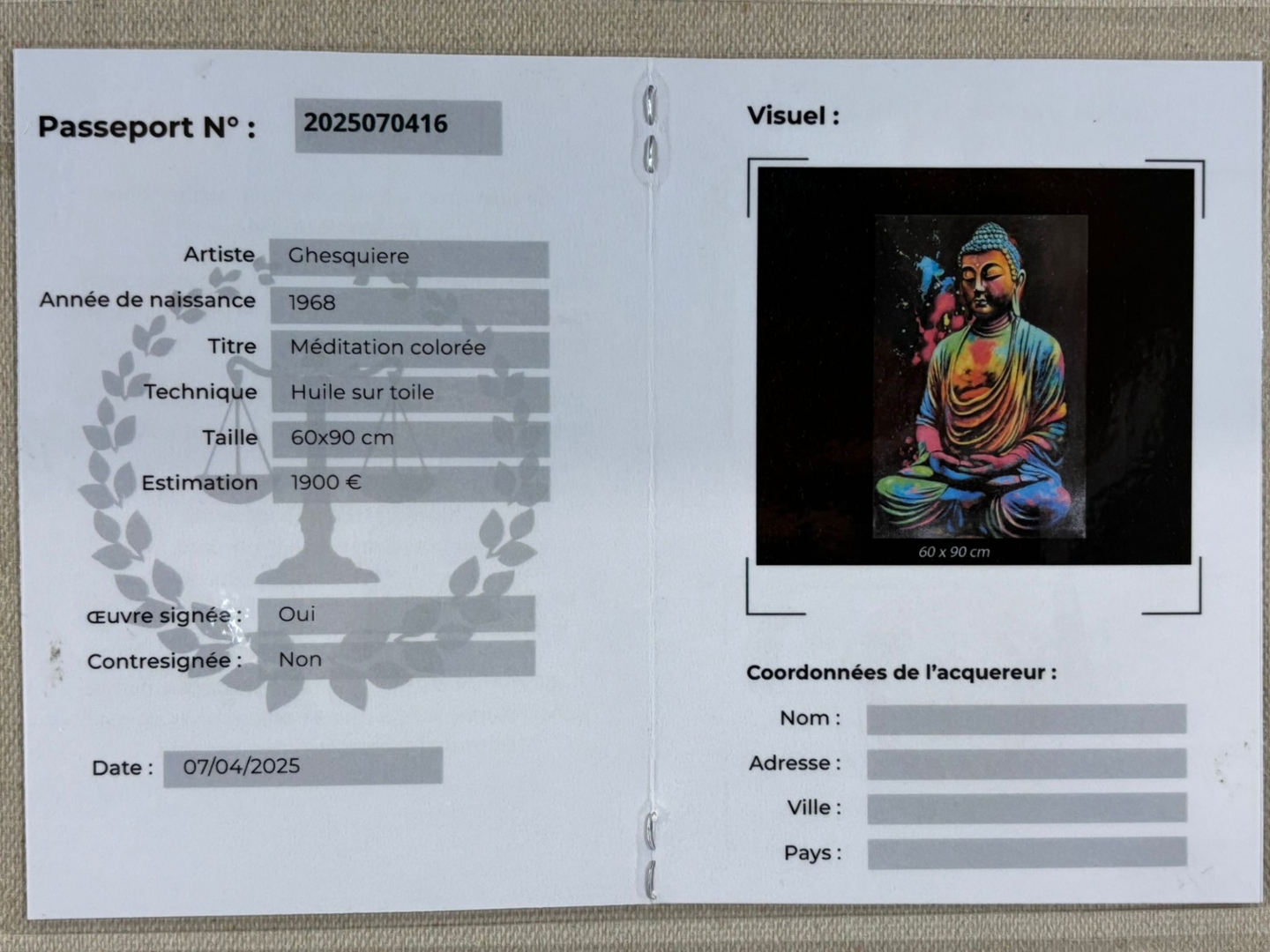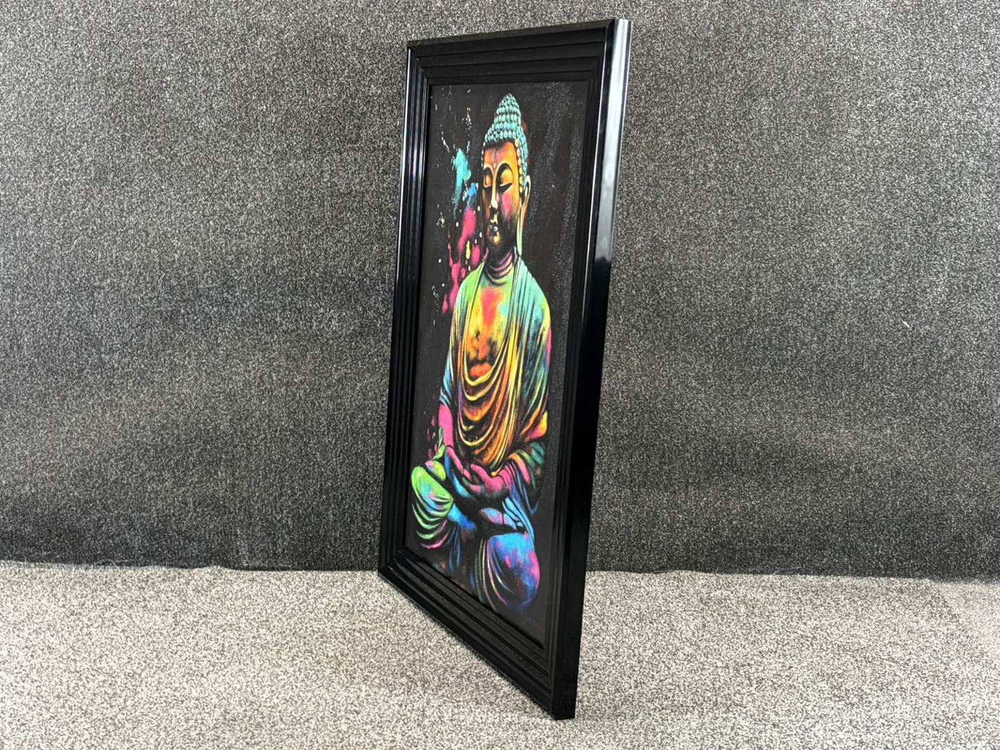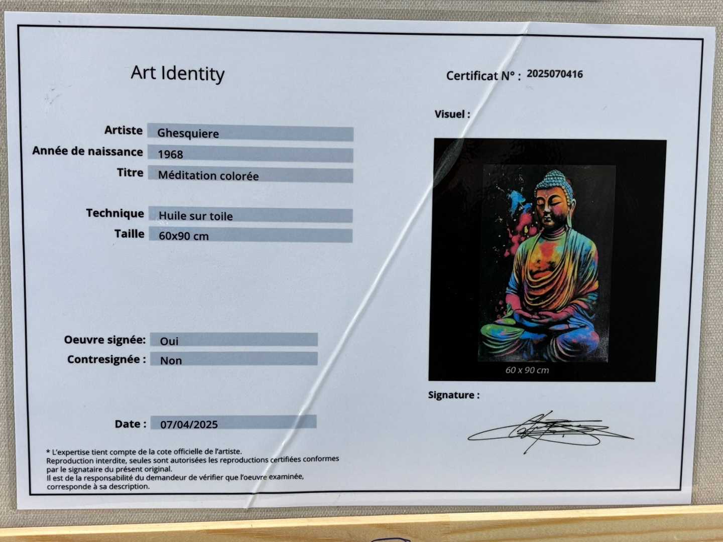 Presented in a sleek black frame and valued at €1900, Méditation Colorée is both a statement of artistic brilliance and a celebration of spiritual tranquillity — a captivating centrepiece for any modern interior.