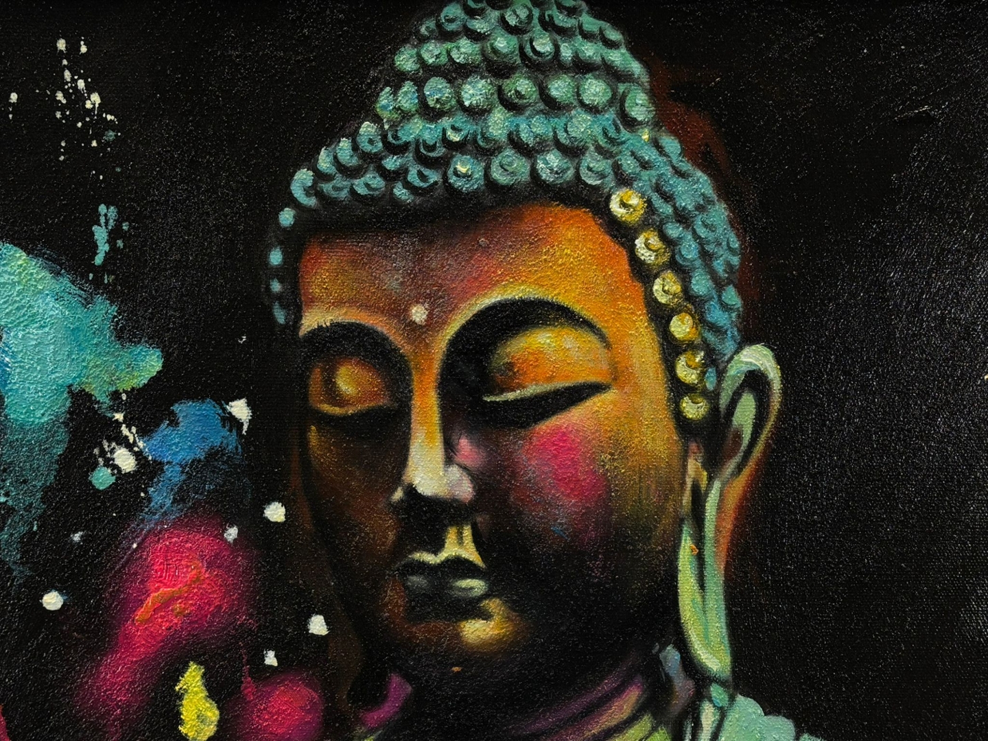 An original oil painting by the artist Ghesquiere, titled Méditation Colorée, captures the serene essence of Buddha through a breathtaking explosion of colour and light. Measuring 90cm x 60cm, the piece portrays a seated Buddha in deep meditation, surrounded by an ethereal backdrop of vivid hues and abstract splashes that evoke peace, enlightenment, and balance.