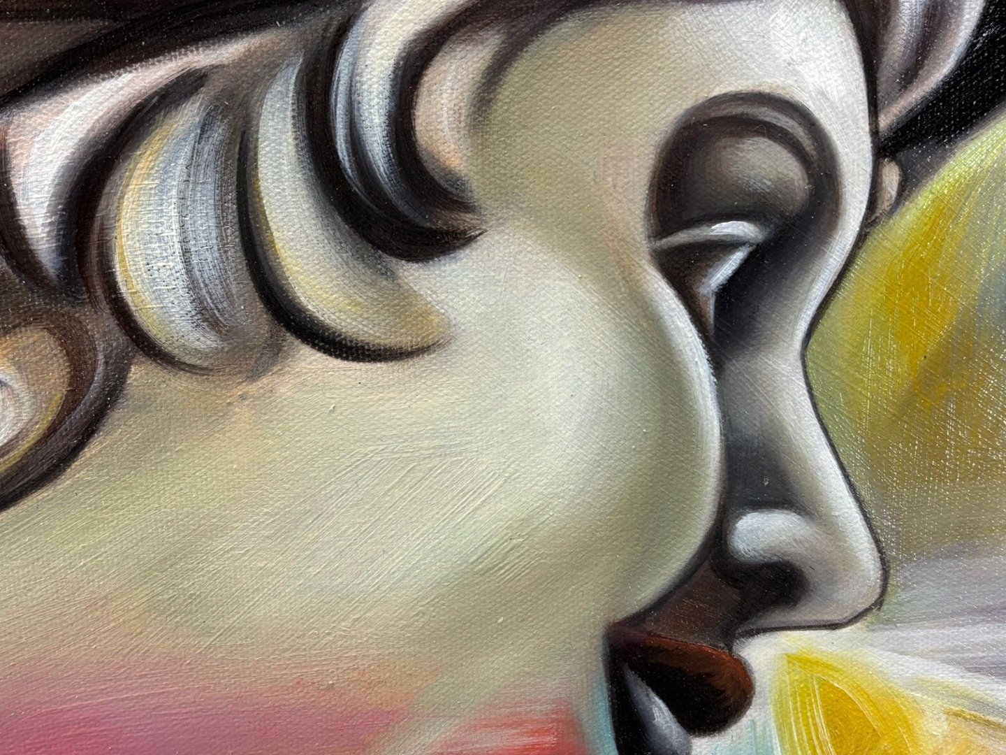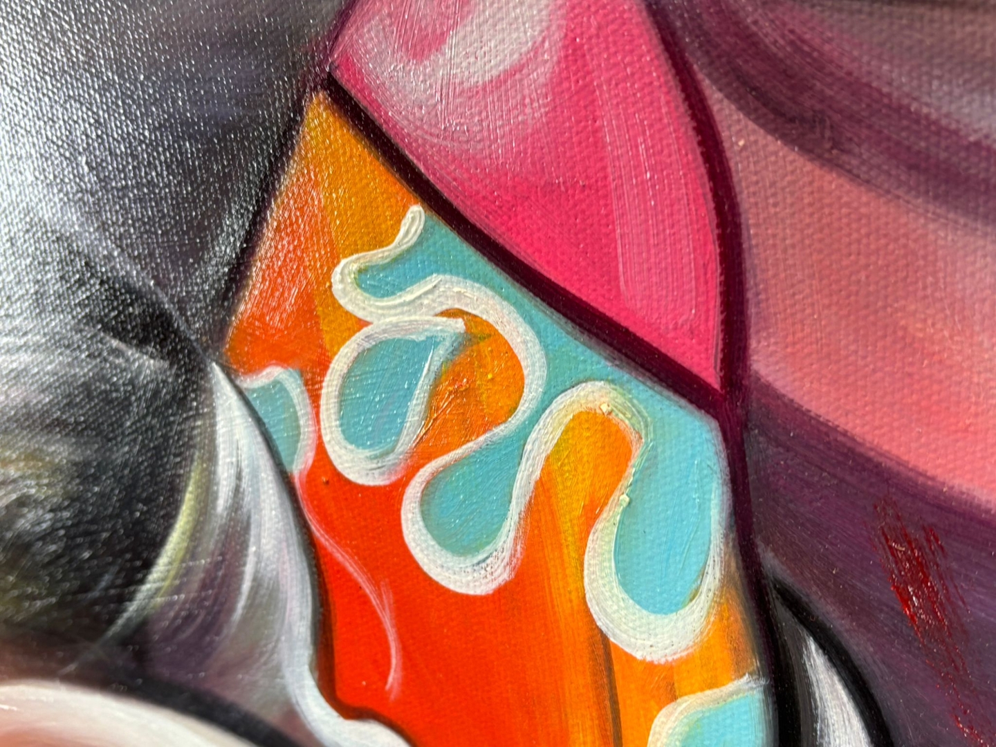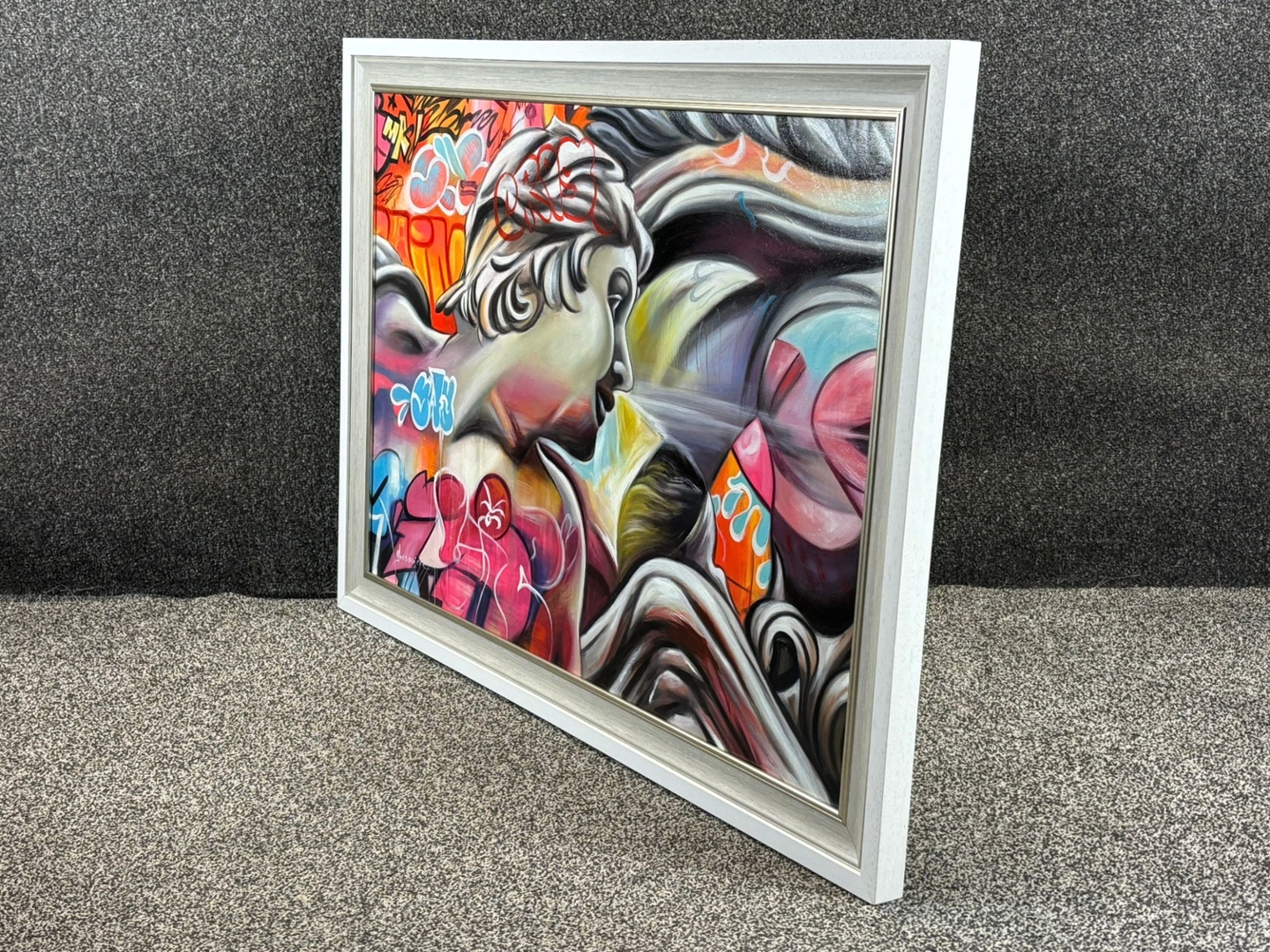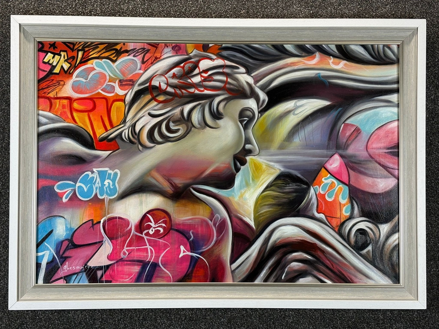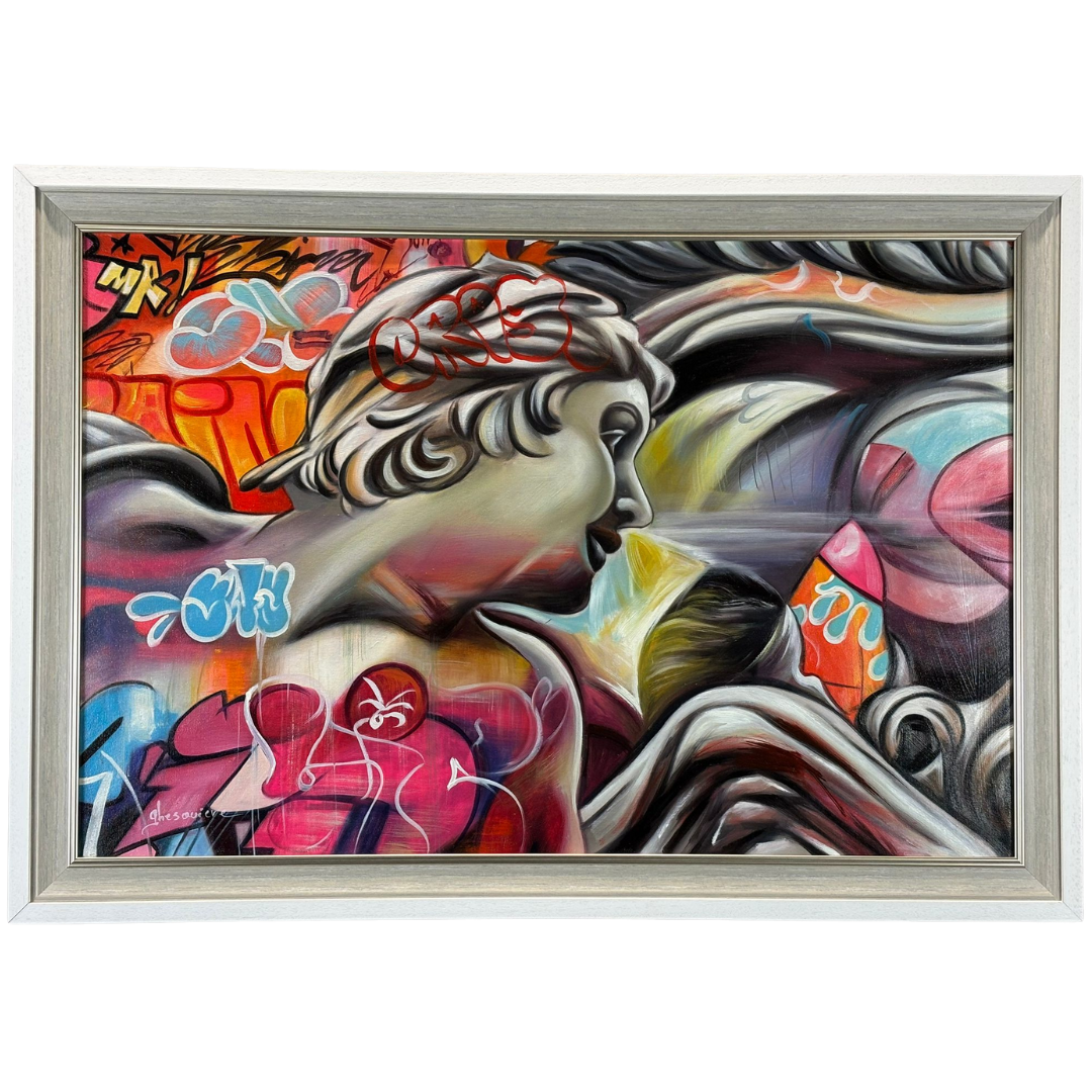 Ghesquiere’s exceptional technique brings texture, depth, and fluidity to the canvas. The sculptural form, rendered in soft tones and precise detailing, stands out against a dynamic backdrop of vivid reds, oranges, and blues layered with graffiti tags and abstract forms. This visual contrast reflects the collision of old-world elegance and contemporary energy, giving the piece a timeless yet edgy appeal.