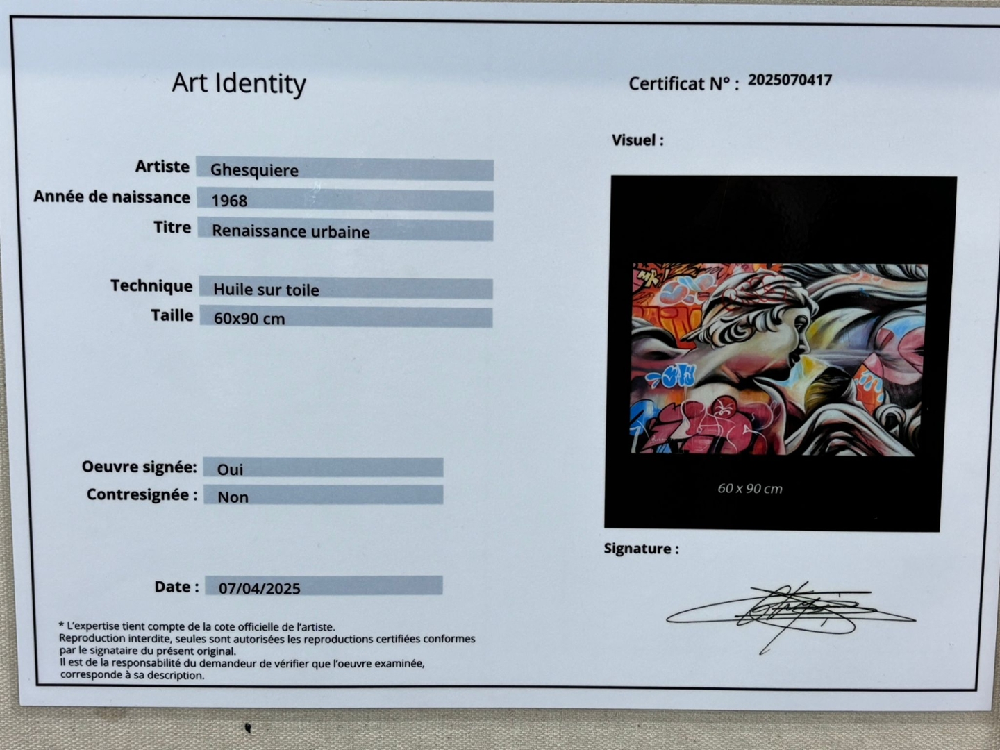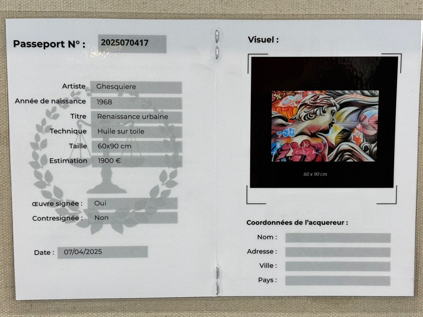 An original oil painting by the artist Ghesquiere, titled Renaissance Urbaine, masterfully fuses classical art with modern street culture. Measuring 60cm x 90cm, the composition juxtaposes the grace of Renaissance sculpture with the raw vibrancy of urban graffiti, creating a dialogue between tradition and rebellion. The result is a bold, thought-provoking piece that celebrates the evolution of artistic expression.