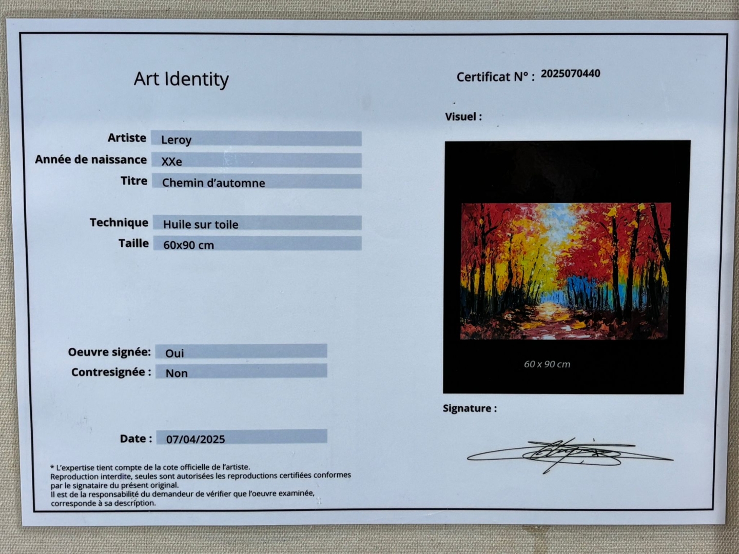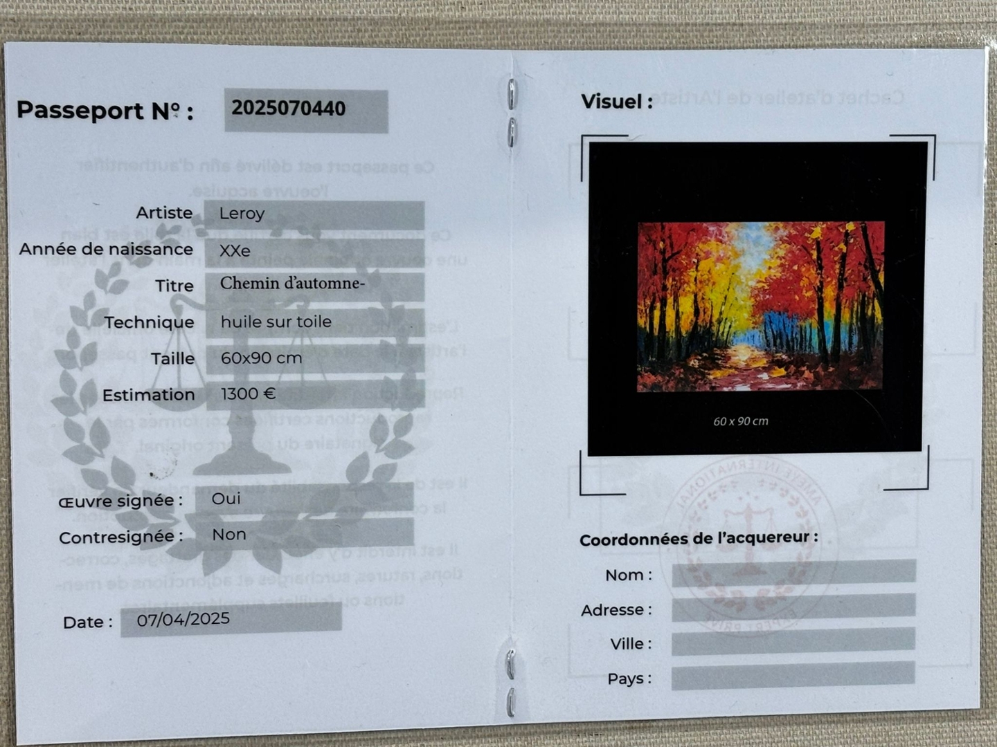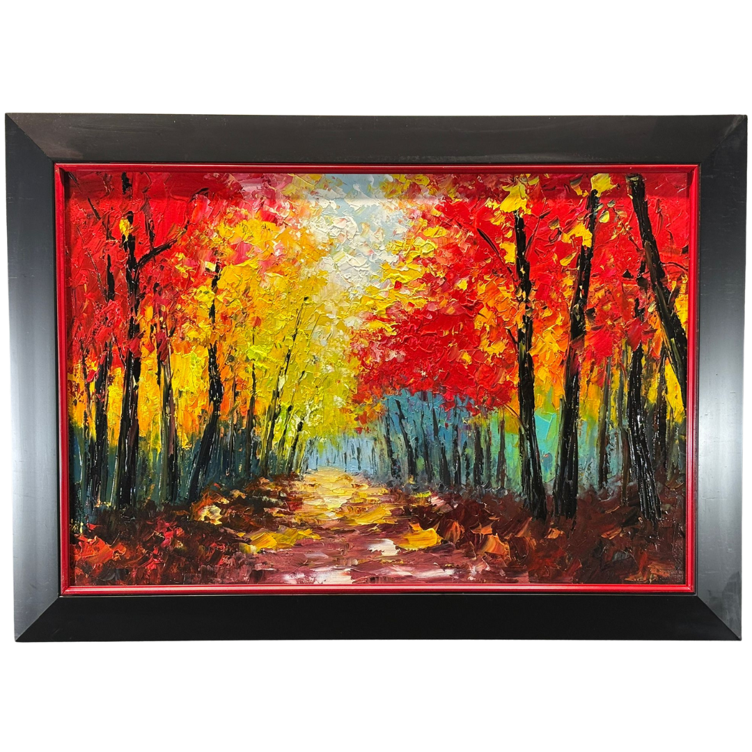 An original oil painting by the artist Leroy, titled Chemin d’Automne, captures the breathtaking beauty of a forest bathed in the vibrant colours of fall. Measuring 60cm x 90cm, the scene draws the viewer into a golden pathway lined with fiery red, amber, and yellow trees — a glowing celebration of nature’s seasonal transformation.