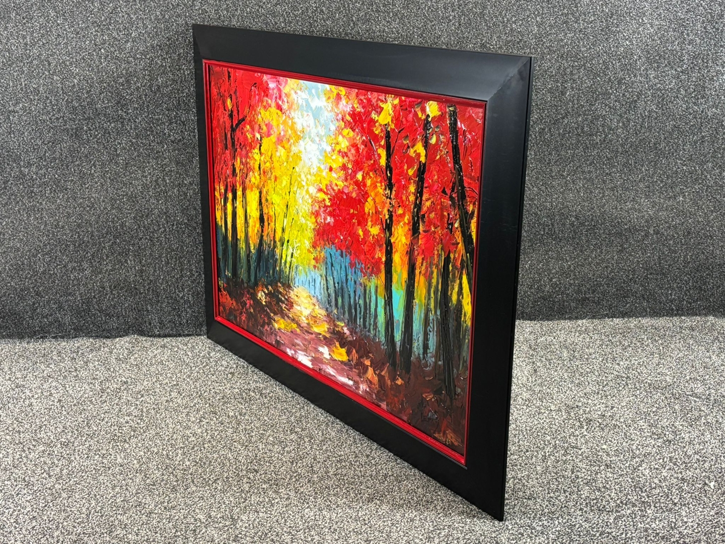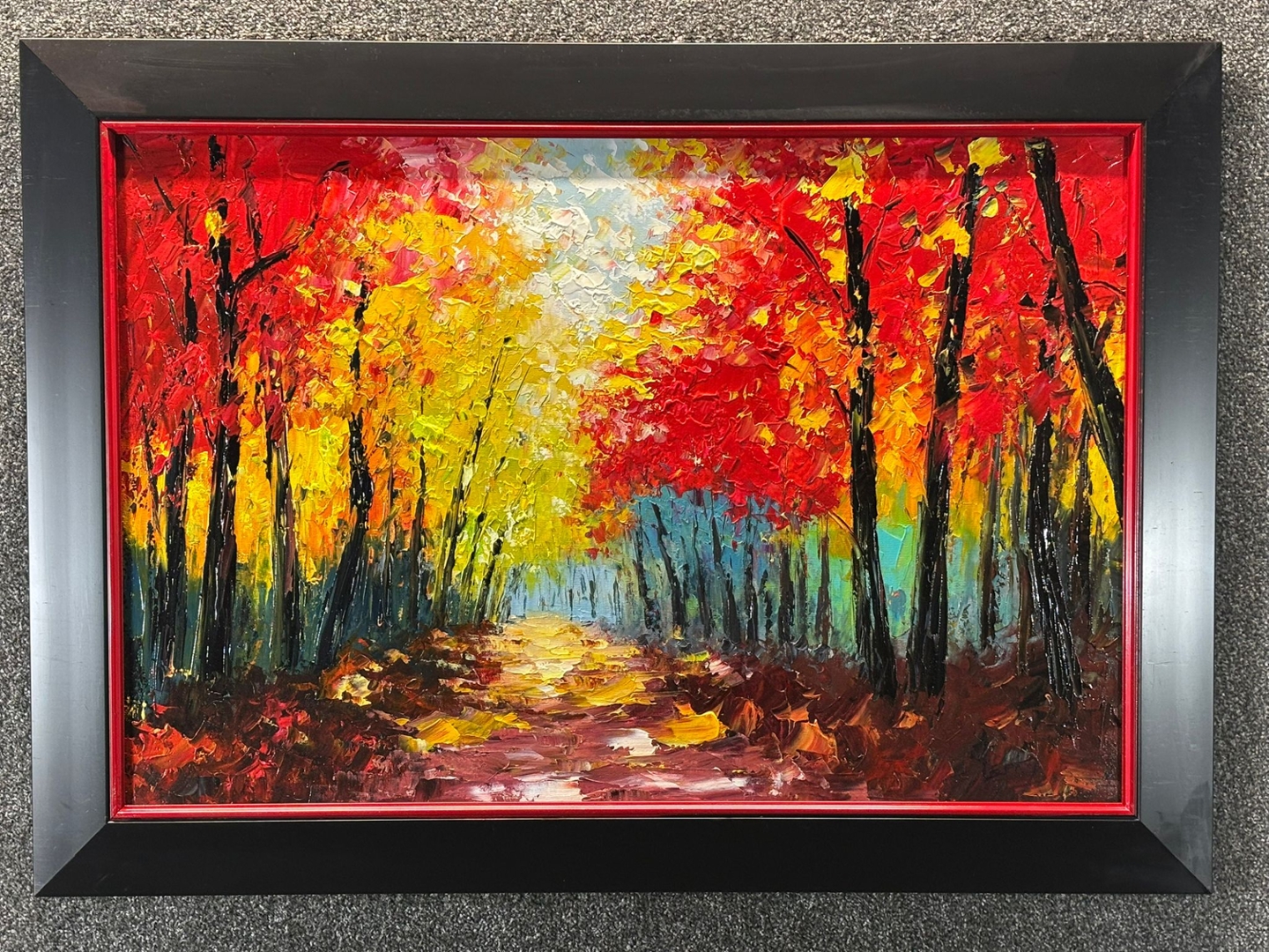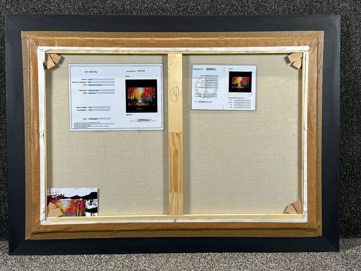 A black framed original oil painting by the artist Leroy titled Chemin D'automne.