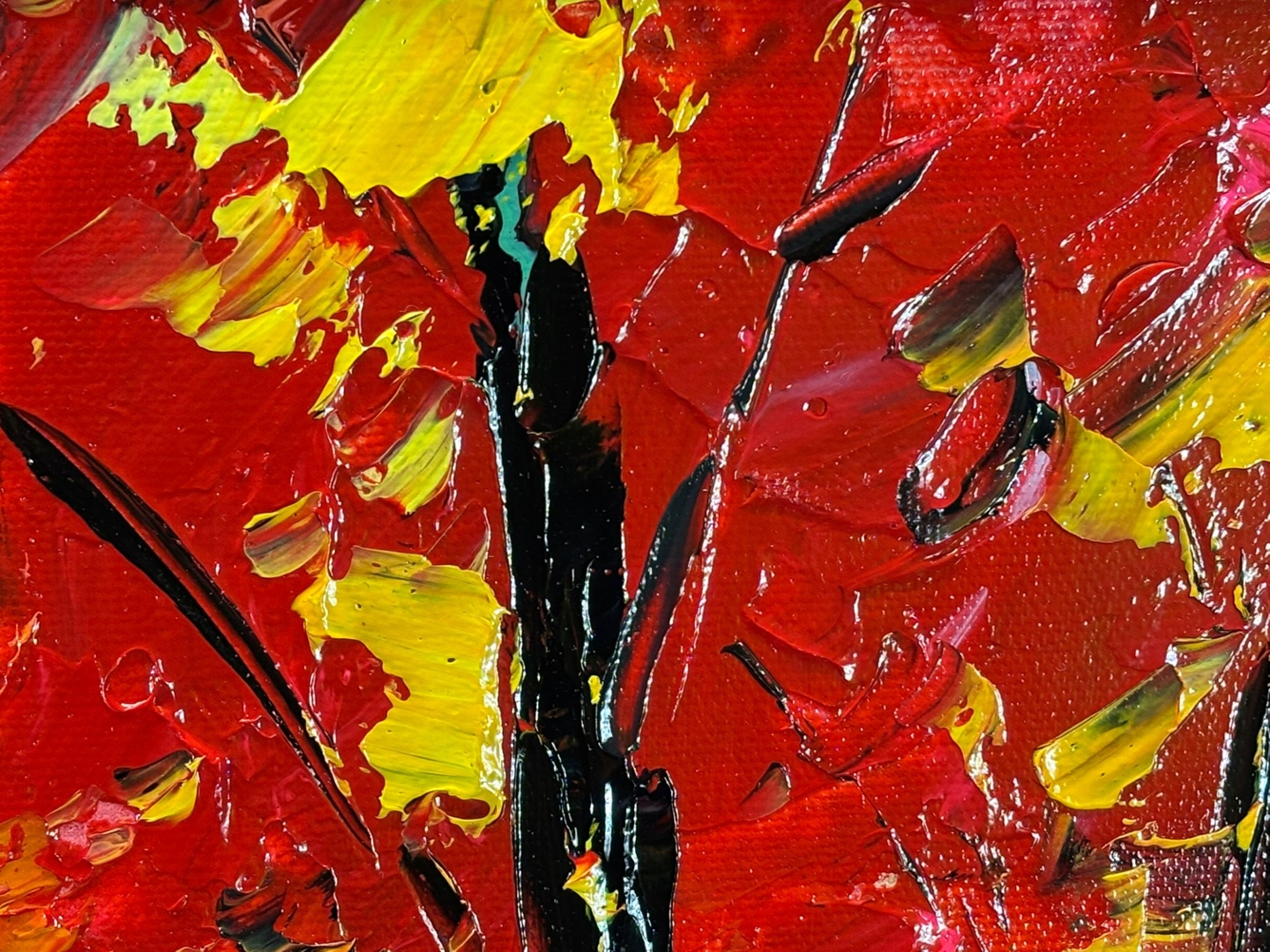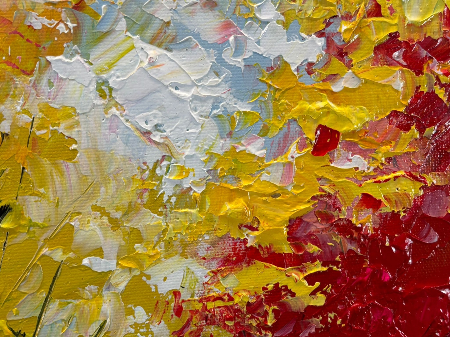 Leroy’s distinctive impasto technique brings rich texture and depth to the canvas, with thick, expressive brushstrokes that make the leaves almost shimmer under the light. The interplay of warm and cool tones — from the blazing canopy above to the gentle blue mist in the distance — creates a perfect balance of vibrancy and tranquillity. Each detail evokes the crisp air and quiet wonder of an autumn walk.