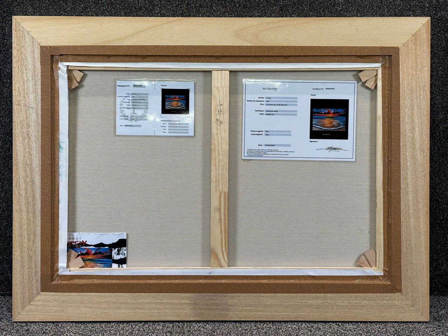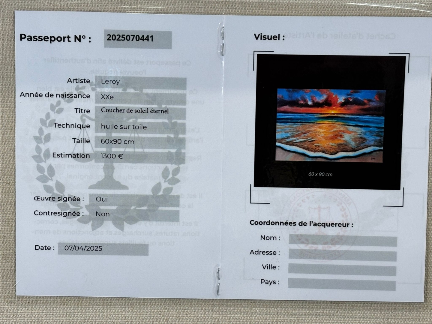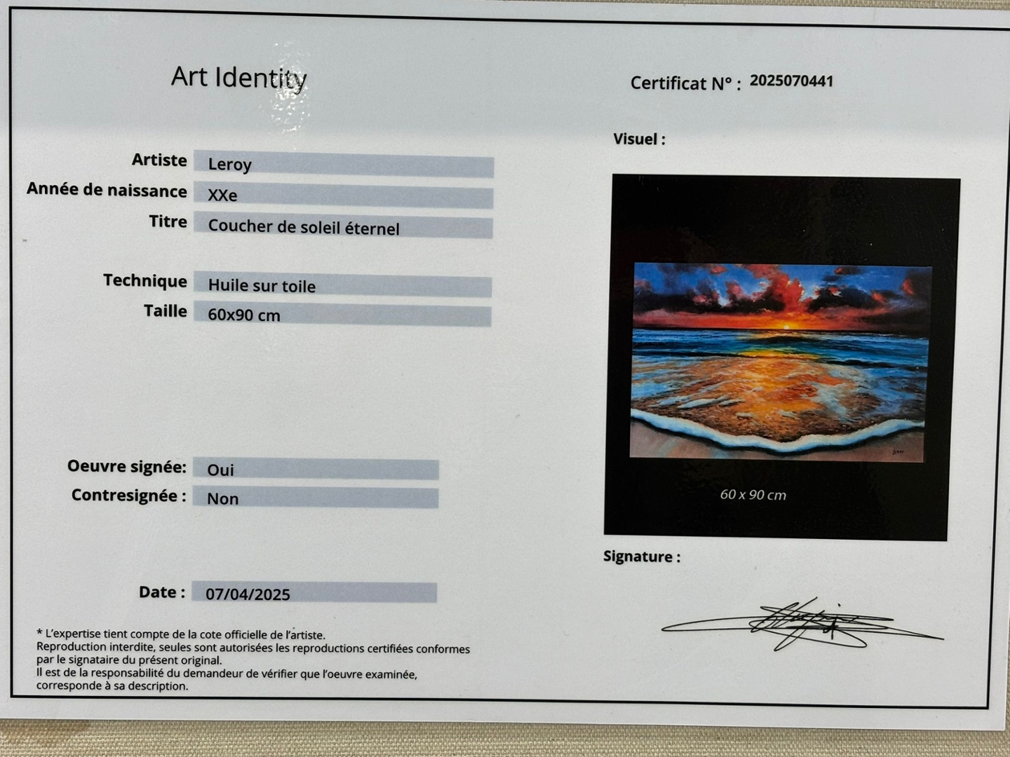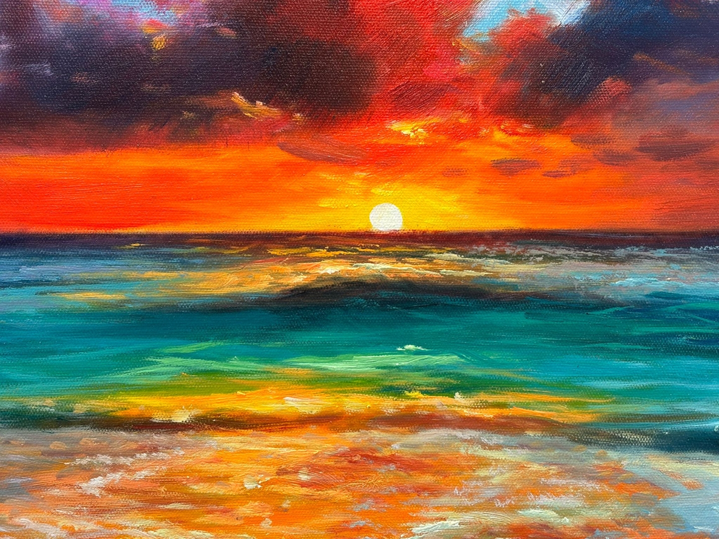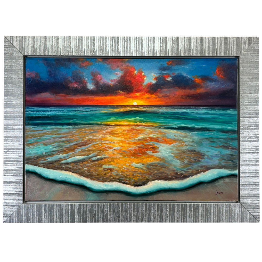 An original oil painting by the artist Leroy, titled Coucher de Soleil Eternel, beautifully captures the timeless allure of a sunset over the ocean. Measuring 60cm x 90cm, the piece radiates with colour and emotion, drawing the viewer into a moment of serenity as the golden sun melts into the horizon. The warm hues of red, orange, and gold dance across the water’s surface, blending harmoniously with the cool turquoise waves that gently meet the shore.