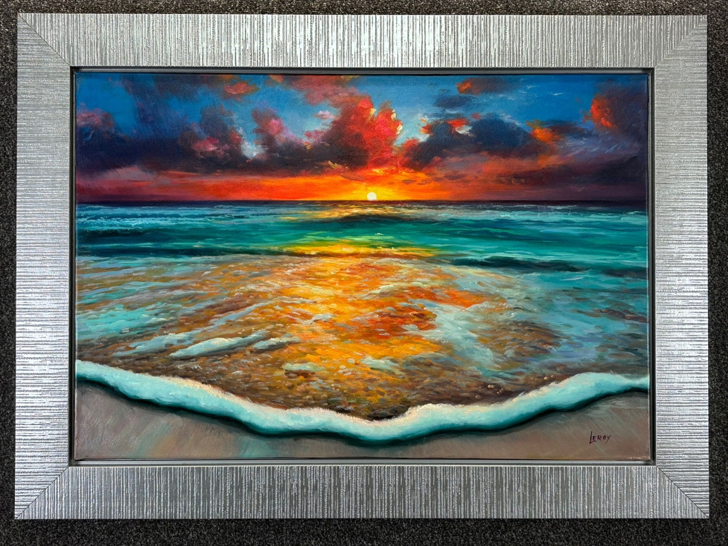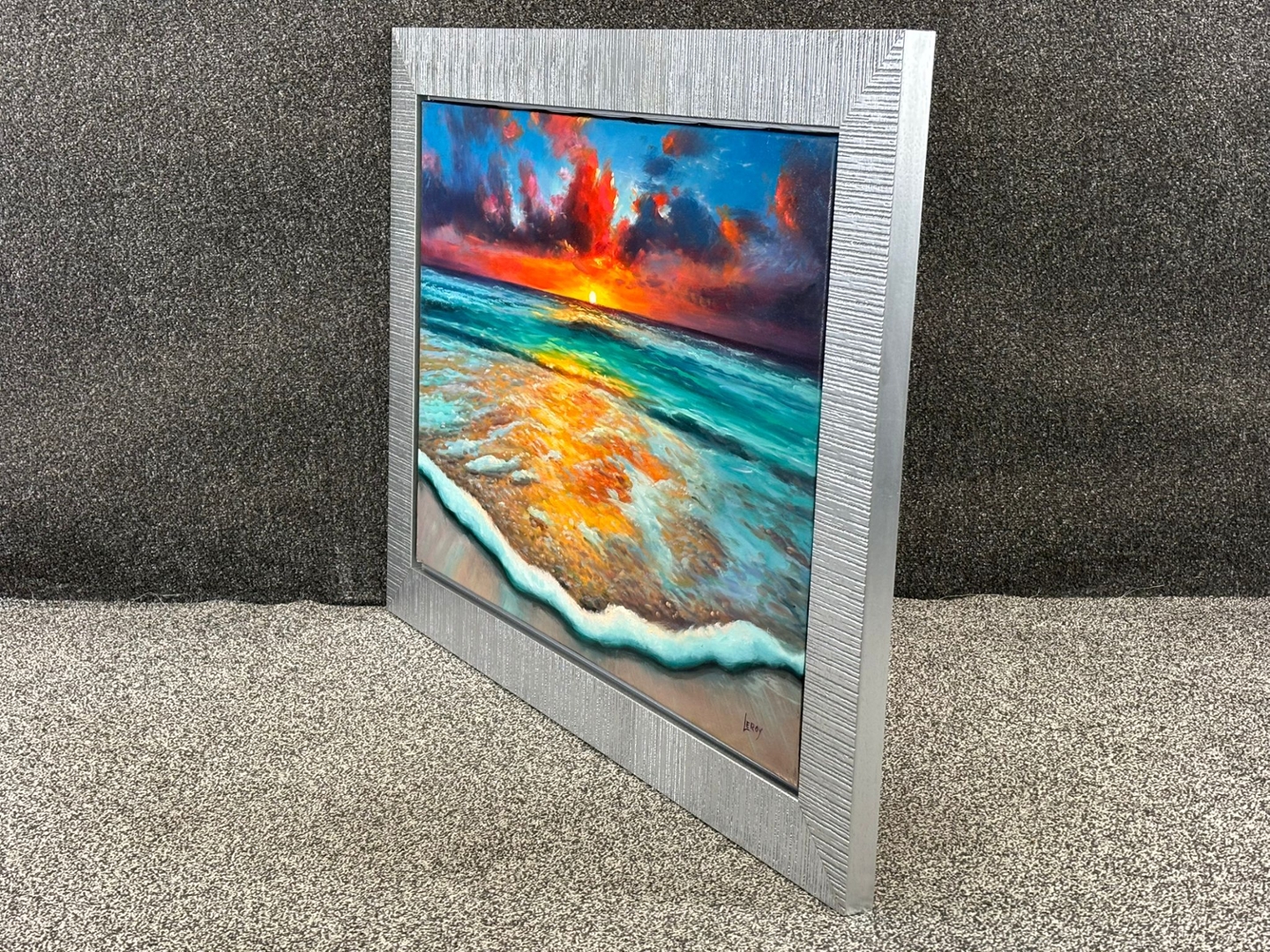 A silver framed original oil painting by the artist Leroy titled Coucher de Soleil Eternel.