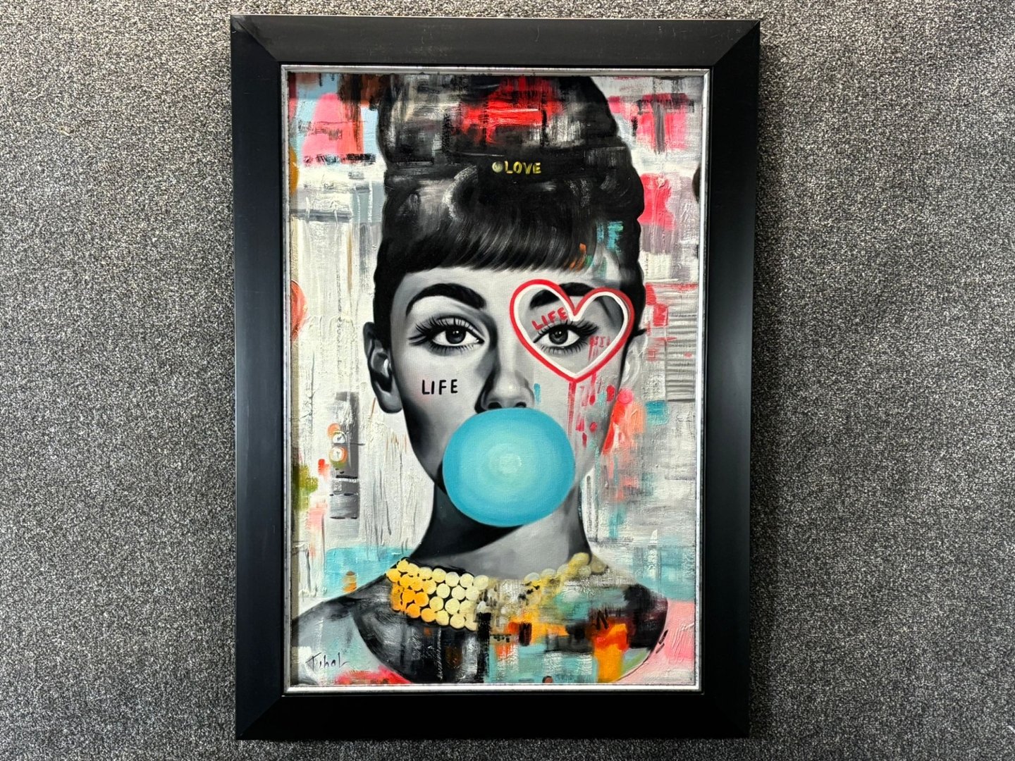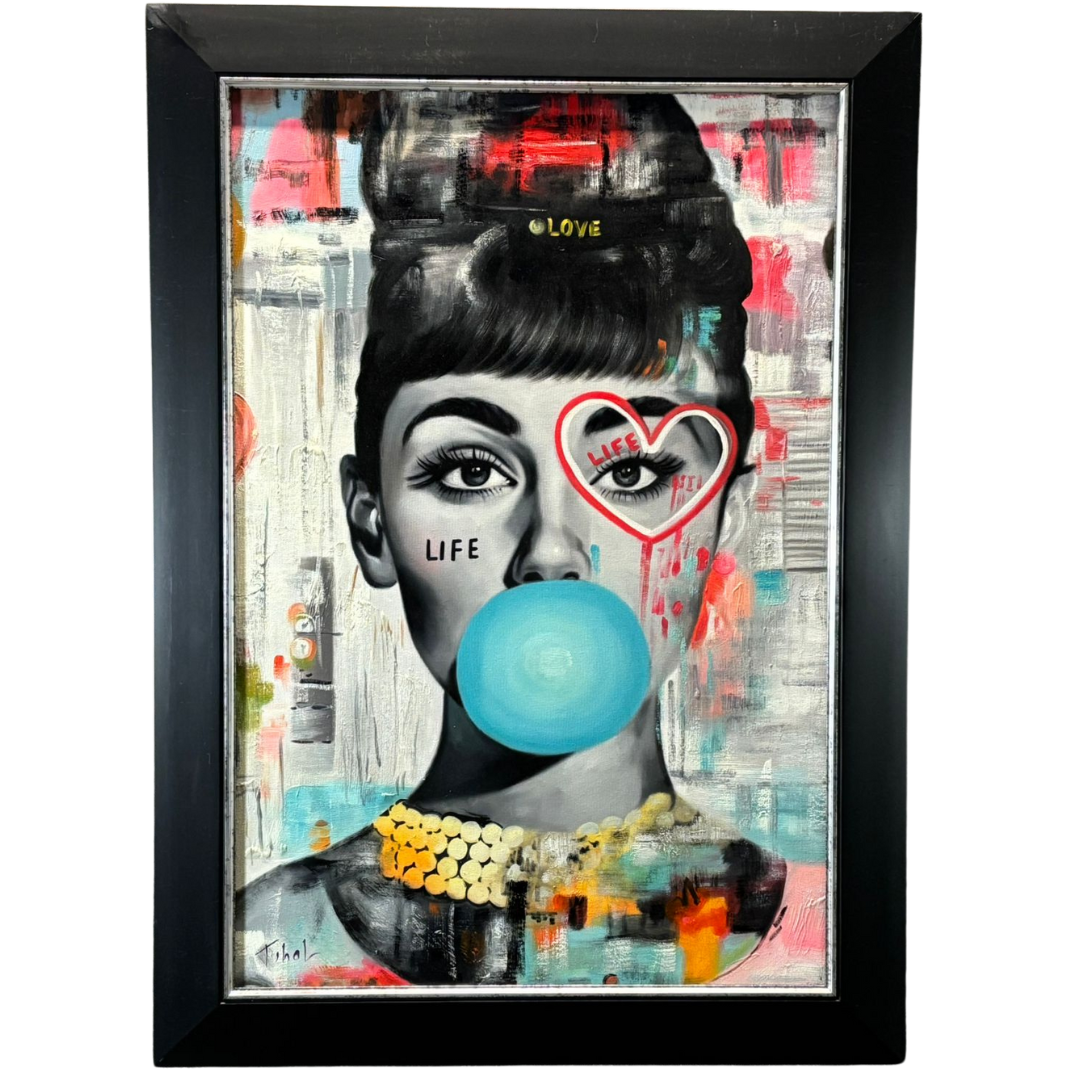 An original oil painting by the artist Tuhal, titled Audrey Pop, reimagines a timeless icon through a bold lens of contemporary pop art. Measuring 90cm x 60cm, the piece features the unmistakable elegance of Audrey Hepburn, reinterpreted with a playful twist — blowing a bright blue bubble against a monochrome backdrop that blends classic beauty with urban vibrancy.