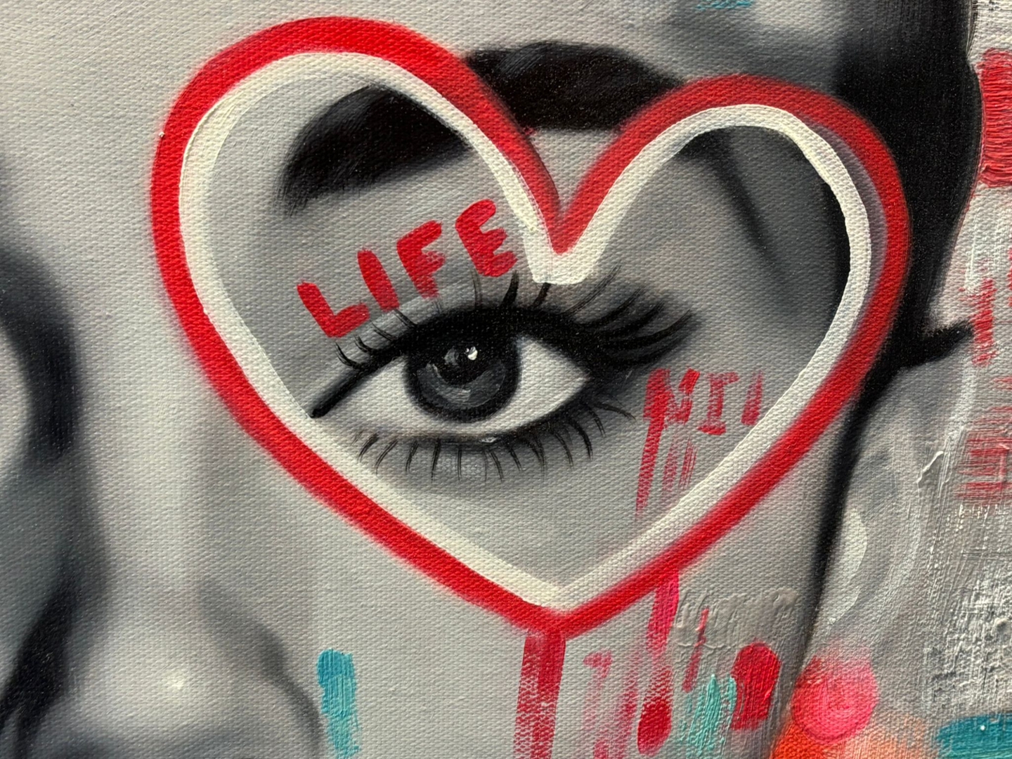 Tuhal’s dynamic composition fuses fine art sophistication with street art energy, using splashes of red, turquoise, and gold to break through the grayscale portrait. The words “LIFE” and “LOVE” appear across the canvas, adding layers of meaning and emotion to this modern homage. The artist’s brushwork is both precise and expressive, giving the portrait an unmistakable sense of movement and attitude.