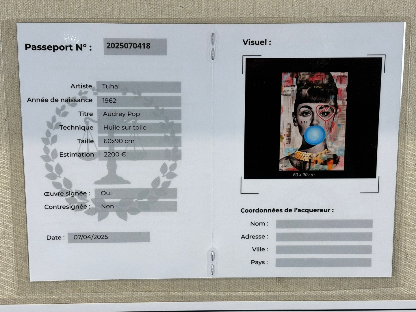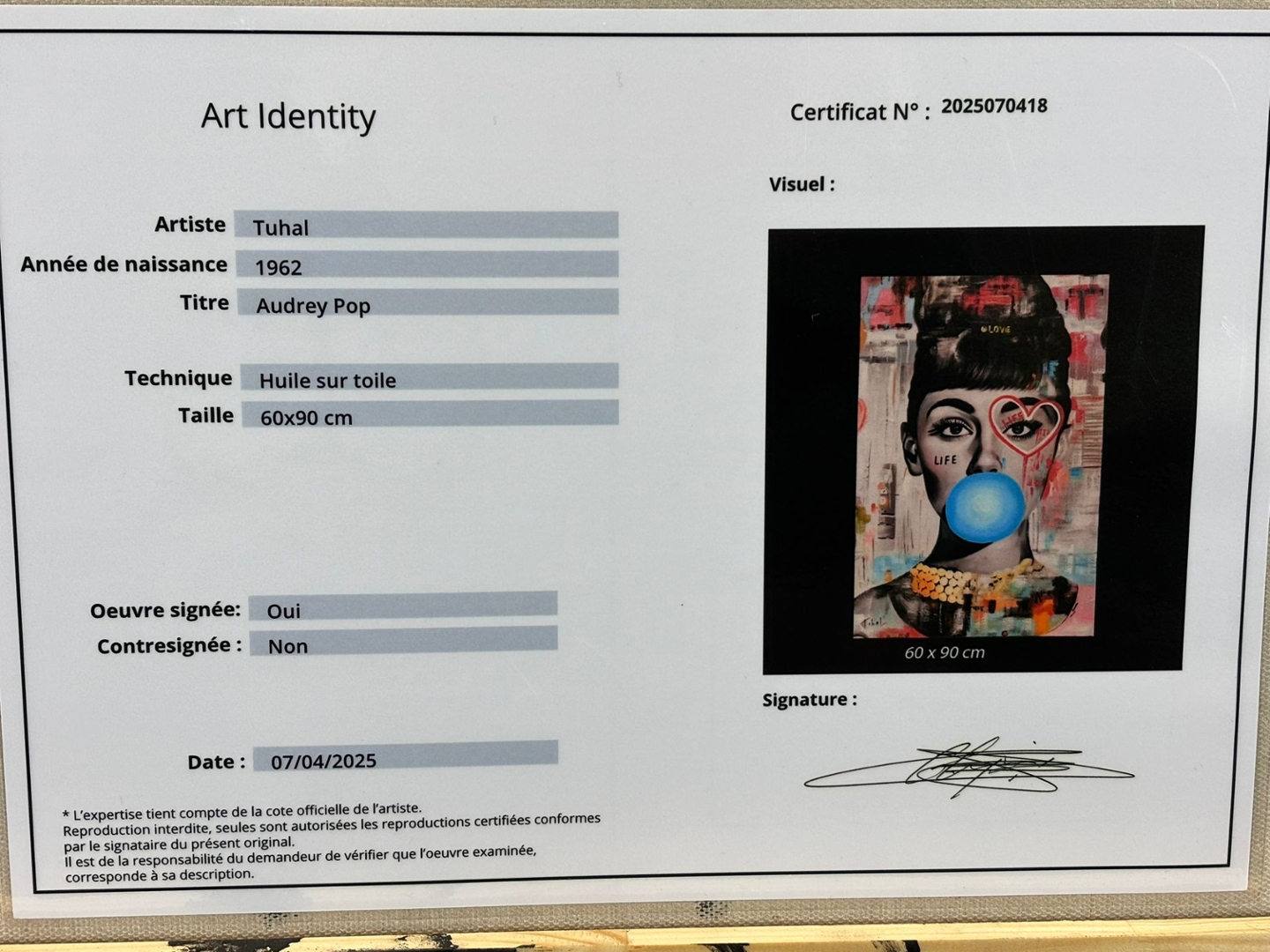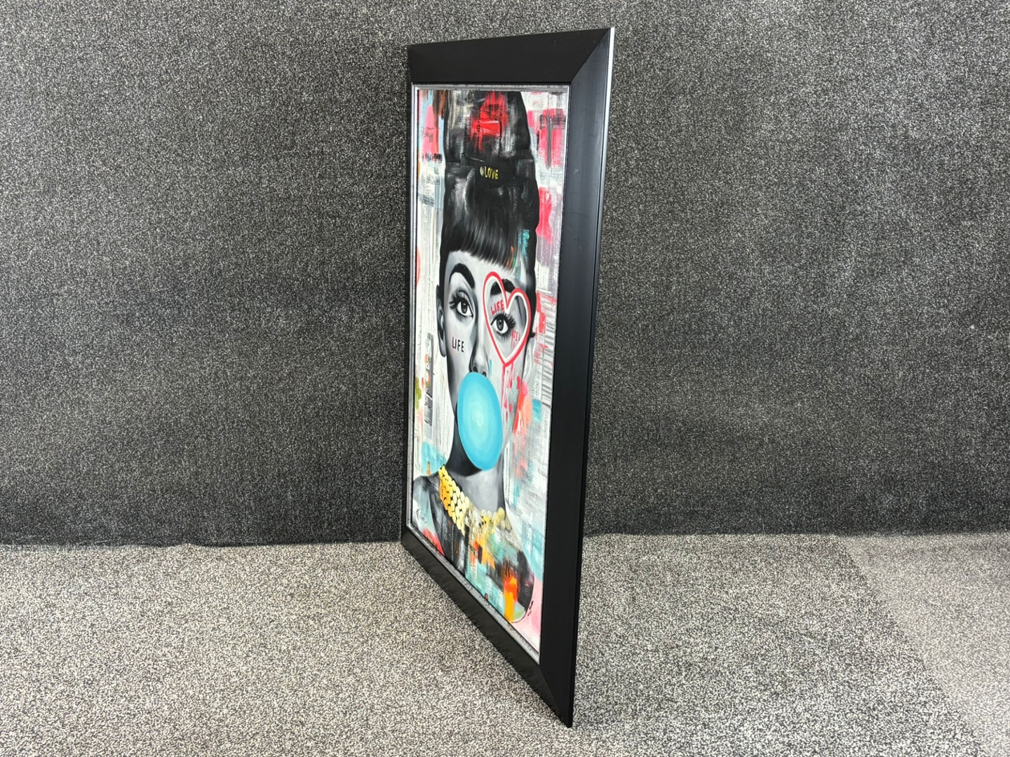 A black framed original oil painting by the artist Tuhal titled Audrey Pop.