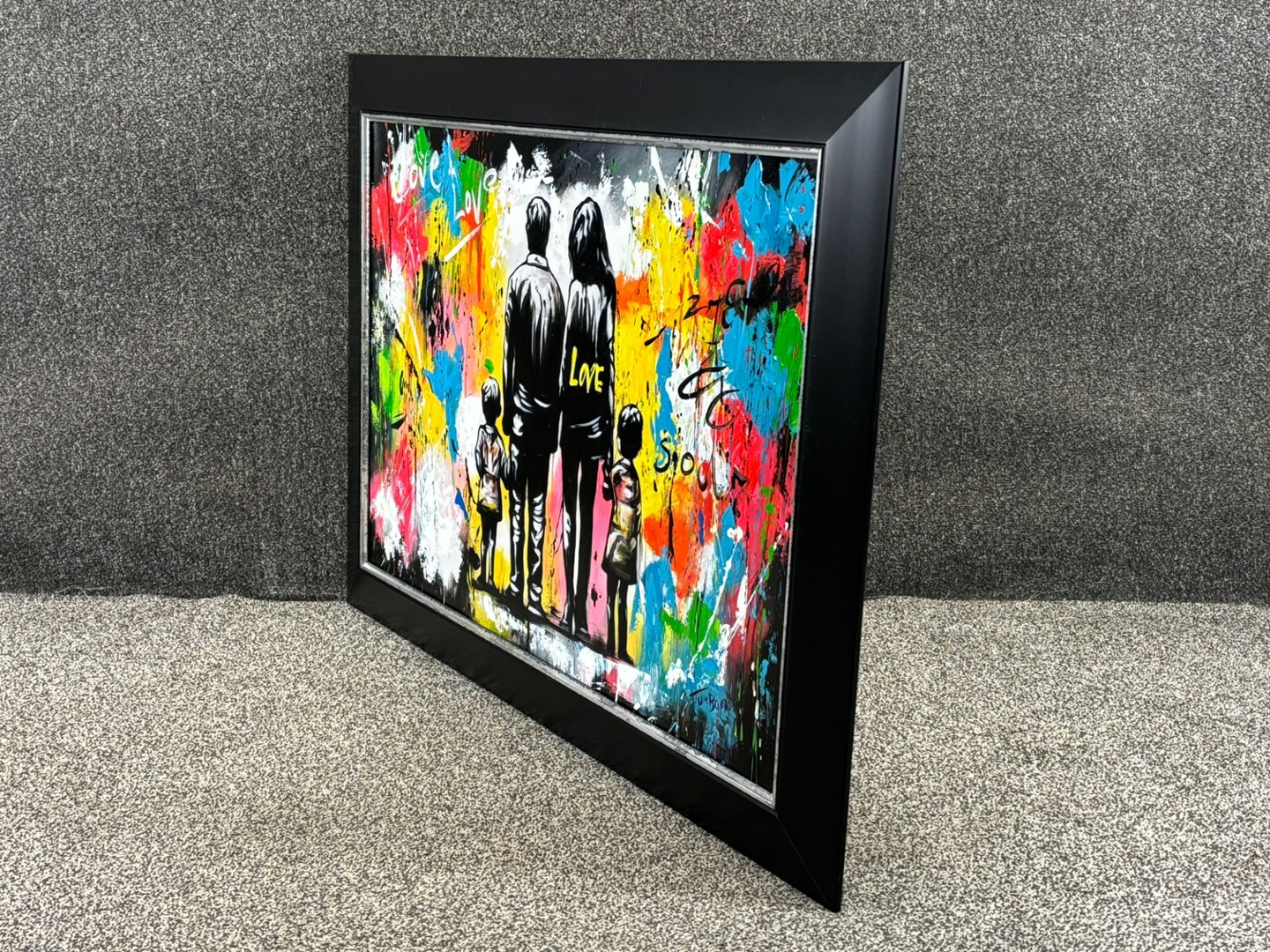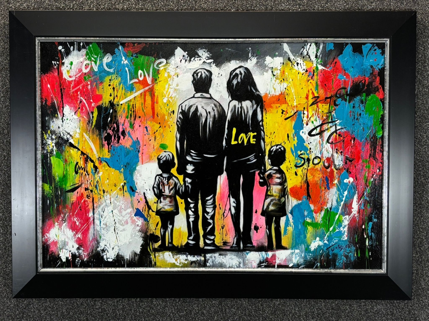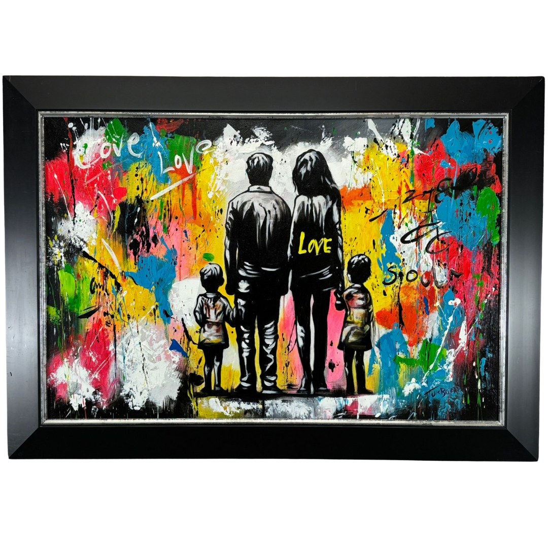 An original oil painting by the artist Turban, titled L’âme de la Famille, beautifully celebrates love, unity, and togetherness. Measuring 60cm x 90cm, the piece depicts a family of four standing hand in hand, viewed from behind, against a vivid abstract backdrop of colour and movement. The word “Love” is scattered across the canvas, reinforcing the central theme of connection and shared humanity.