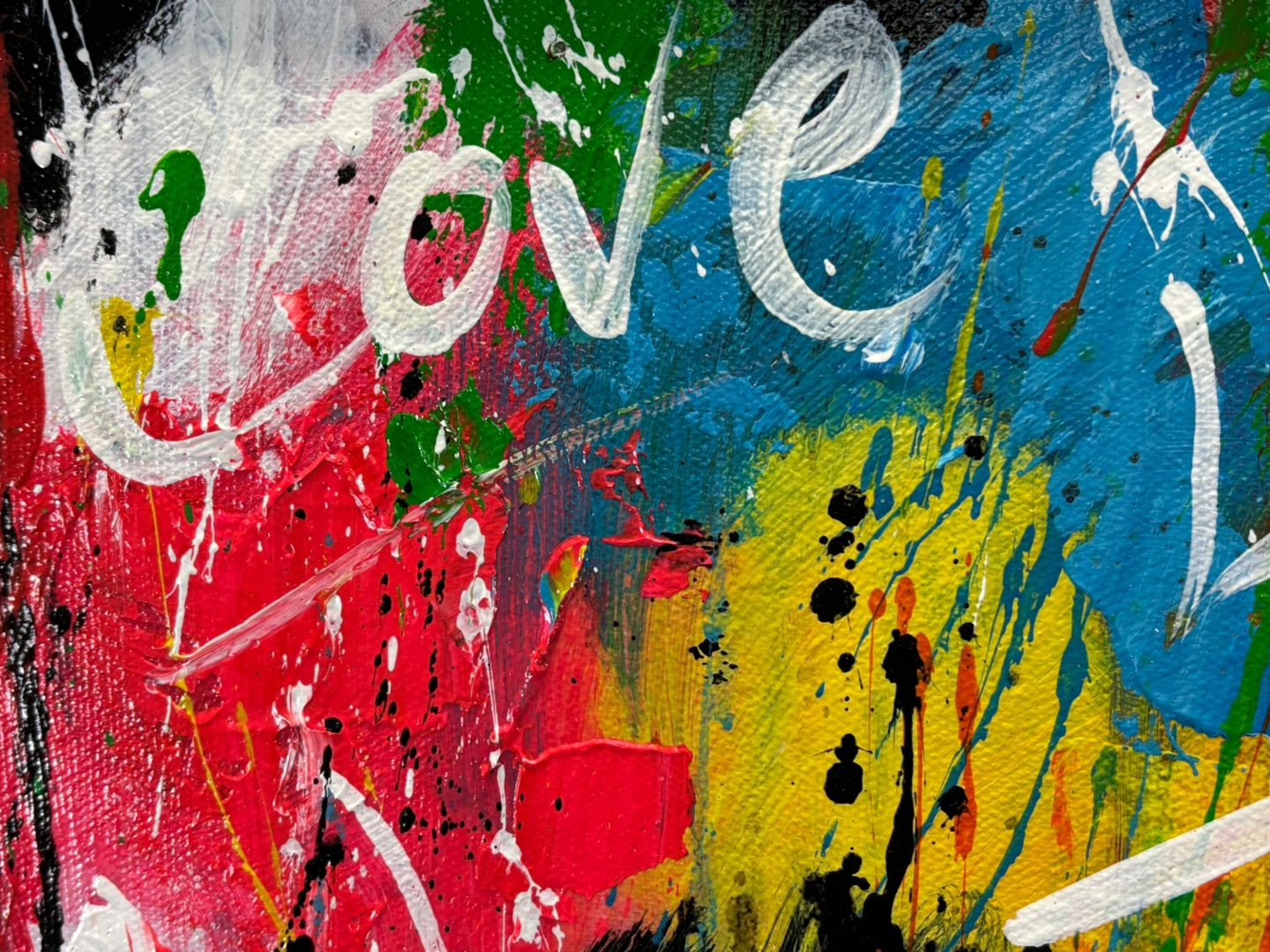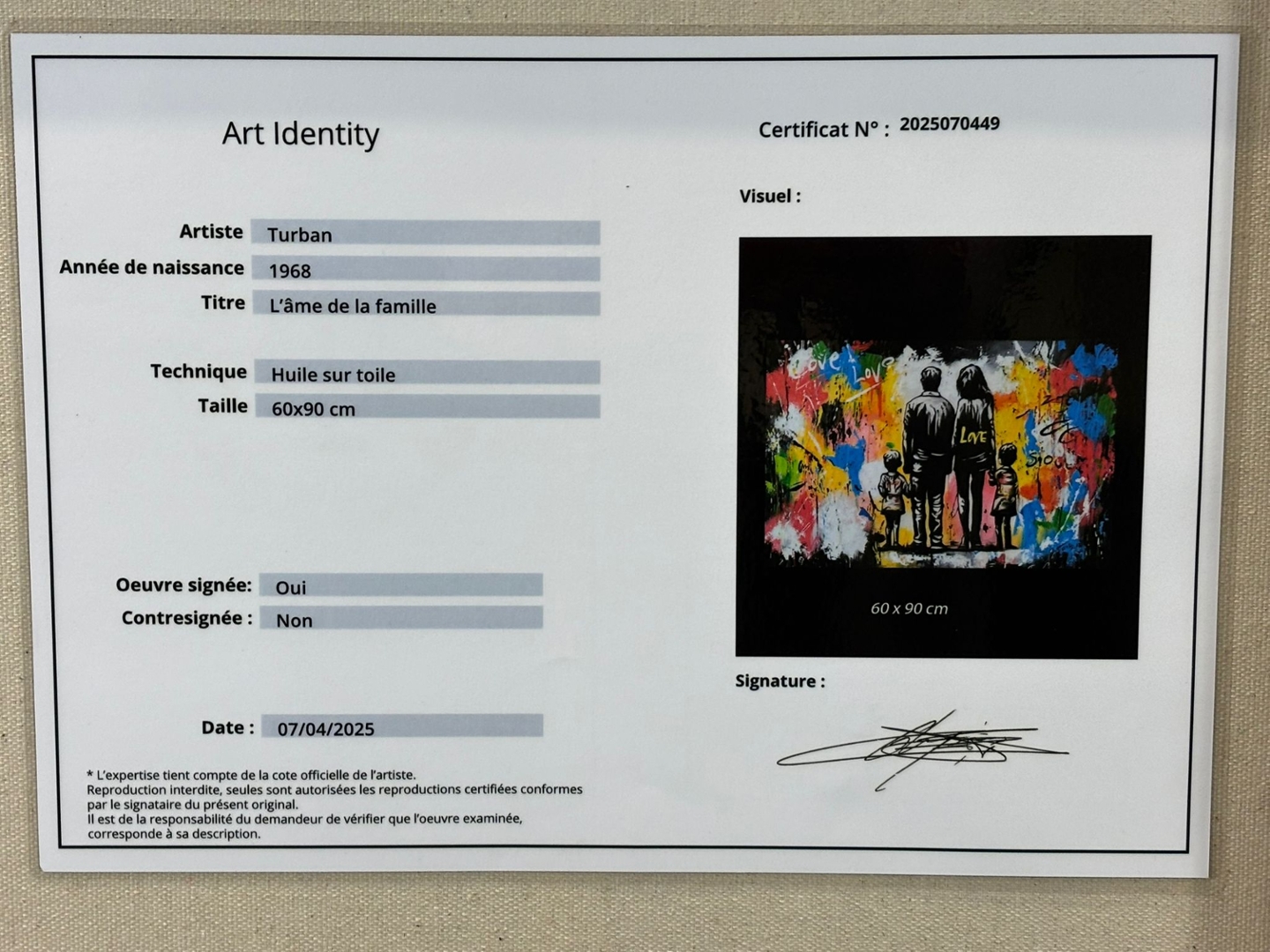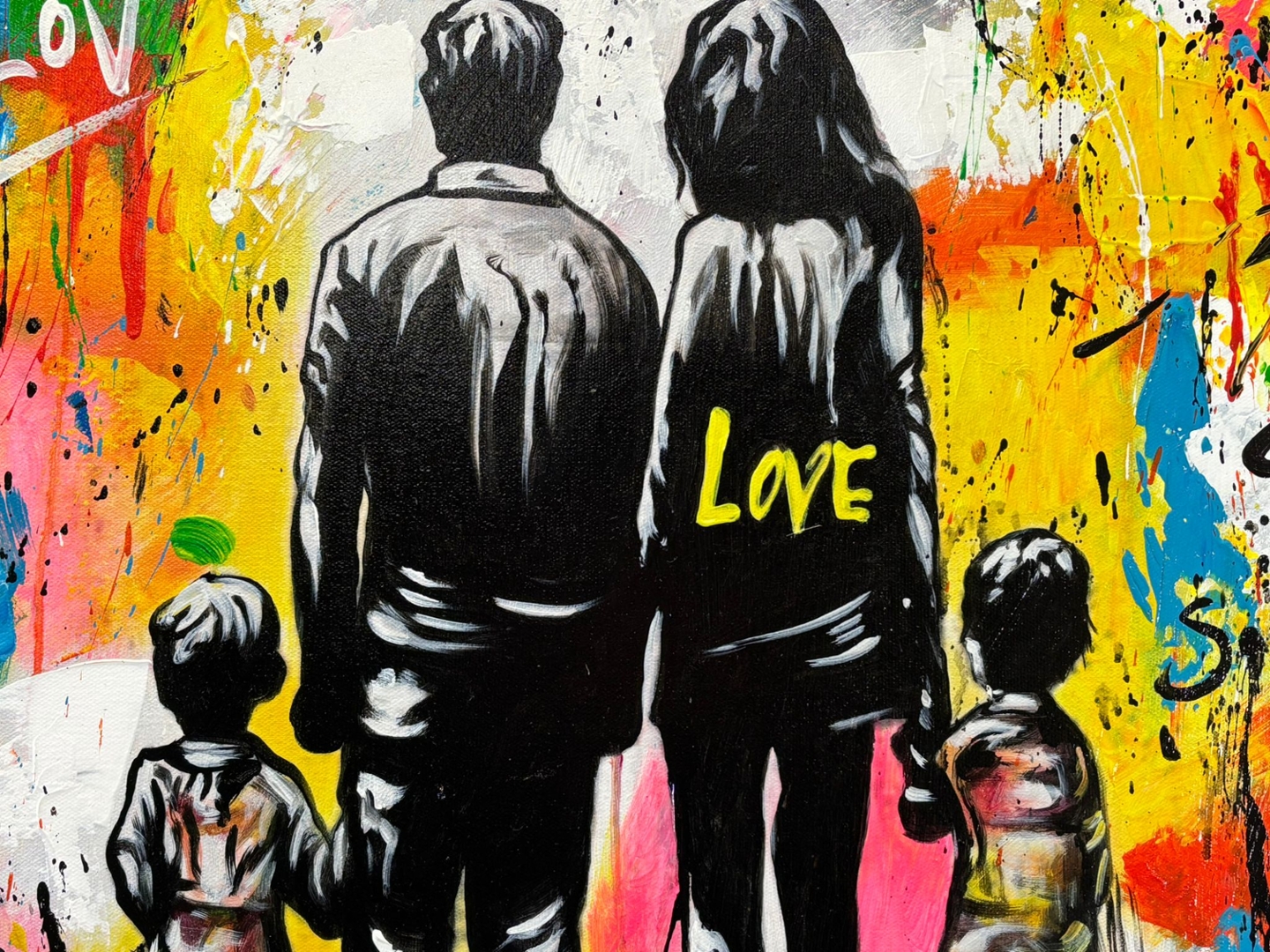An original oil painting by the artist Turban, titled L’âme de la Famille, beautifully celebrates love, unity, and togetherness. Measuring 60cm x 90cm, the piece depicts a family of four standing hand in hand, viewed from behind, against a vivid abstract backdrop of colour and movement. The word “Love” is scattered across the canvas, reinforcing the central theme of connection and shared humanity.