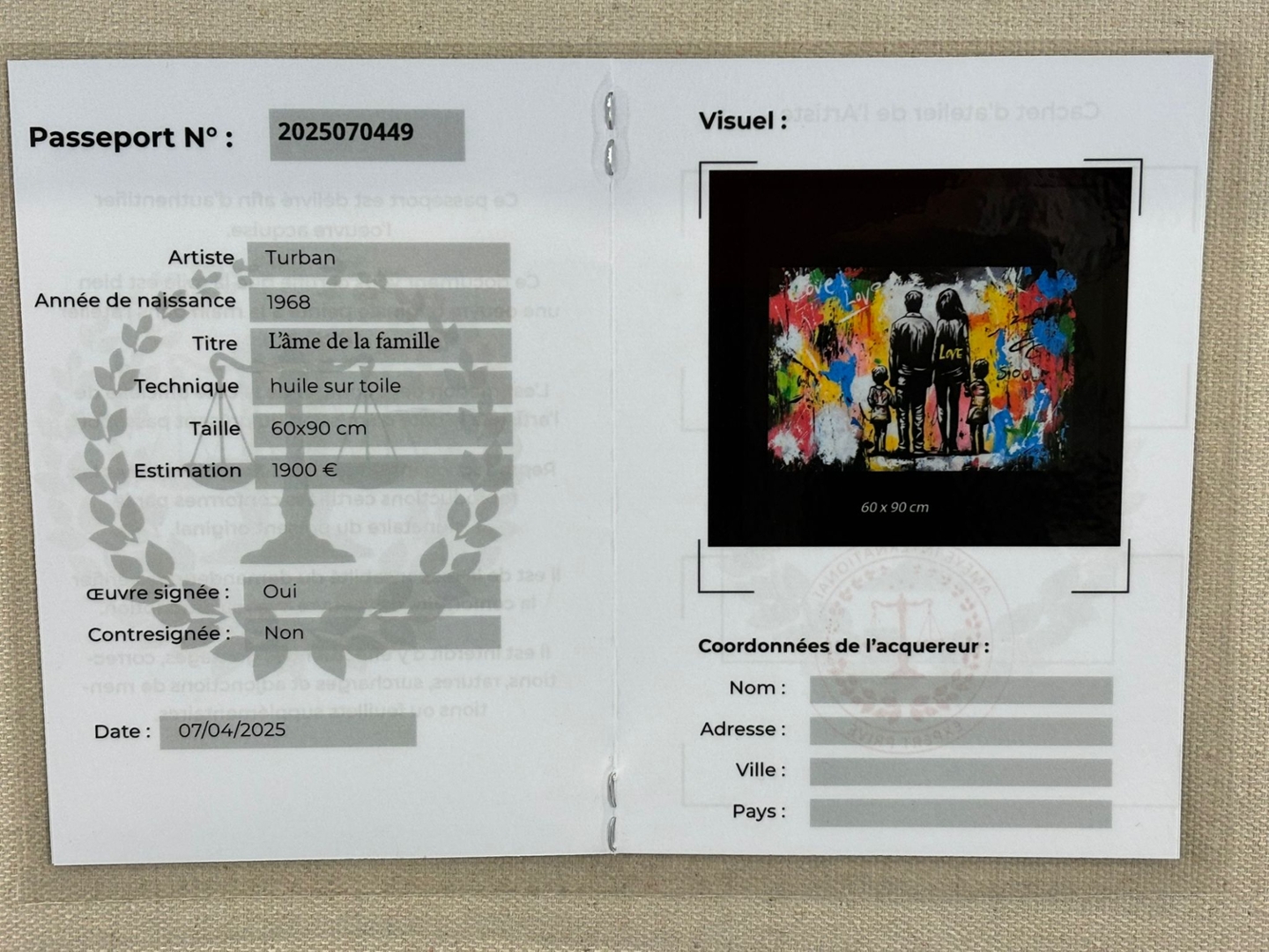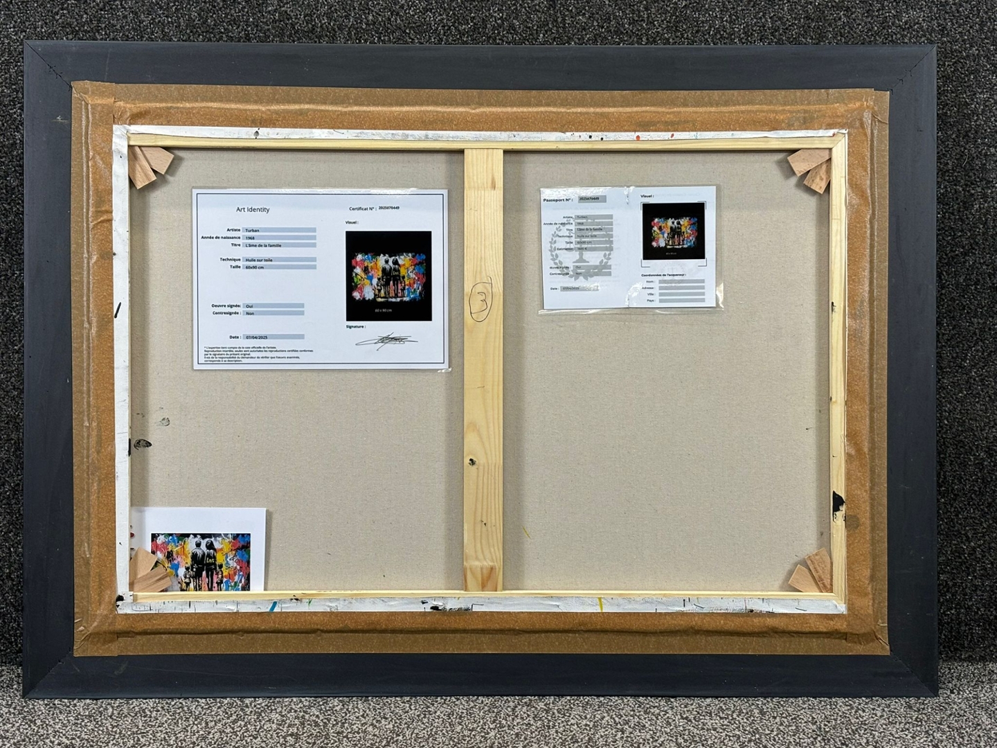 Presented in a sleek black frame and valued at €1900, L’âme de la Famille is a heartfelt work that radiates positivity and emotion, perfect for contemporary interiors with soul and story.