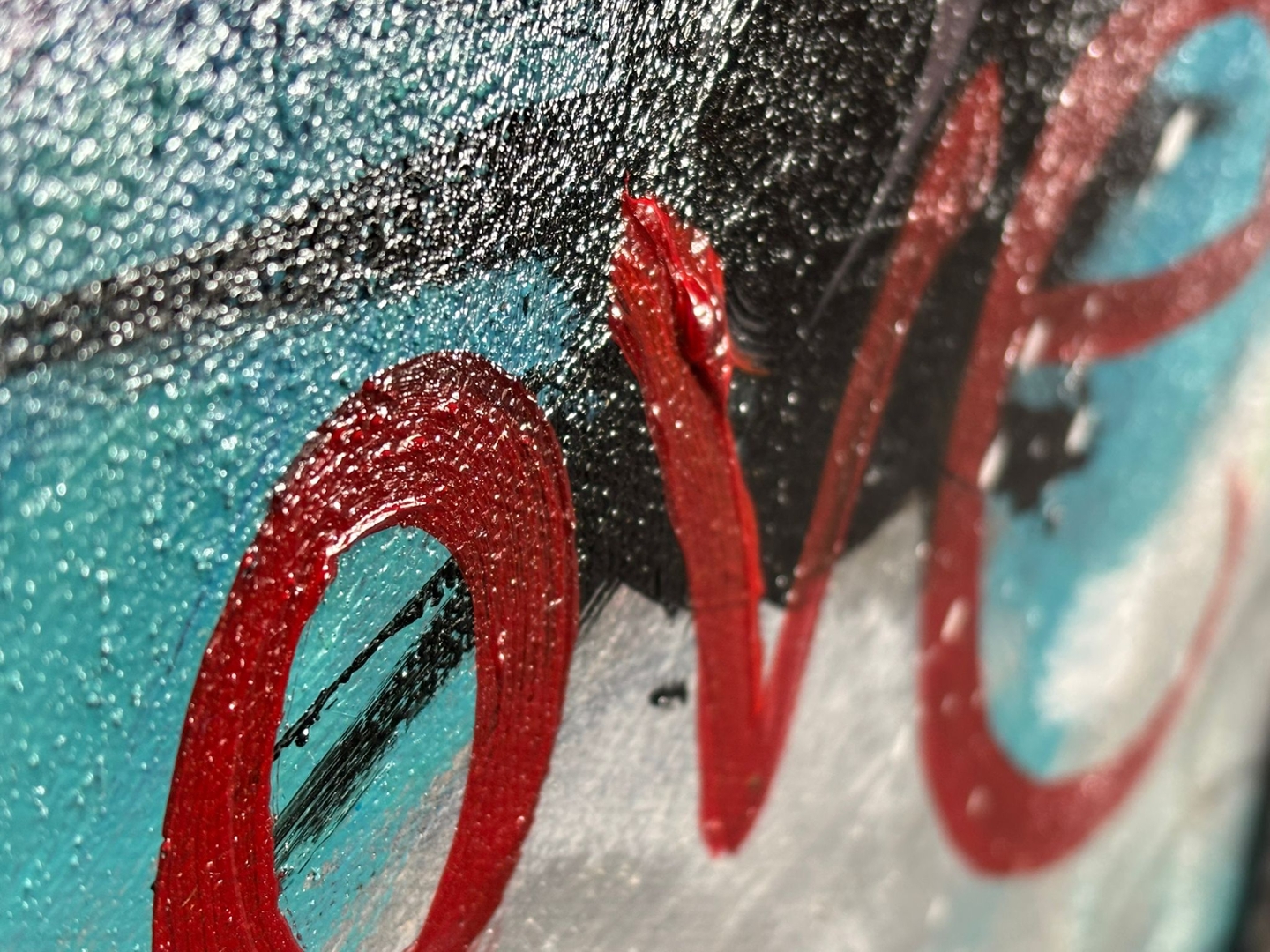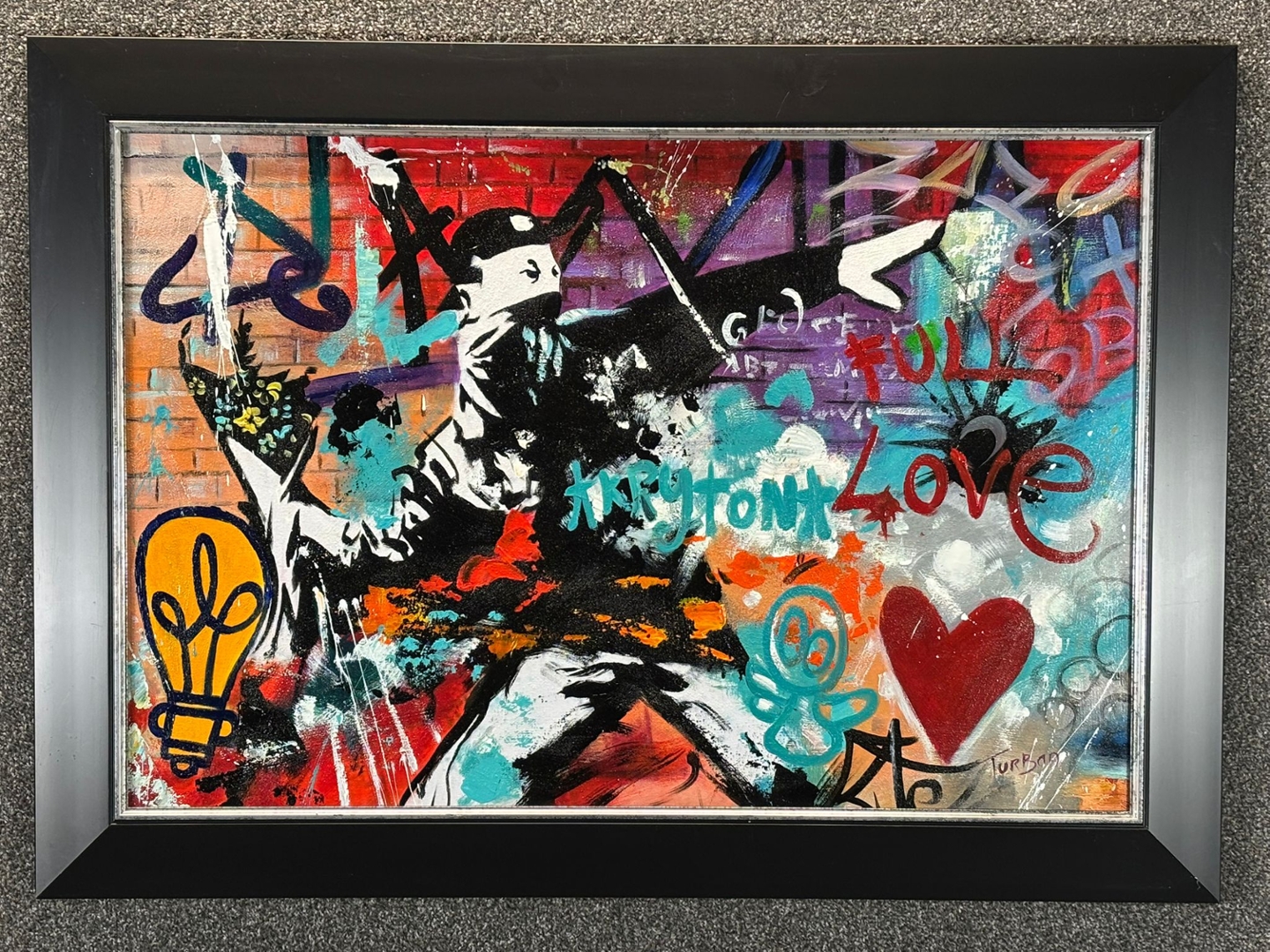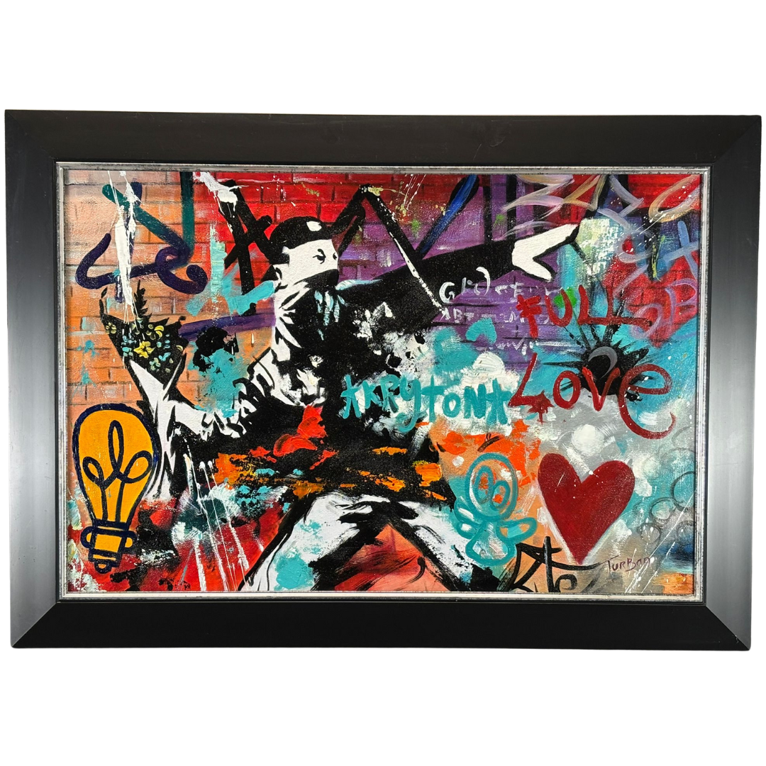 Turban masterfully merges vibrant splashes of red, turquoise, orange, and violet with urban motifs like hearts, light bulbs, and street-style lettering. Words such as “Love” and “Kryptonix” are scattered across the composition, symbolising the chaotic beauty and emotional depth found in public art spaces. The interplay of stencil-style imagery and abstract colour fields gives the work both grit and elegance.