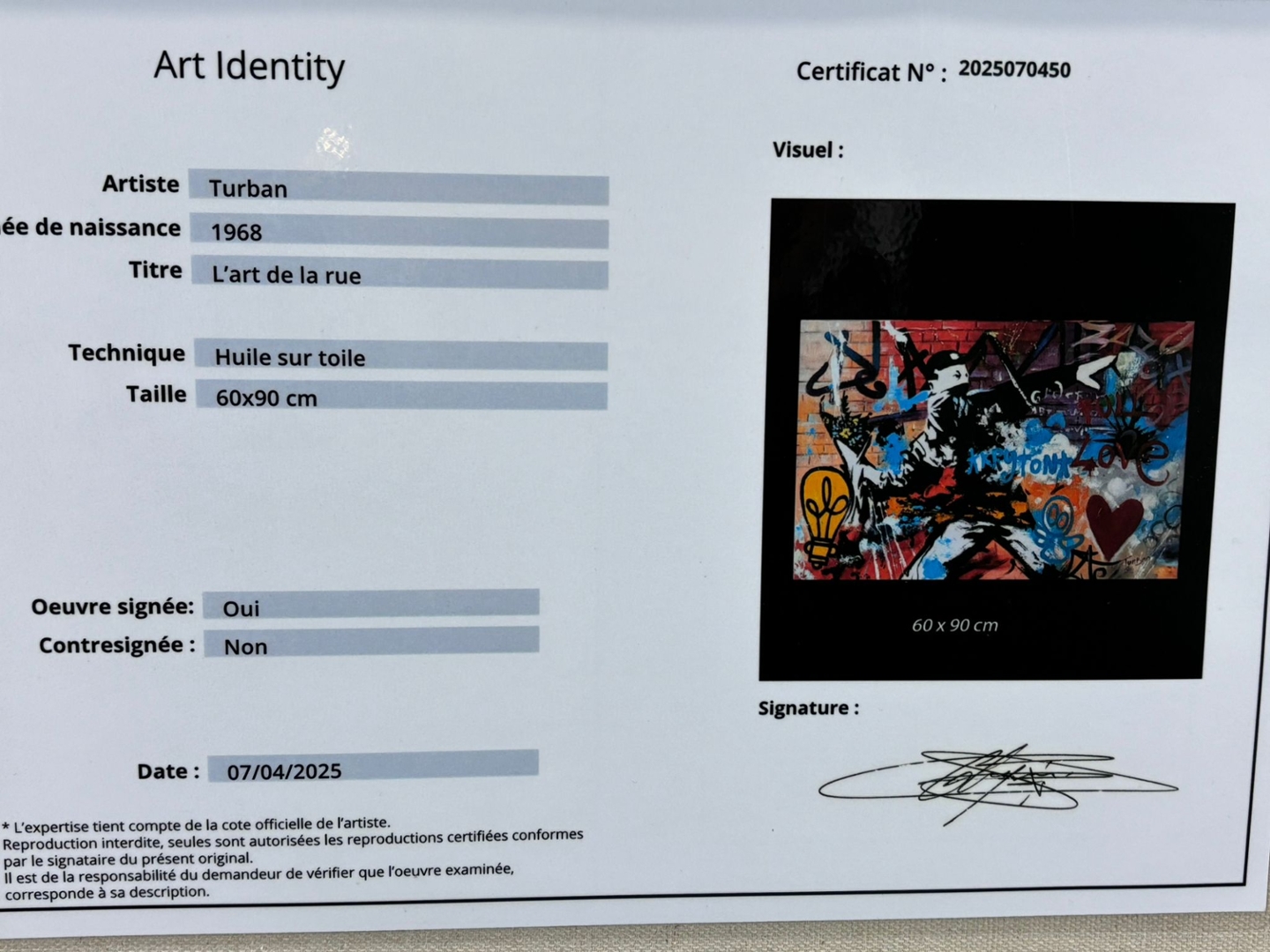 An original oil painting by the artist Turban, titled L’art de la Rue, captures the raw energy and expressive power of contemporary street art. Measuring 60cm x 90cm, the piece bursts with bold colour and layered texture, blending graffiti-inspired elements with fine art precision. The central figure — depicted in a dynamic, spray-paint motion — embodies rebellion, creativity, and freedom of expression.