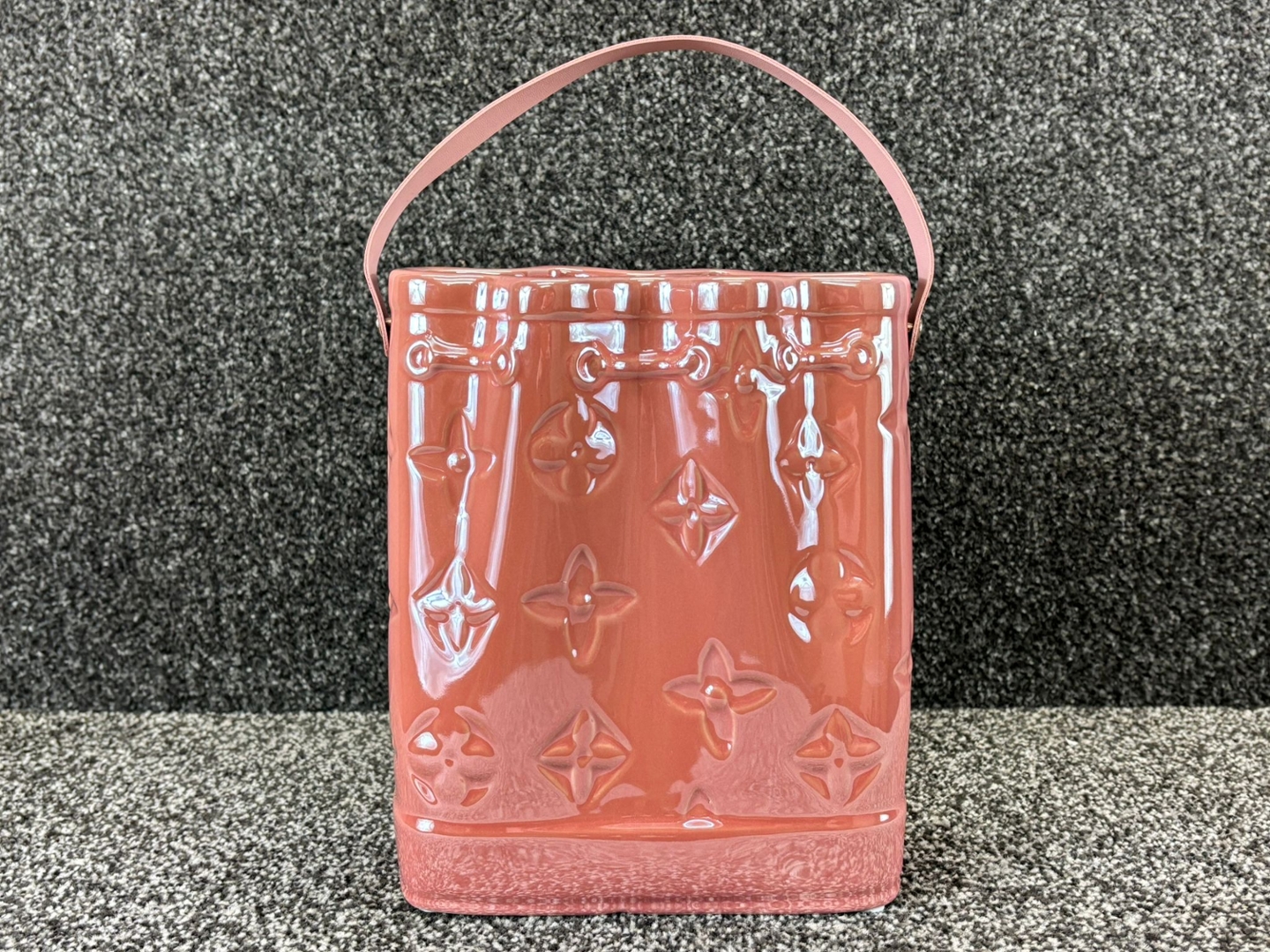 A Large Pink Ceramic Handbag Vase with a Pink Handle. Approx 23cm height, 19cm width, 10cm depth.