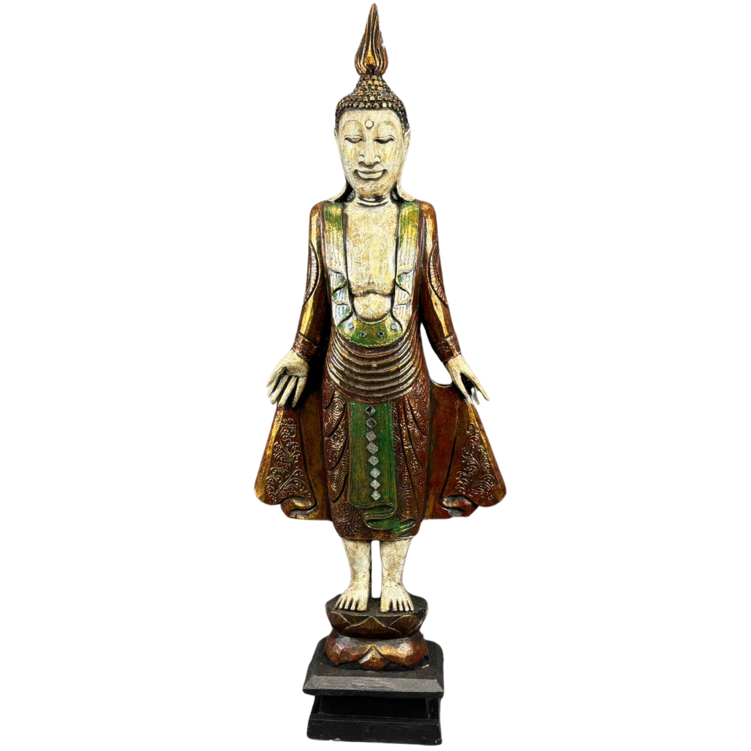 Depicted in a traditional standing pose, the Buddha exudes calm and compassion, with hands gently lowered in a gesture of peace. The sculpture features exquisite detailing throughout, highlighted by tones of gold, bronze, and green that bring warmth and depth to the design. The intricate carvings on the robe and serene facial expression reflect exceptional artistry and spiritual symbolism.