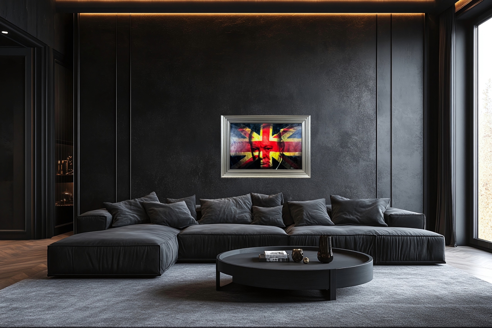 A brand new silver-framed liquid art picture that commands attention, this striking piece showcases an intense and vibrant image of Winston Churchill blended seamlessly with the Union Jack. The high-gloss liquid art finish enhances every colour and contour, giving the flag’s bold tones a luminous depth while Churchill’s expression emerges with a powerful, almost three-dimensional presence.