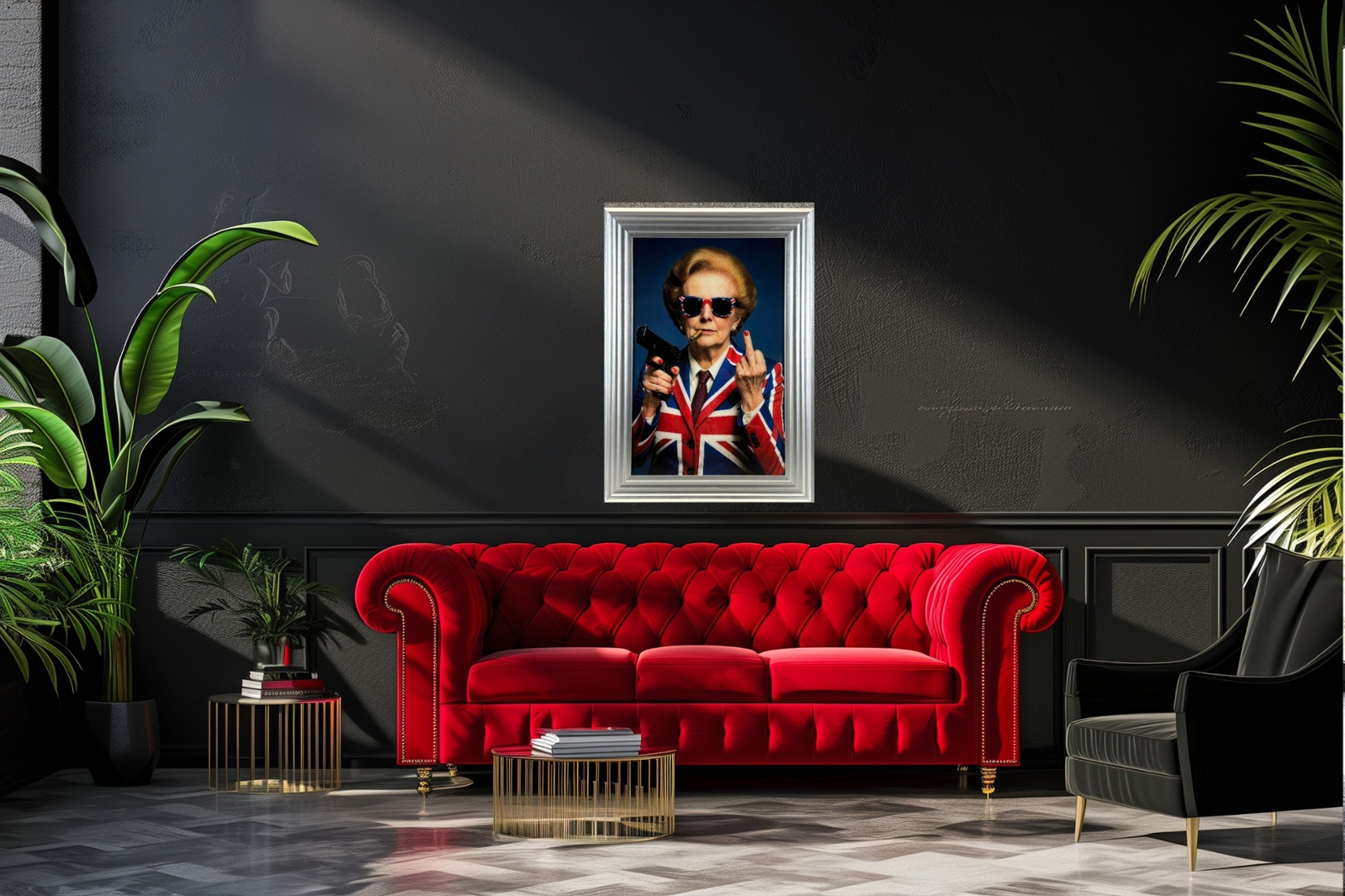 A brand new silver framed liquid art picture that makes an instant statement, this vibrant and humorous piece features Maggie Thatcher reimagined in a bold contemporary style. Dressed in a striking Union Jack suit and matching sunglasses, she stands with unmistakable attitude, captured in a high-gloss liquid finish that enhances every vivid colour and detail. The playful mix of British iconography and rebellious personality gives the artwork a sharp, modern edge that’s guaranteed to draw attention.