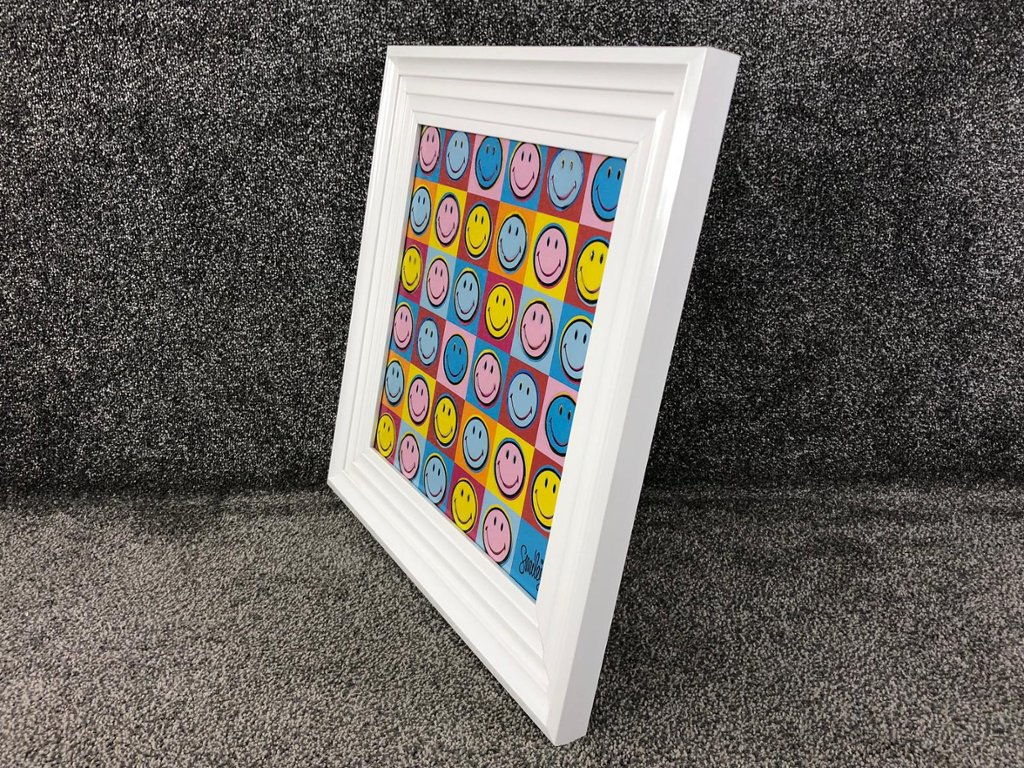 A framed liquid art picture of smiling faces. Approx 22" height, 22" width.