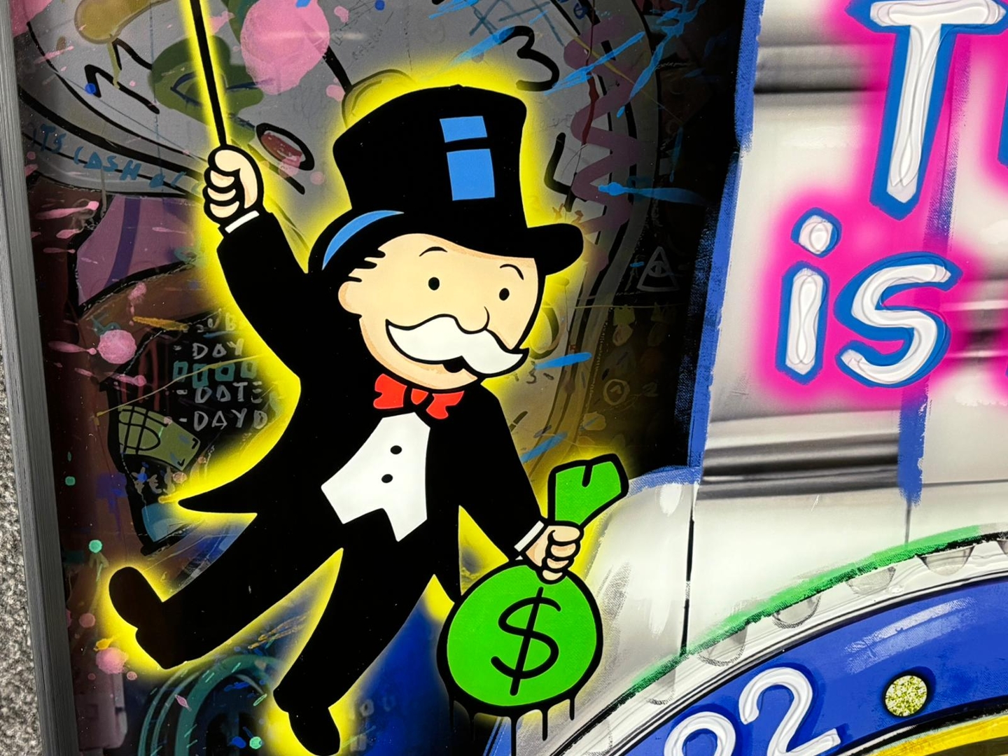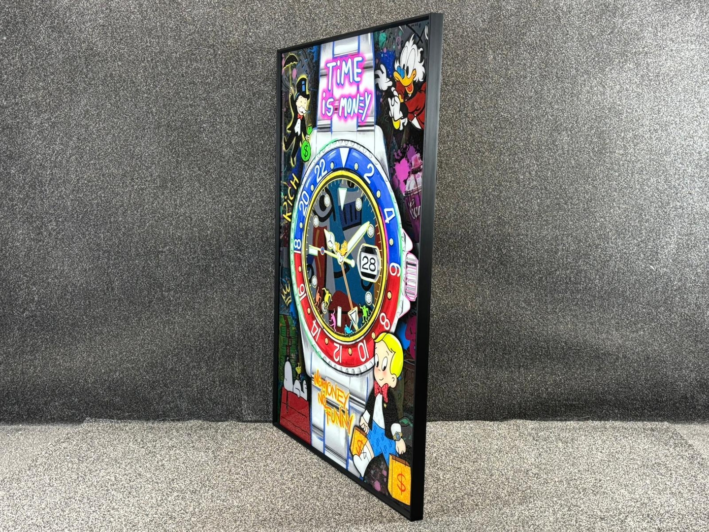 A brand new black framed liquid art picture titled Time is Money, No Money No Funny. Featuring vibrant colours and eye-catching details, this piece blends luxury watch imagery with iconic cartoon characters and modern pop-art style. The neon-like lettering and humorous themes give it a unique, contemporary edge that makes it stand out in any room.
