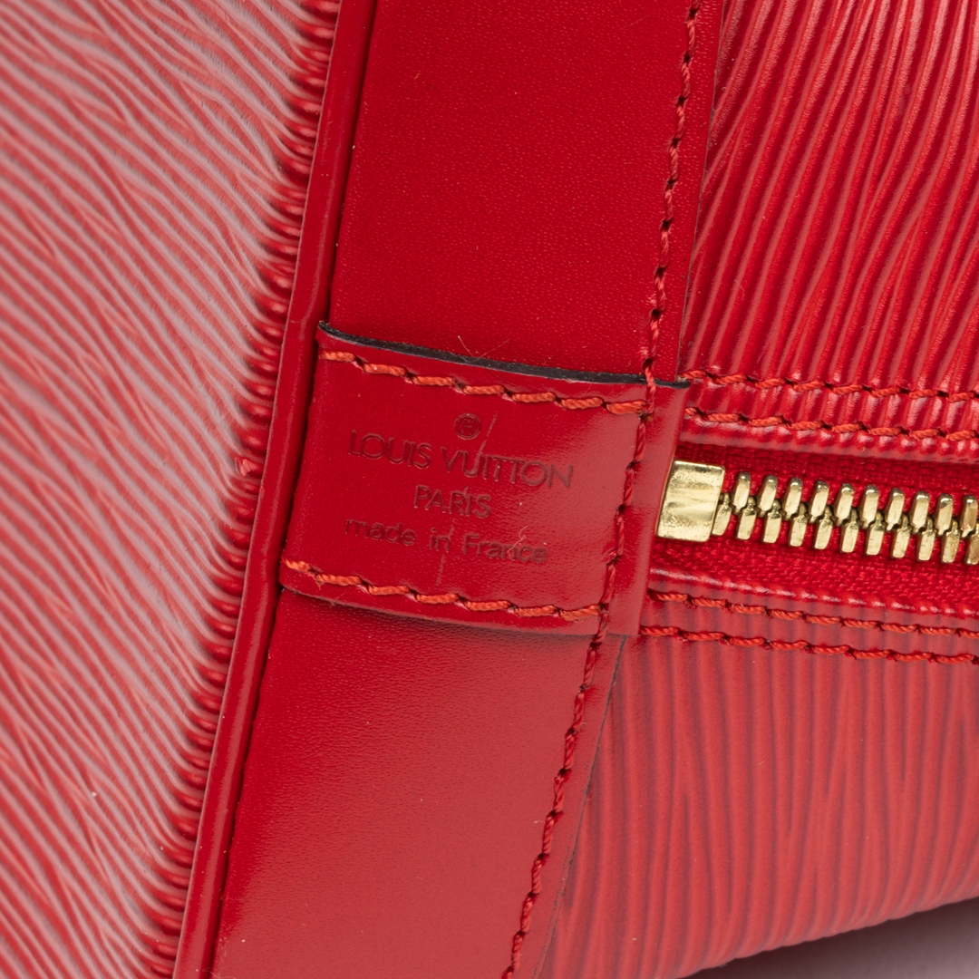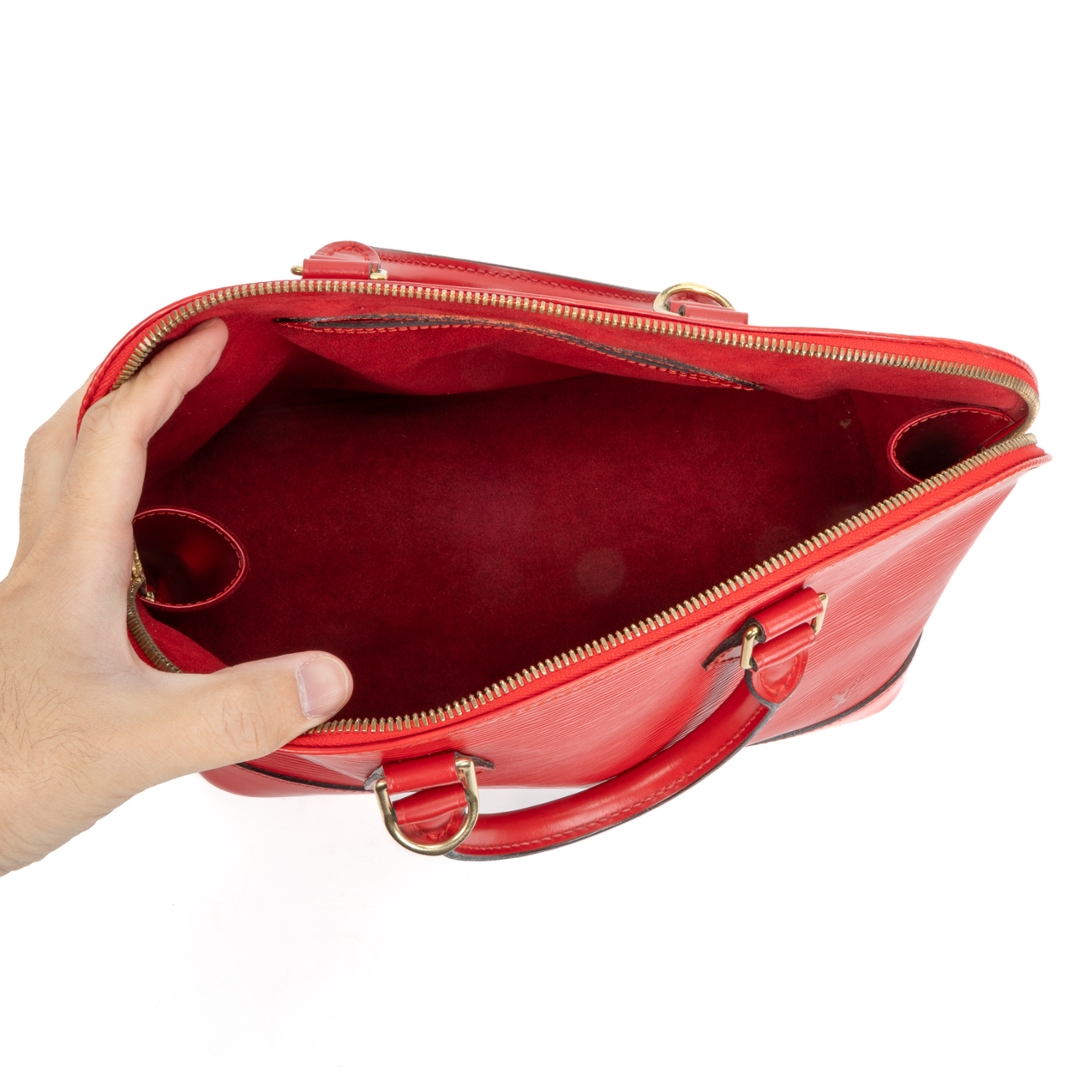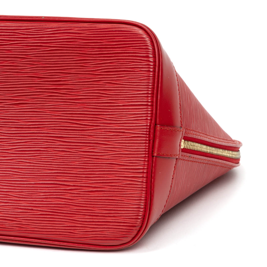 A vintage Louis Vuitton red calf leather Alma bag with a certificate of authenticity. Approximately 23cm height, 30cm width.