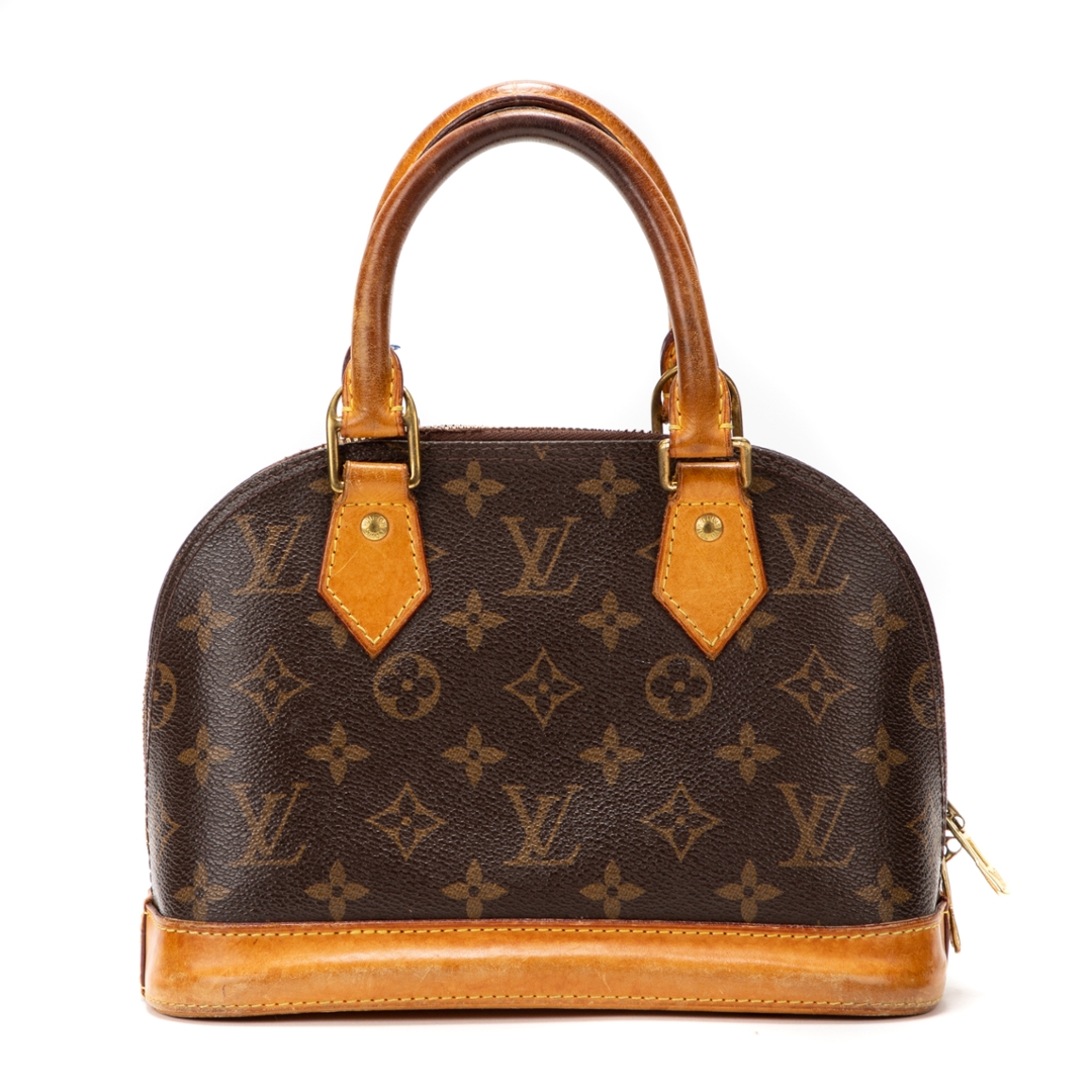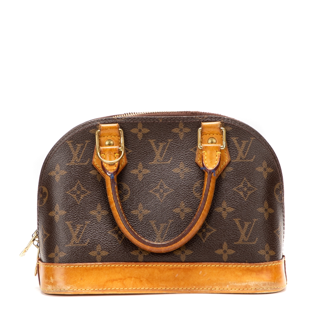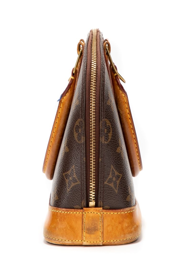 A vintage Louis Vuitton Alma bag crafted in the house’s iconic brown Monogram coated canvas, presenting a compact and timeless interpretation of this instantly recognisable silhouette. The structured dome shape is complemented by natural leather trim, dual rolled top handles, and gold-tone hardware, while the double zip closure ensures secure and practical use. Measuring approximately 18cm in height and 24cm in width, it offers a smaller, refined profile ideal for carrying daily essentials.