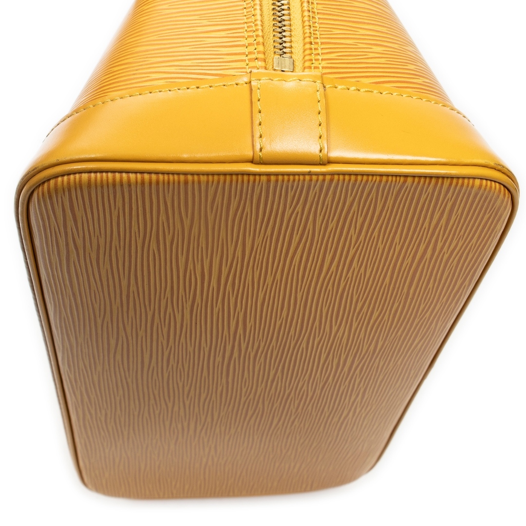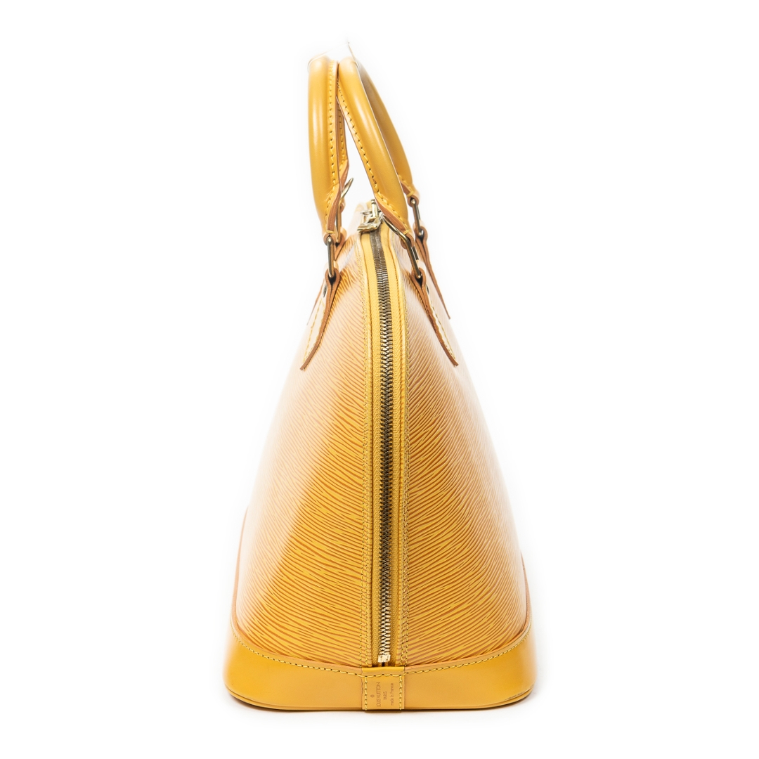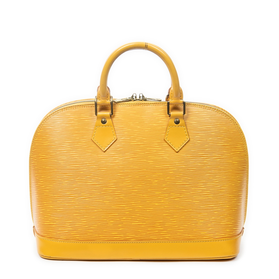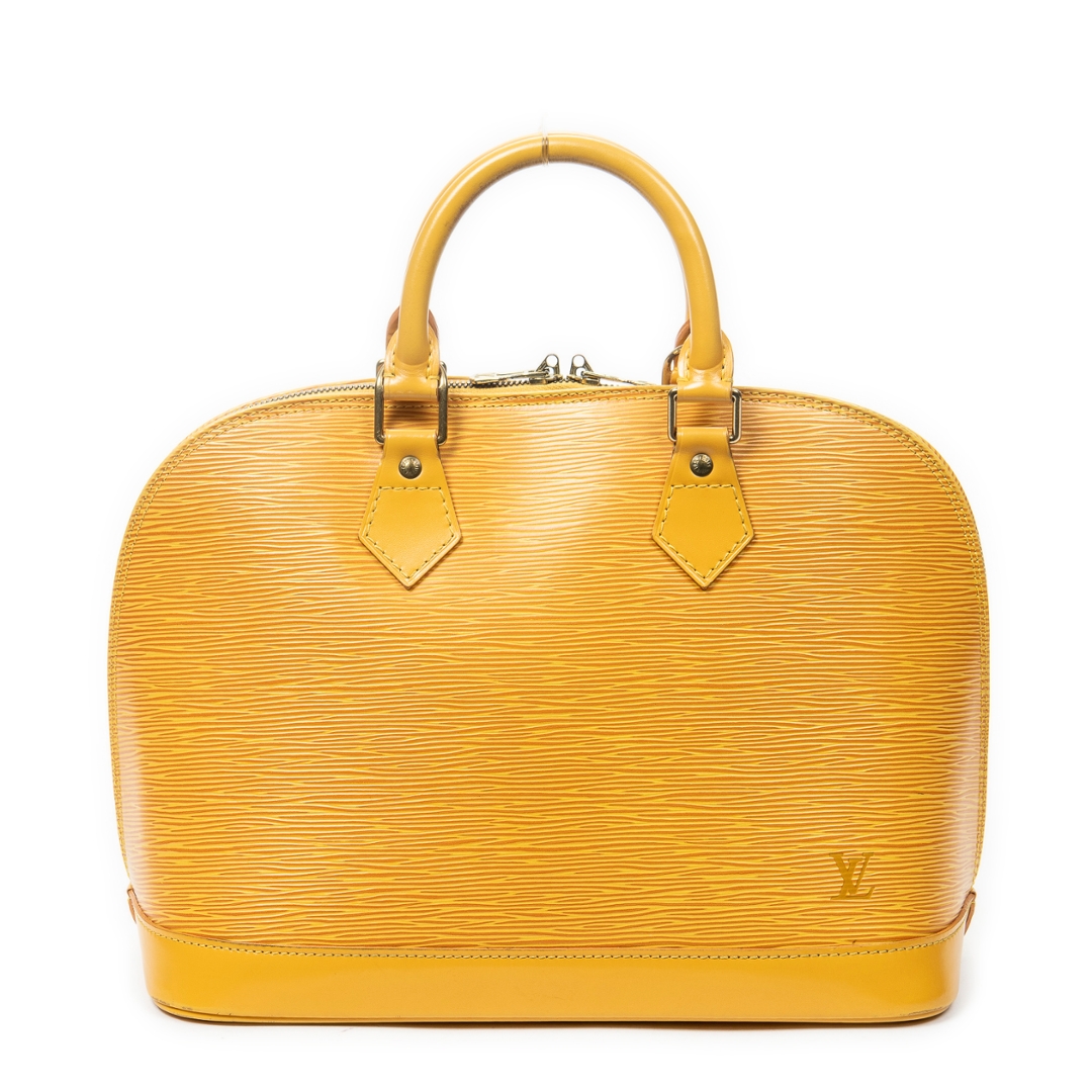 A vintage Louis Vuitton Alma bag crafted in vibrant yellow calf leather, offering a bold and distinctive take on the house’s iconic structured silhouette. The elegant dome-shaped design is complemented by dual rolled top handles, refined leather detailing, and gold-tone hardware, while the secure double zip closure ensures practicality for everyday use. Measuring approximately 23cm in height and 30cm in width, it presents a well-balanced size suited to both daily wear and statement styling.