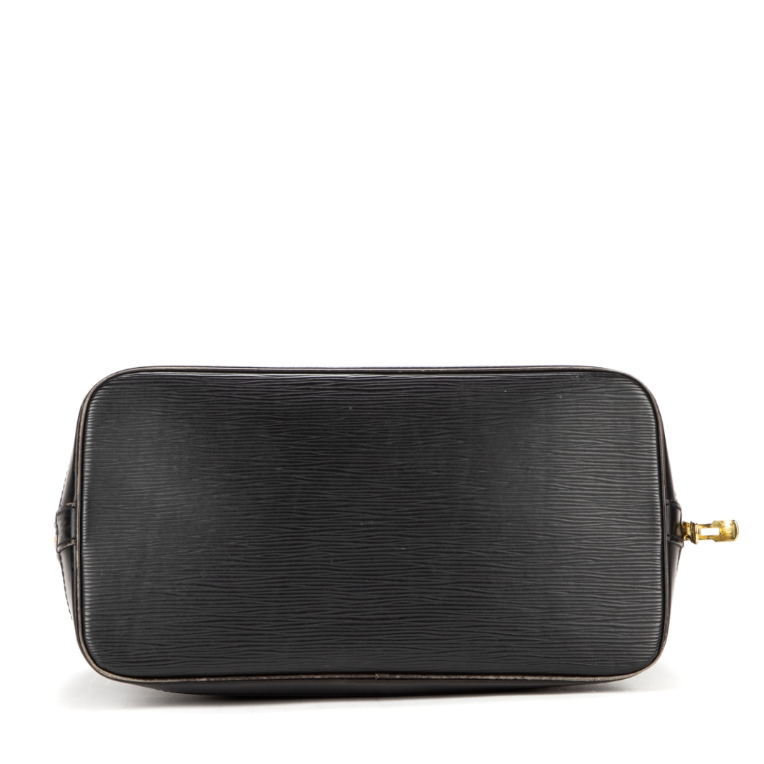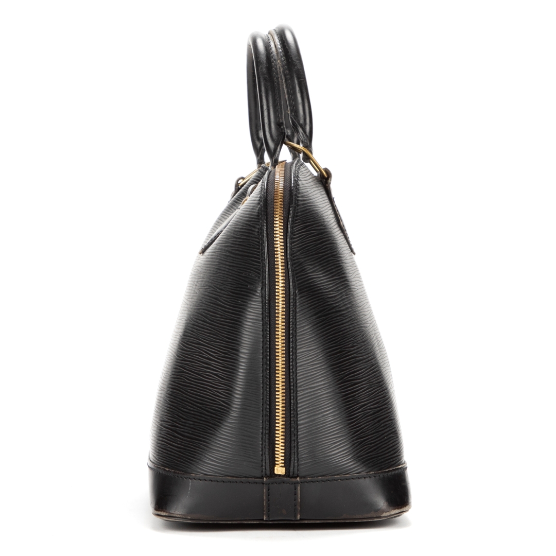 A vintage Louis Vuitton black calf leather Alma bag with a certificate of authenticity. Approximately 23cm height, 30cm width.