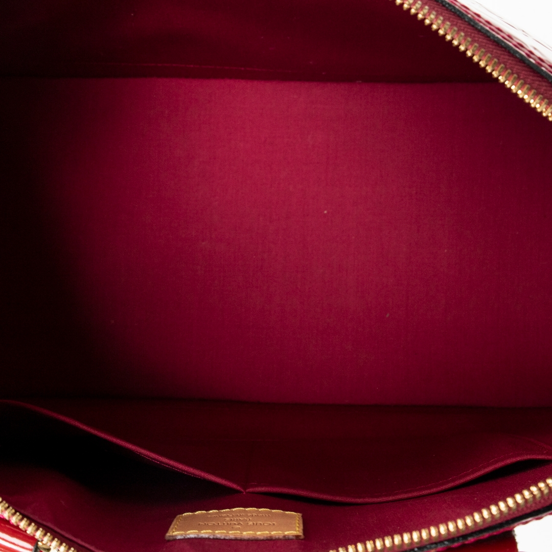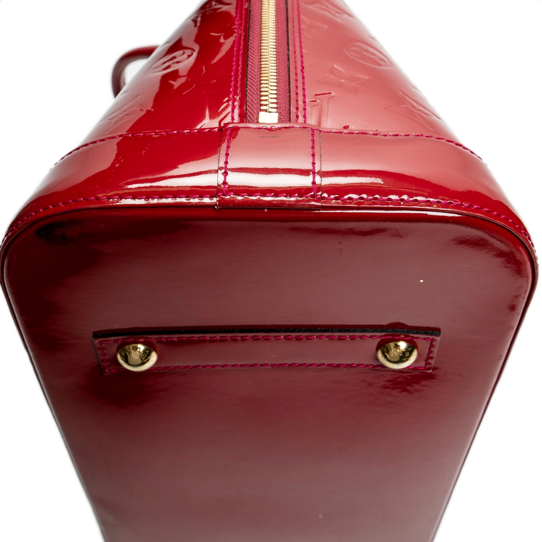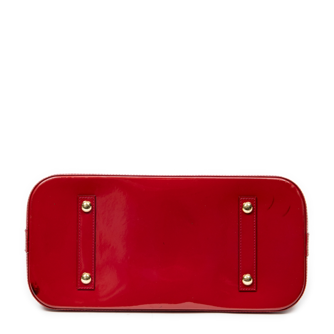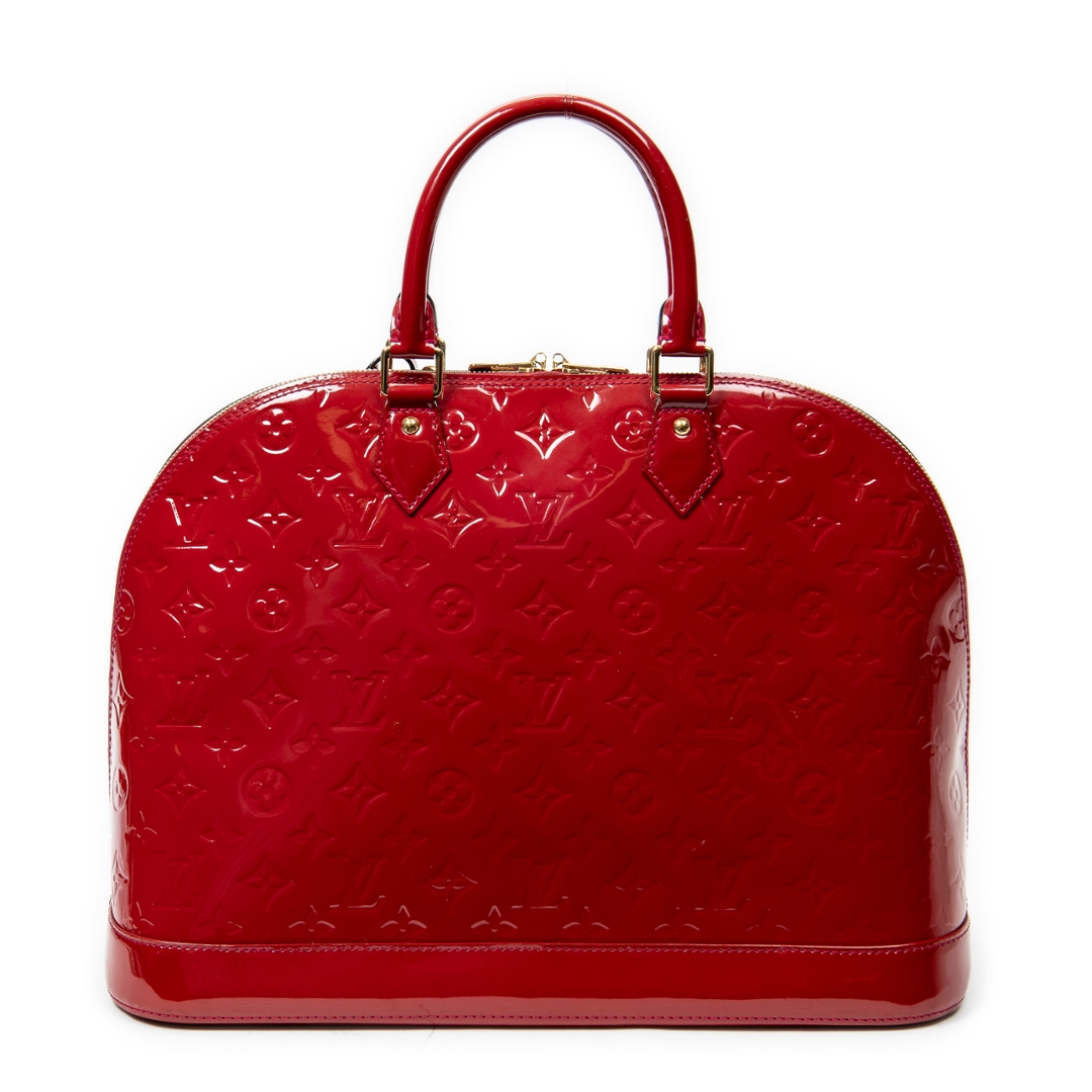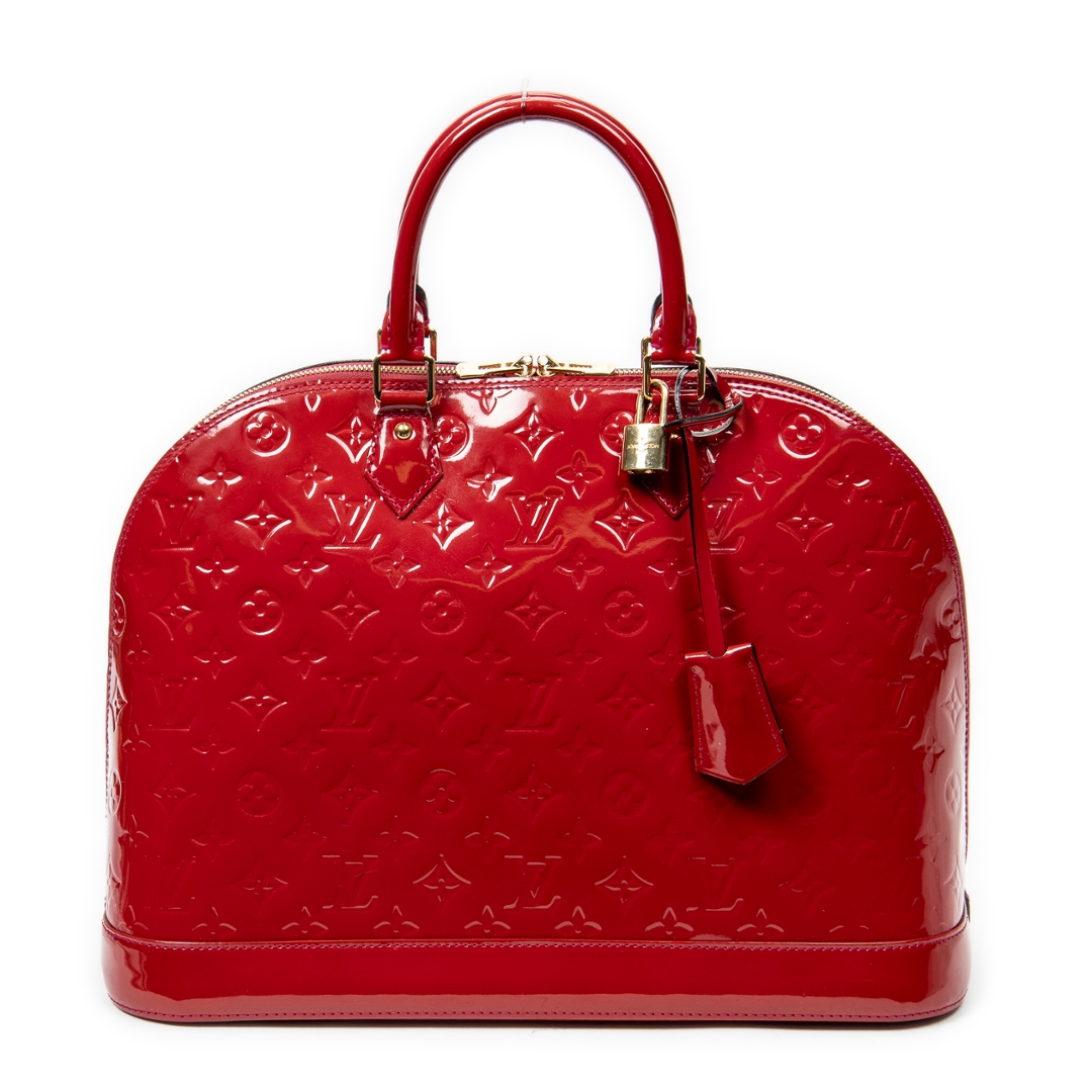 A vintage Louis Vuitton rouge greanadine calf leather Alma bag with a certificate of authenticity. Approximately 29cm height, 38cm width.
