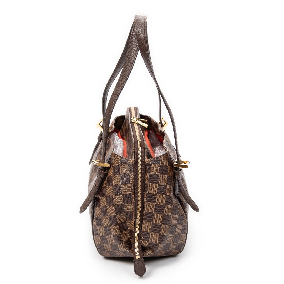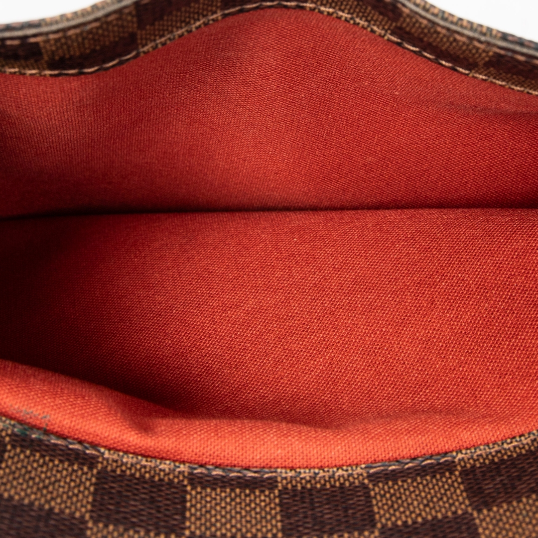 A vintage Louis Vuitton Belem bag crafted in the classic brown coated canvas with the iconic Damier Ebene pattern, complemented by dark leather trim and gold-tone hardware. The structured silhouette is defined by its clean lines and double top handles, while the full-length zip closure provides both security and a refined finish.