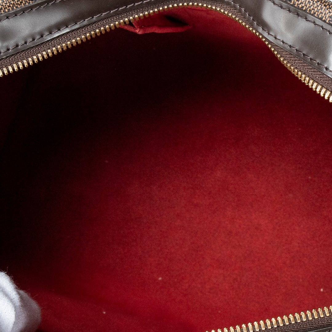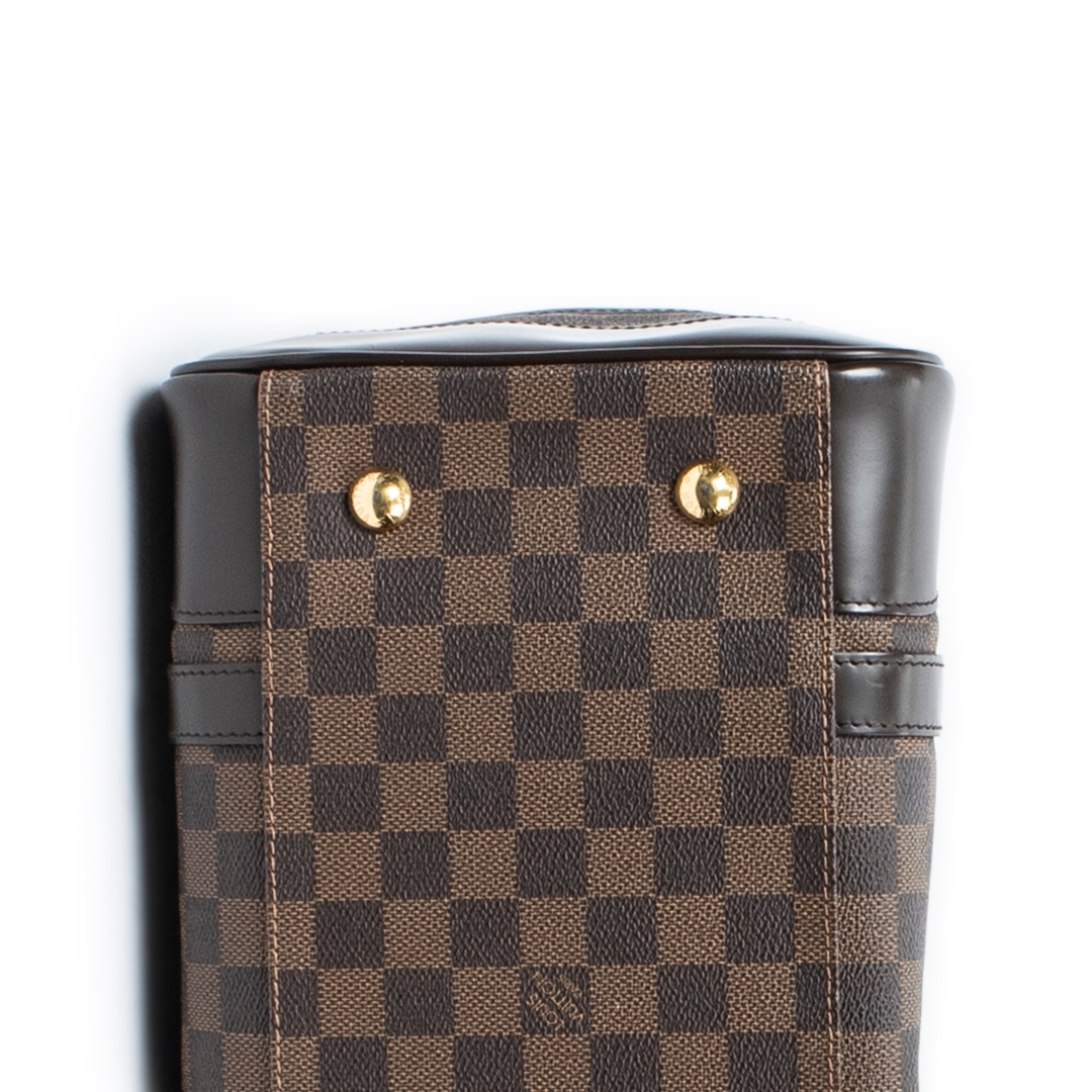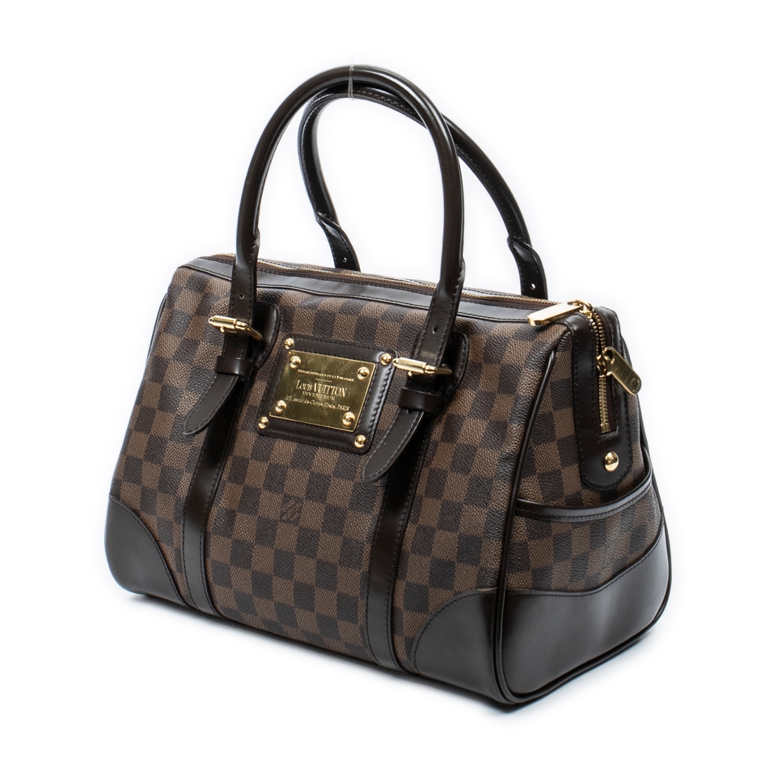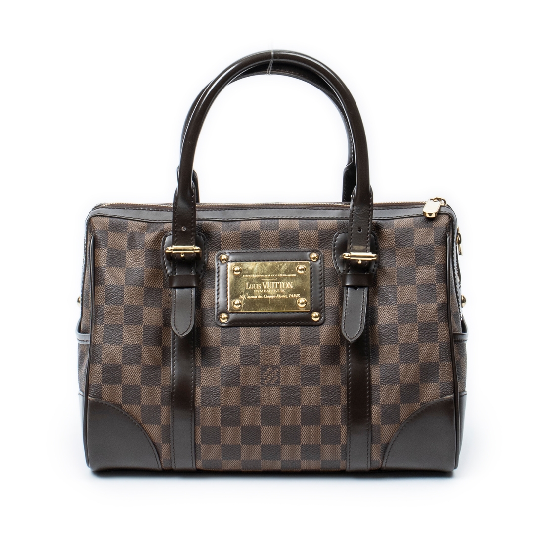 A vintage Louis Vuitton Berkeley bag crafted in the signature brown coated canvas with the iconic Damier Ebene pattern, elevated by smooth dark leather trim and gold-tone hardware. The structured silhouette is defined by its elegant top handles and distinctive front plaque, creating a refined and instantly recognisable Louis Vuitton aesthetic.