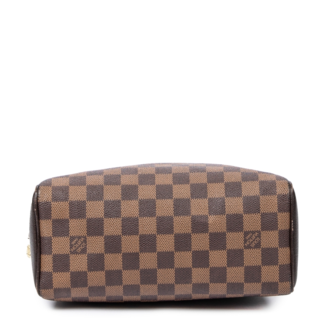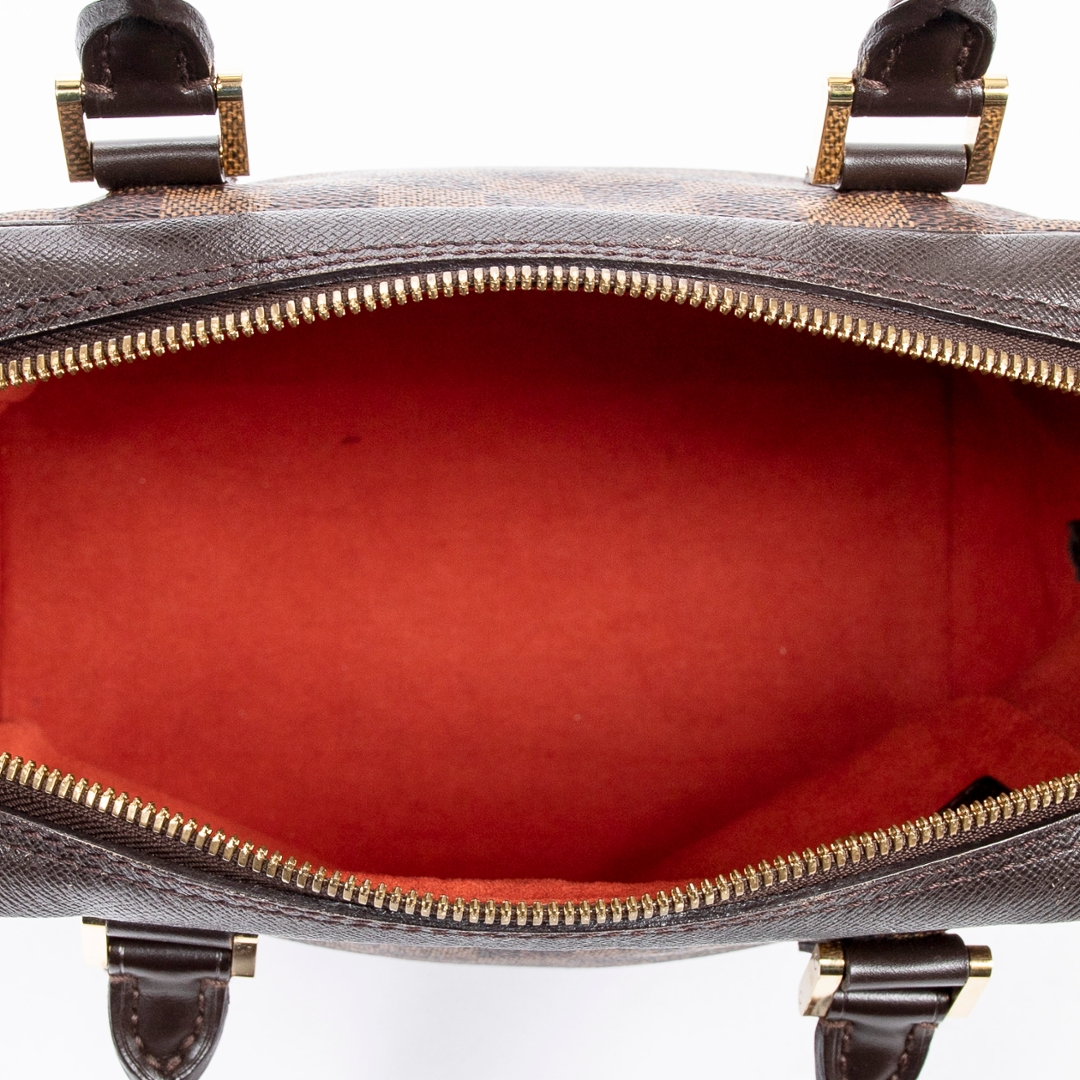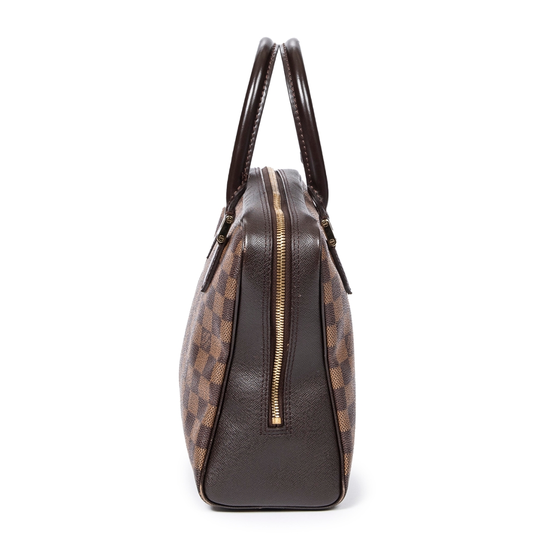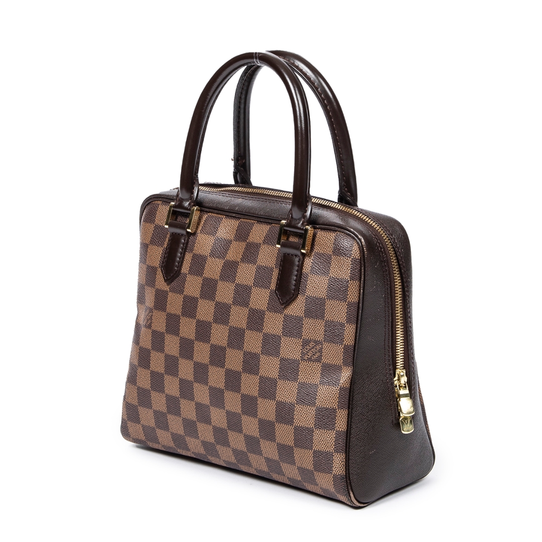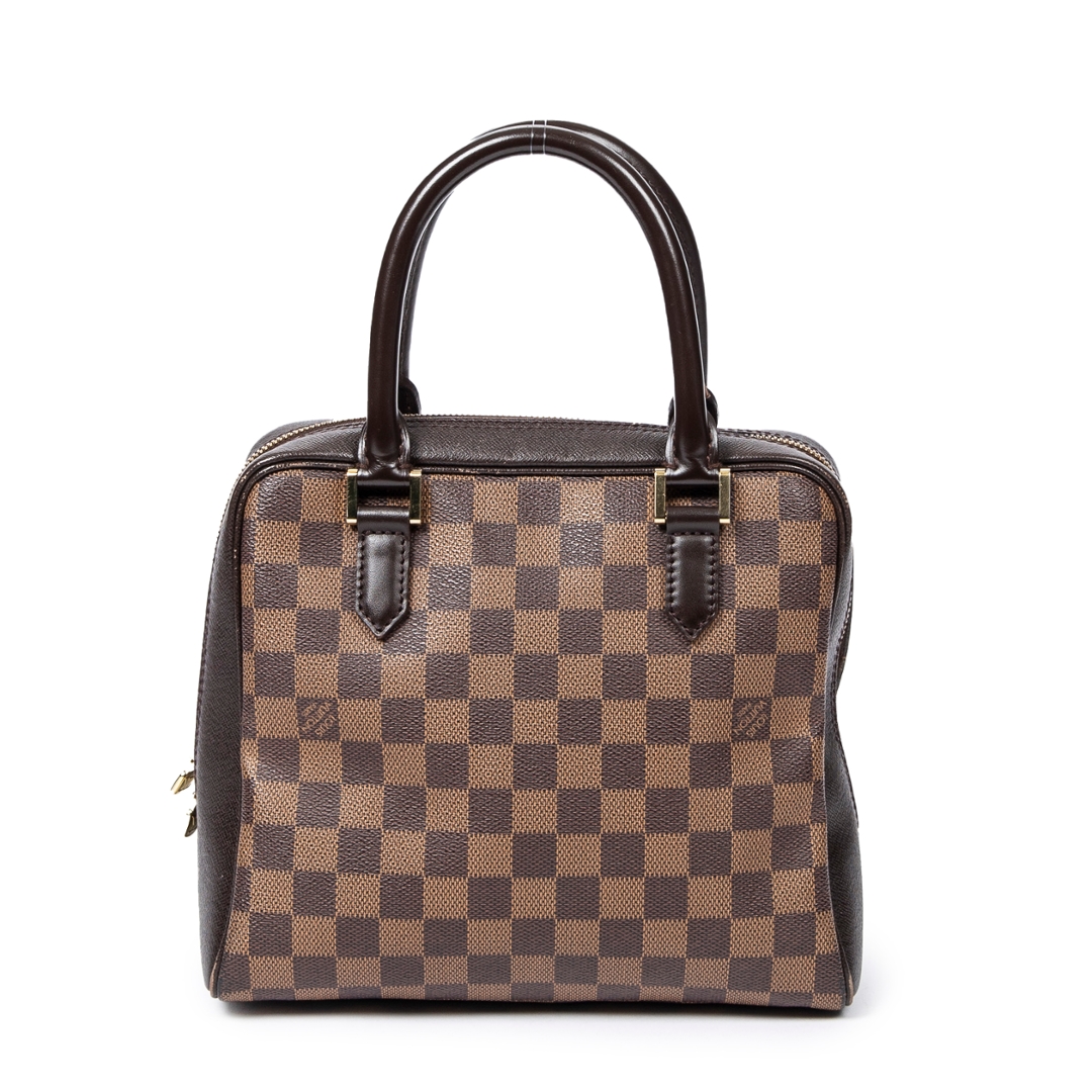 A vintage Louis Vuitton Brera bag crafted in the house’s signature brown Damier coated canvas, offering a compact and structured silhouette with timeless appeal. The refined rectangular shape is complemented by dark leather trim, dual rolled top handles, and gold-tone hardware, while the secure double zip closure ensures practicality for everyday use. Measuring approximately 20cm in height and 24cm in width, it presents a neat and versatile size ideal for daily essentials.