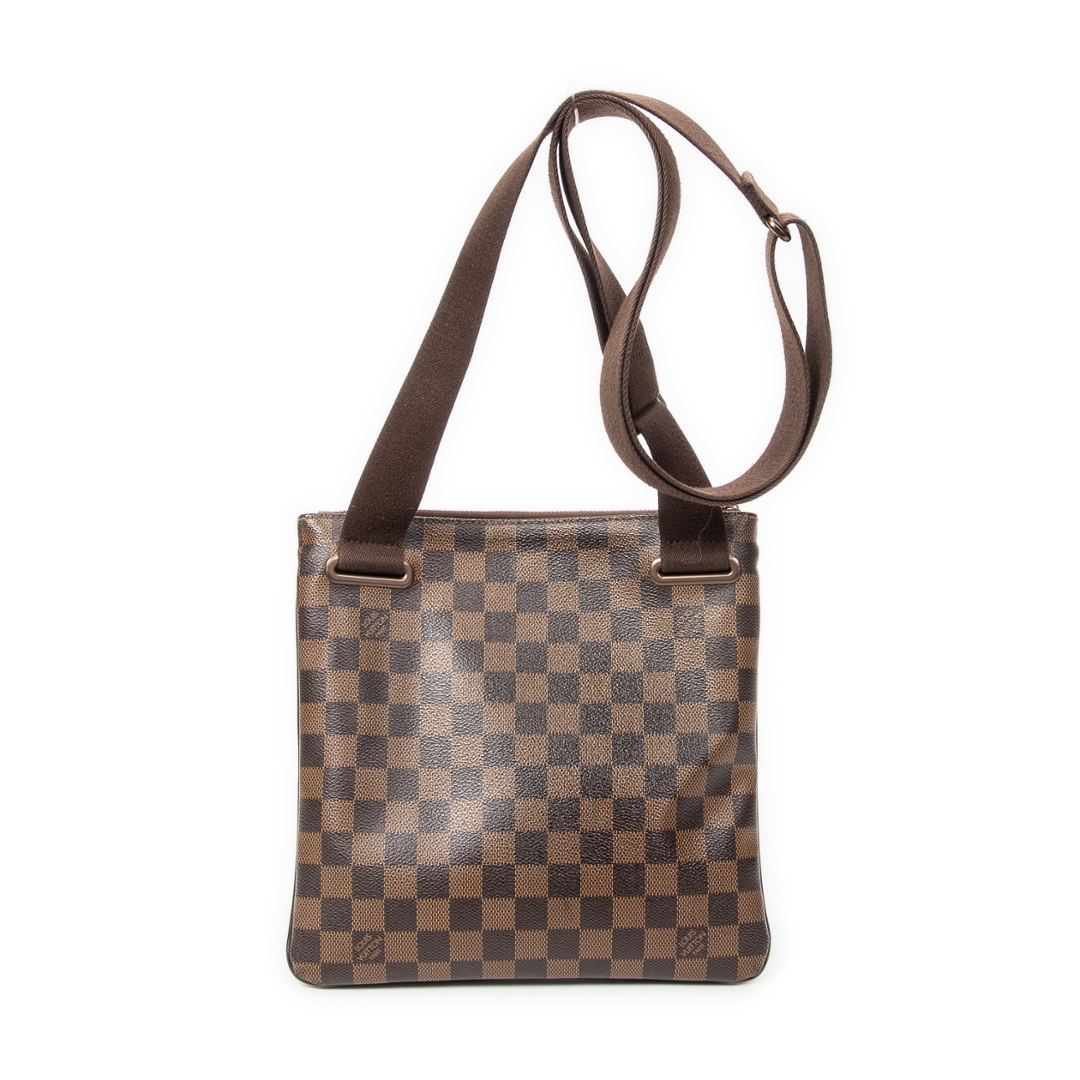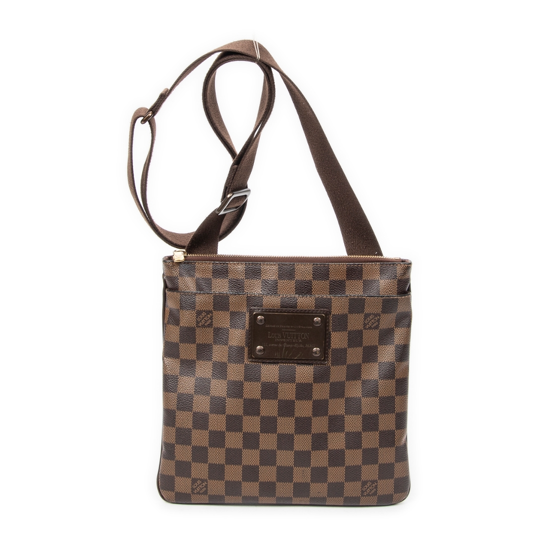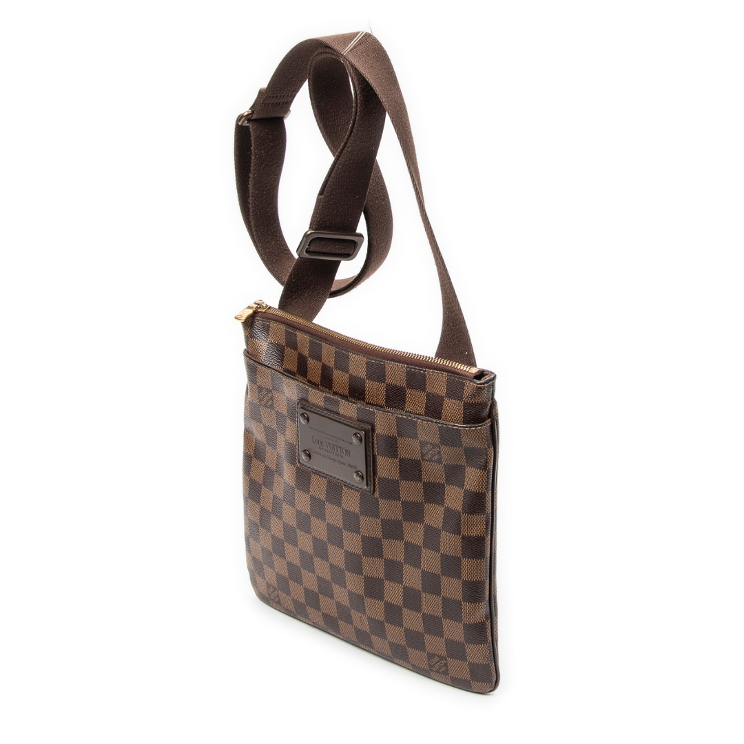 A vintage Louis Vuitton Brooklyn Pochette Plate bag crafted in the house’s signature brown Damier coated canvas, offering a clean and contemporary silhouette with everyday practicality. The compact square profile is complemented by a wide adjustable shoulder strap, dark leather trim, and gold-tone hardware, while a secure zip-top closure ensures ease of use. Measuring approximately 25cm in height and 25cm in width, it provides a balanced and versatile size for daily essentials.
