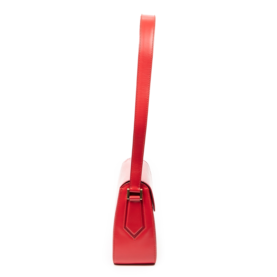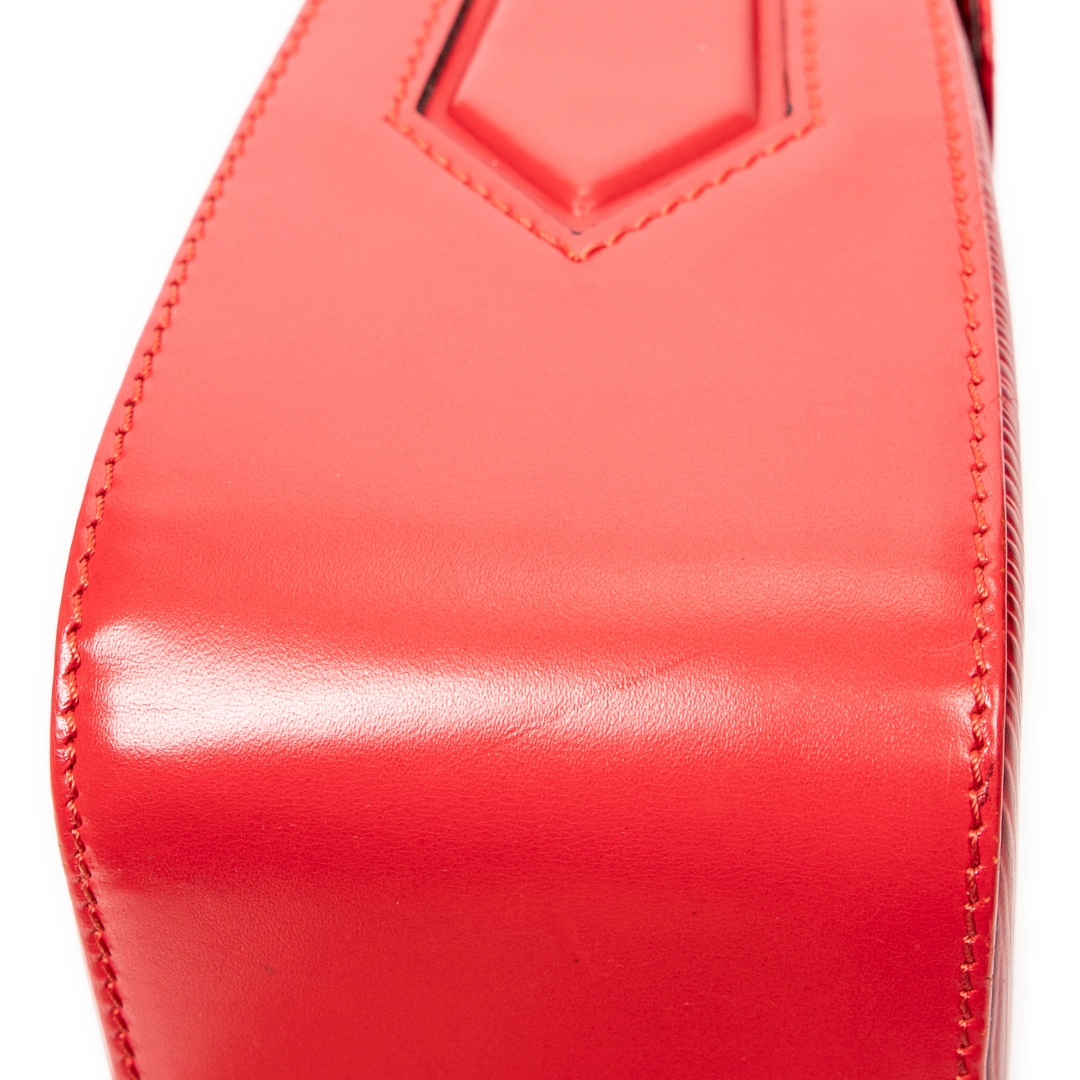 A vintage Louis Vuitton Buci bag crafted in striking red calf leather, featuring the signature textured finish that adds depth and a refined tactile quality. The compact, structured silhouette is complemented by smooth leather side panels and subtle gold-tone hardware, creating a bold yet elegant statement piece within the Louis Vuitton collection.