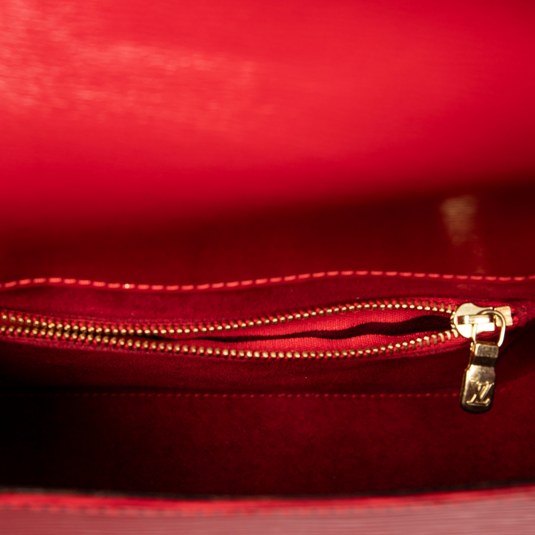 A vintage Louis Vuitton Red Calf Leather Buci bag with a certificate of authenticity. Approximately 16cm height, 20cm width.