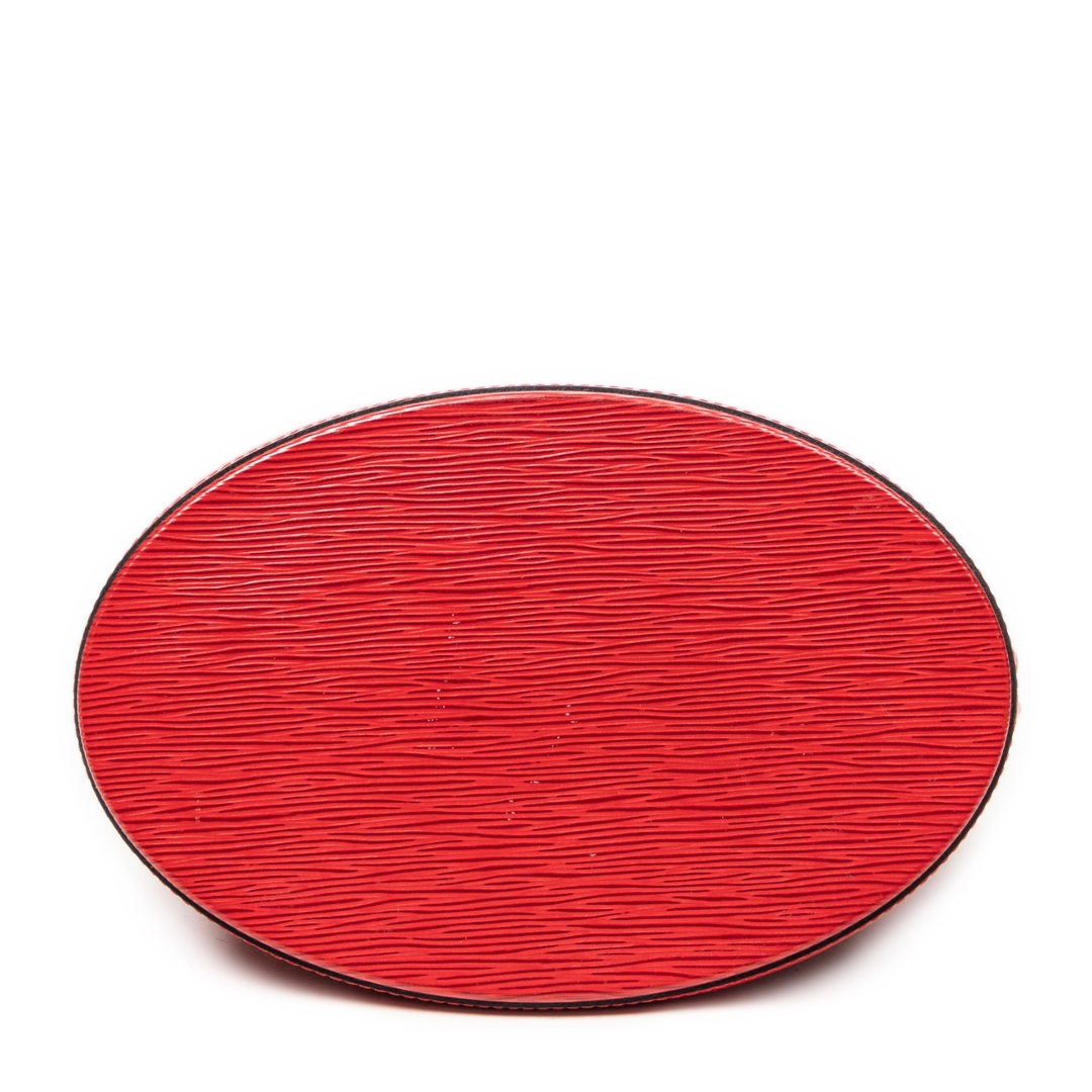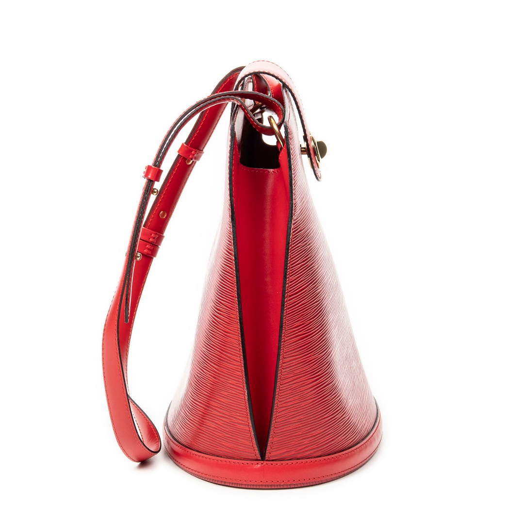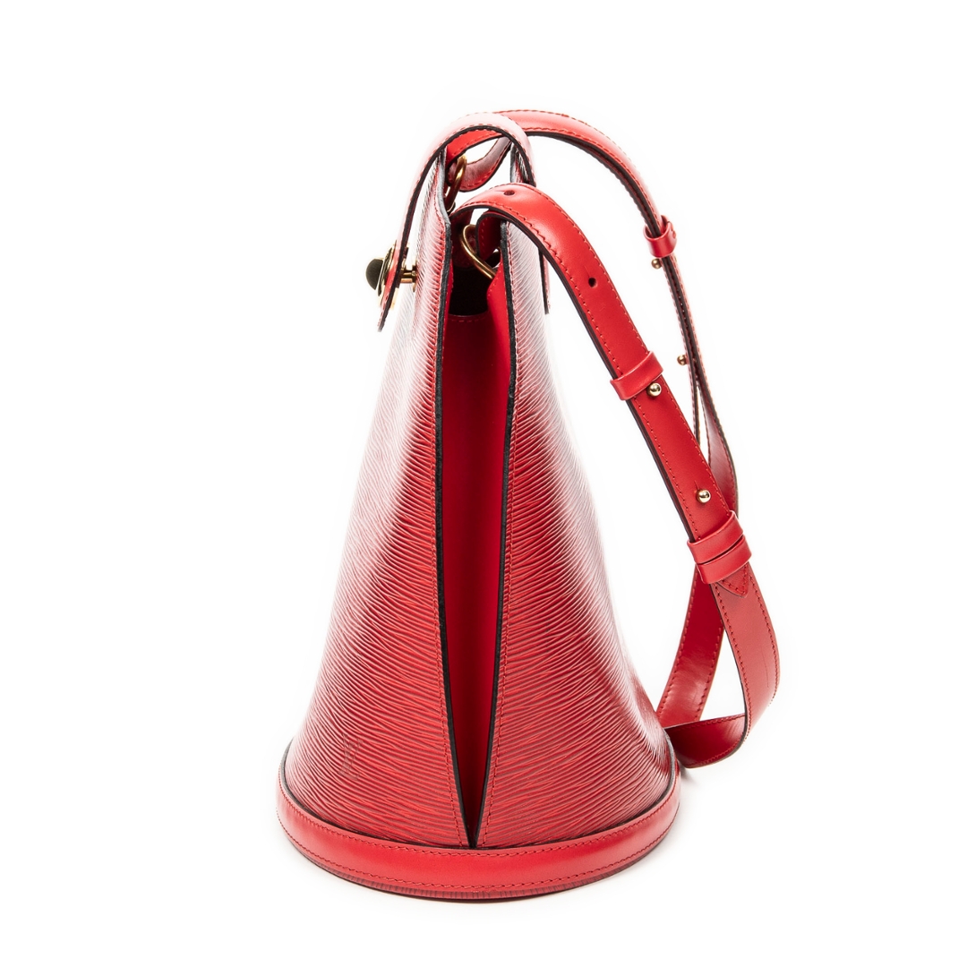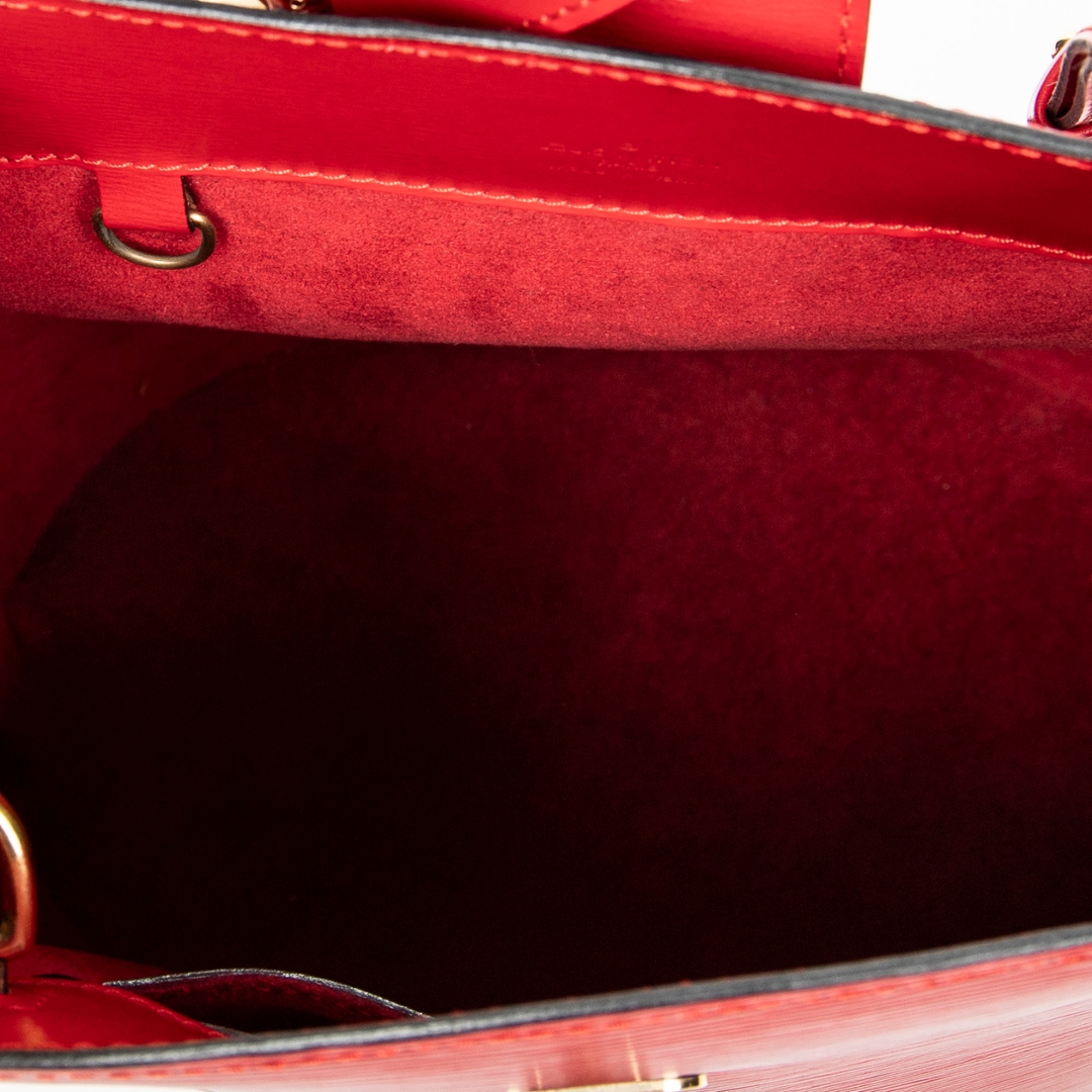 A vintage Louis Vuitton red calf leather Cluny bag with a certificate of authenticity. Approximately 30cm height, 26cm width.