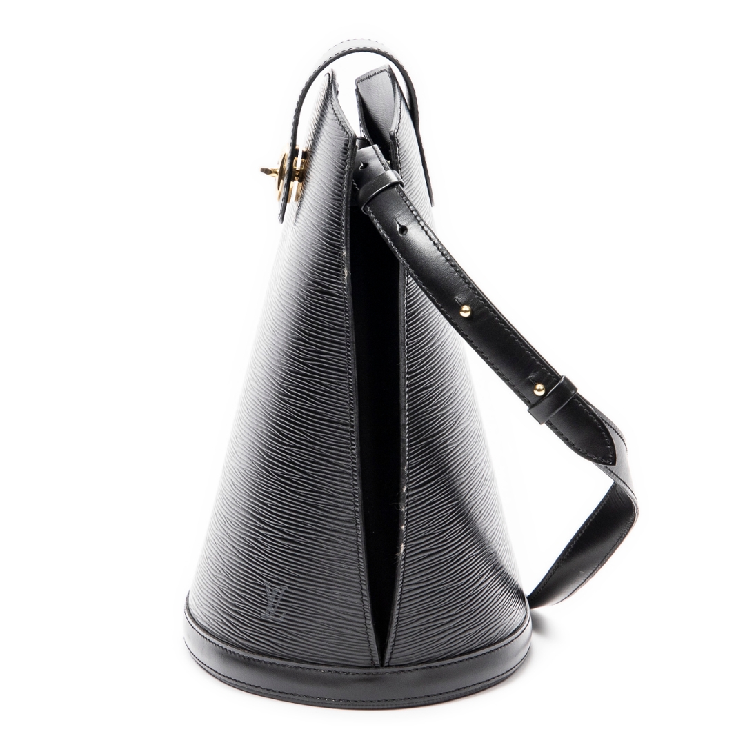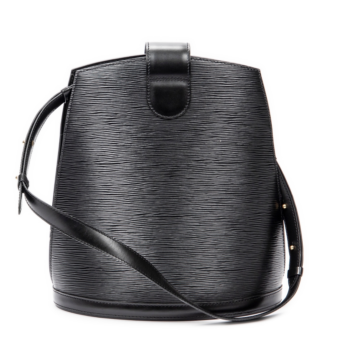 A vintage Louis Vuitton Cluny bag crafted from black calf leather, featuring the brand’s signature textured finish and a structured bucket-style silhouette. The elegant design is complemented by a distinctive top flap with a gold-tone turn-lock closure, creating a refined and timeless aesthetic suited to both day and evening wear.
