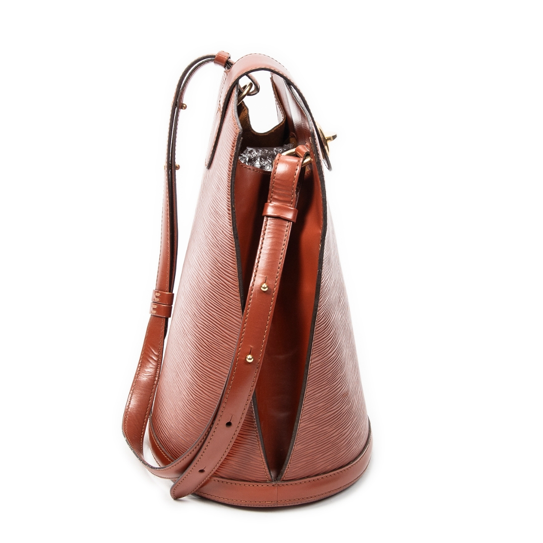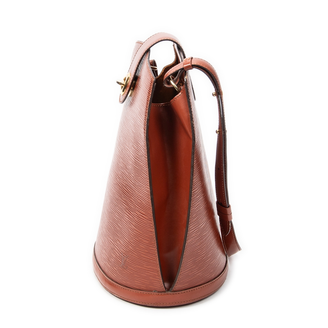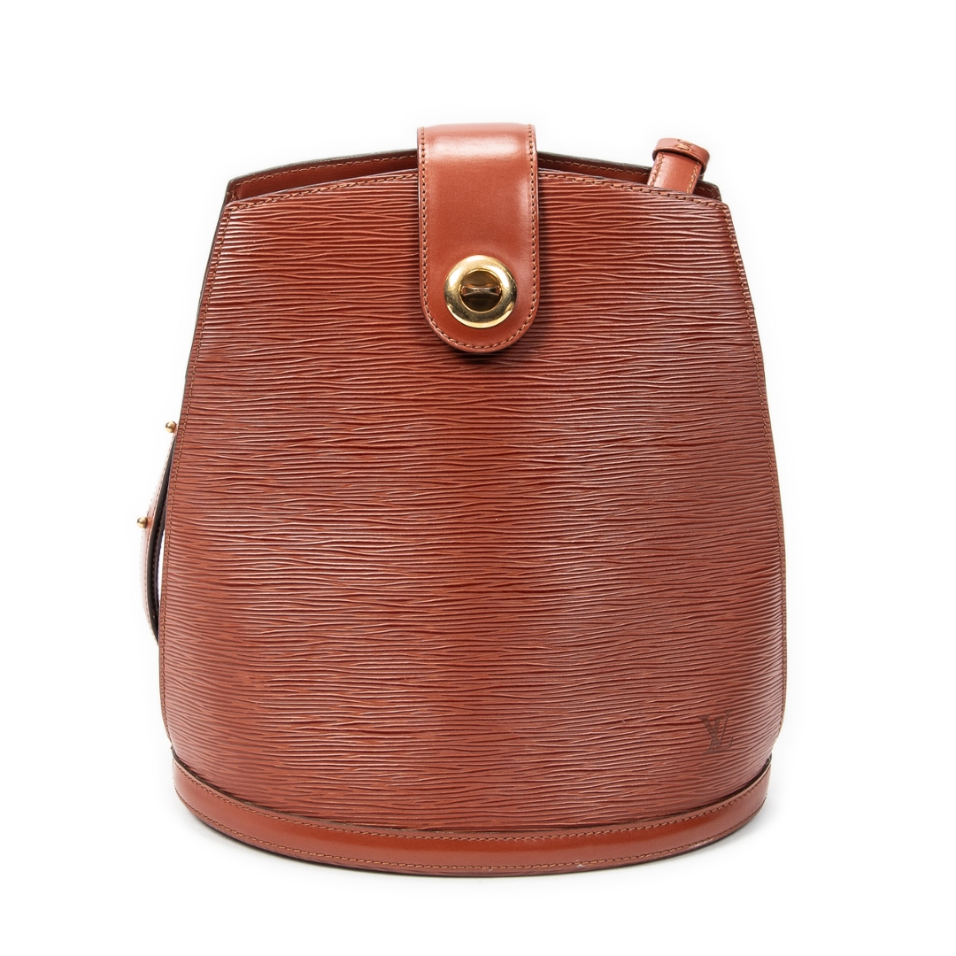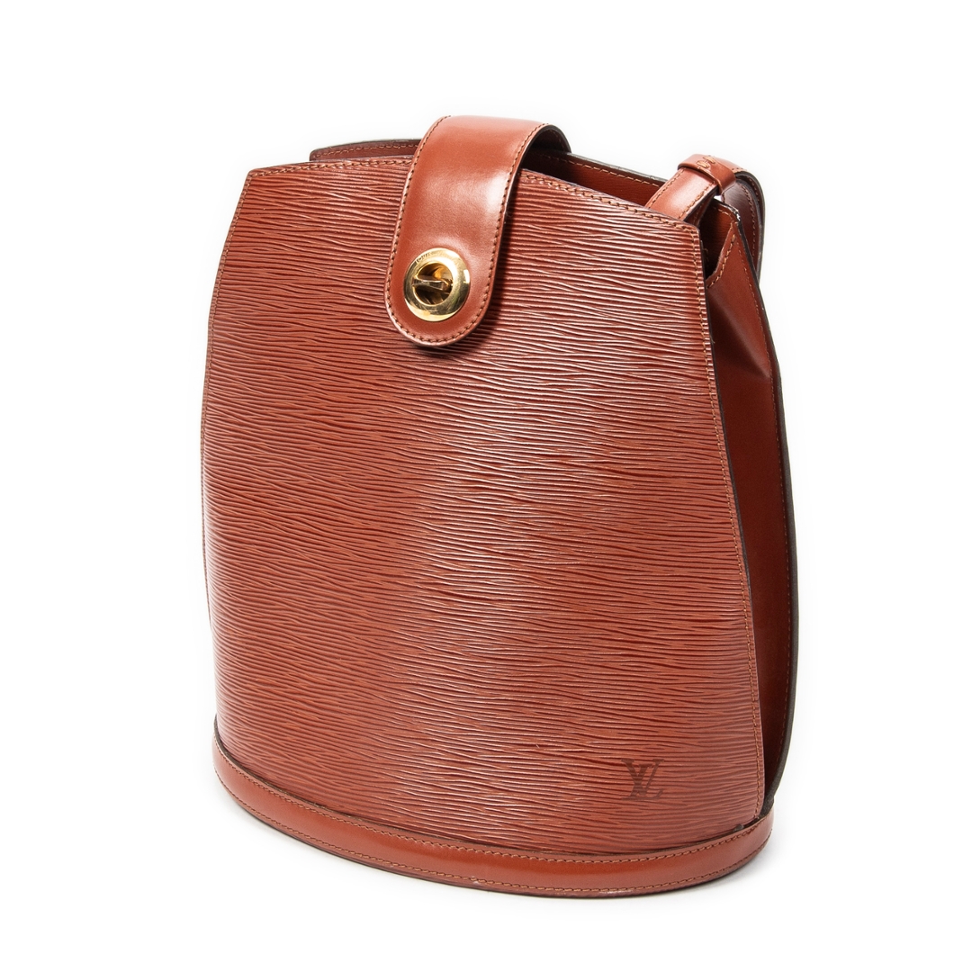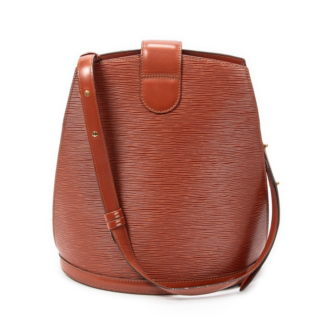 A vintage Louis Vuitton Cluny bag crafted in rich tan Epi calf leather, offering a structured and timeless silhouette that reflects classic Parisian design. The elegant upright shape is complemented by a top handle and a signature front flap with gold-tone turn-lock closure, creating a refined and secure everyday piece. Measuring approximately 30cm in height and 26cm in width, it provides a practical size while maintaining a sleek profile.