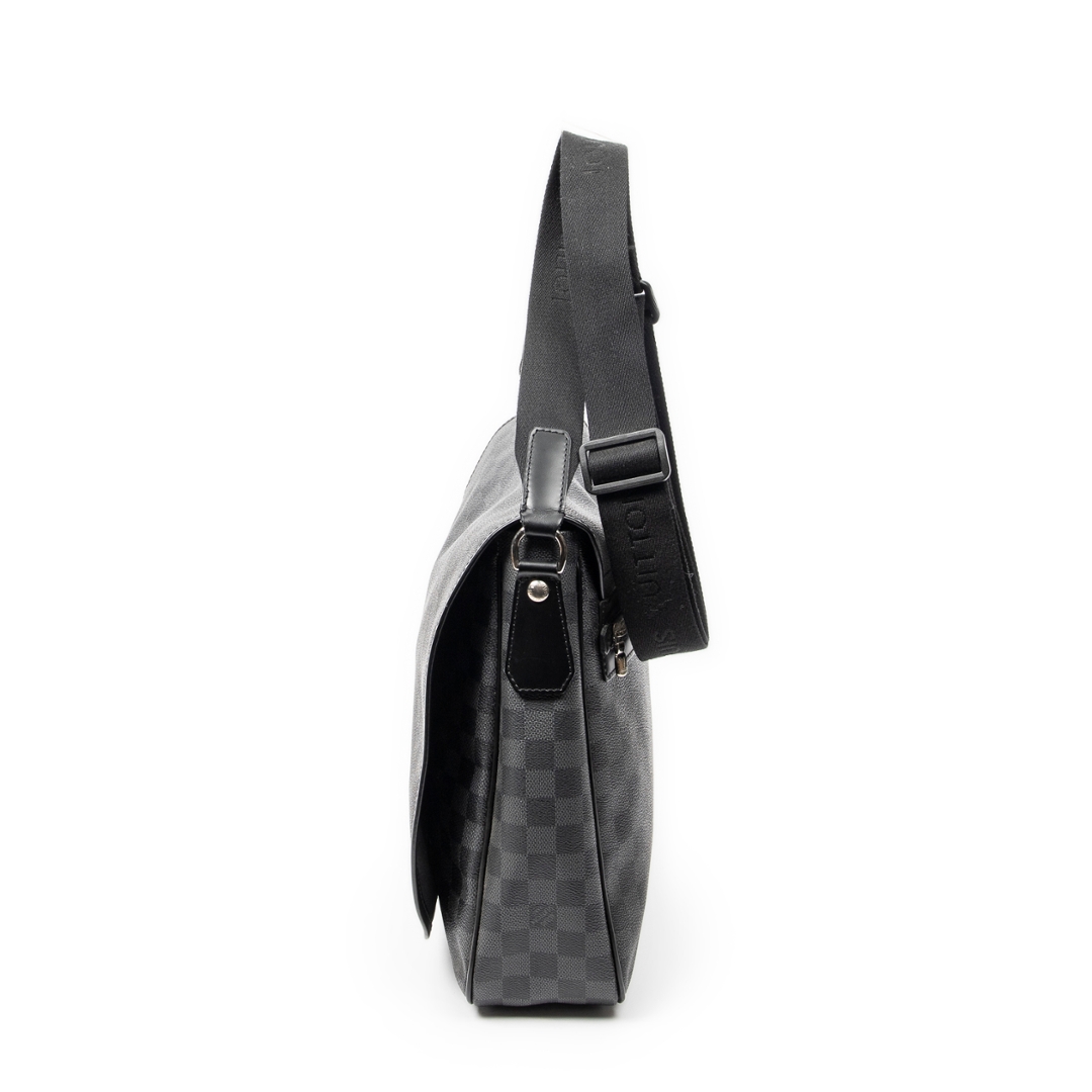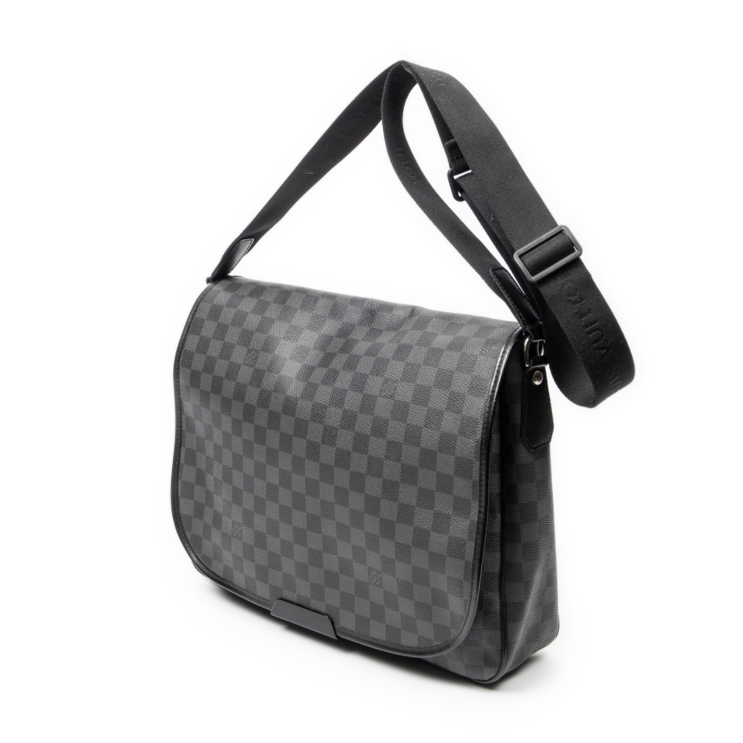 A vintage Louis Vuitton Daniel bag crafted from black and grey coated canvas in the signature Damier pattern, offering a sleek and contemporary take on classic Louis Vuitton design. The structured messenger silhouette is complemented by tonal leather trim and a wide adjustable strap, creating a refined yet practical everyday piece.
