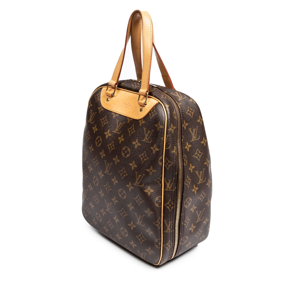 A vintage Louis Vuitton Excursion bag crafted in the iconic brown Monogram coated canvas, originally designed with travel functionality in mind while offering a distinctive structured silhouette. With its upright form and compact footprint, this piece measures approximately 33cm in height and 25cm in width, making it both practical and visually unique.