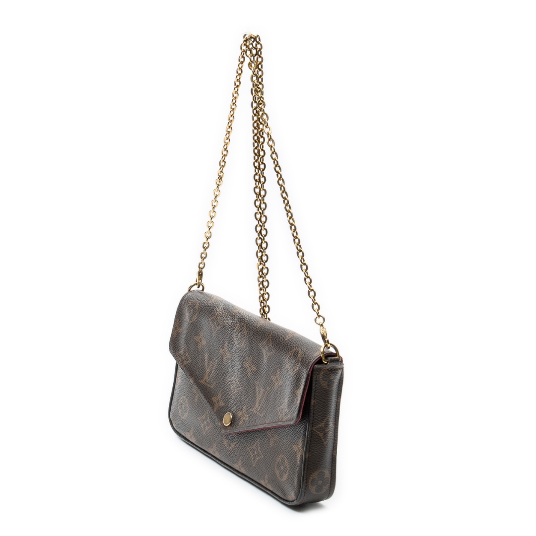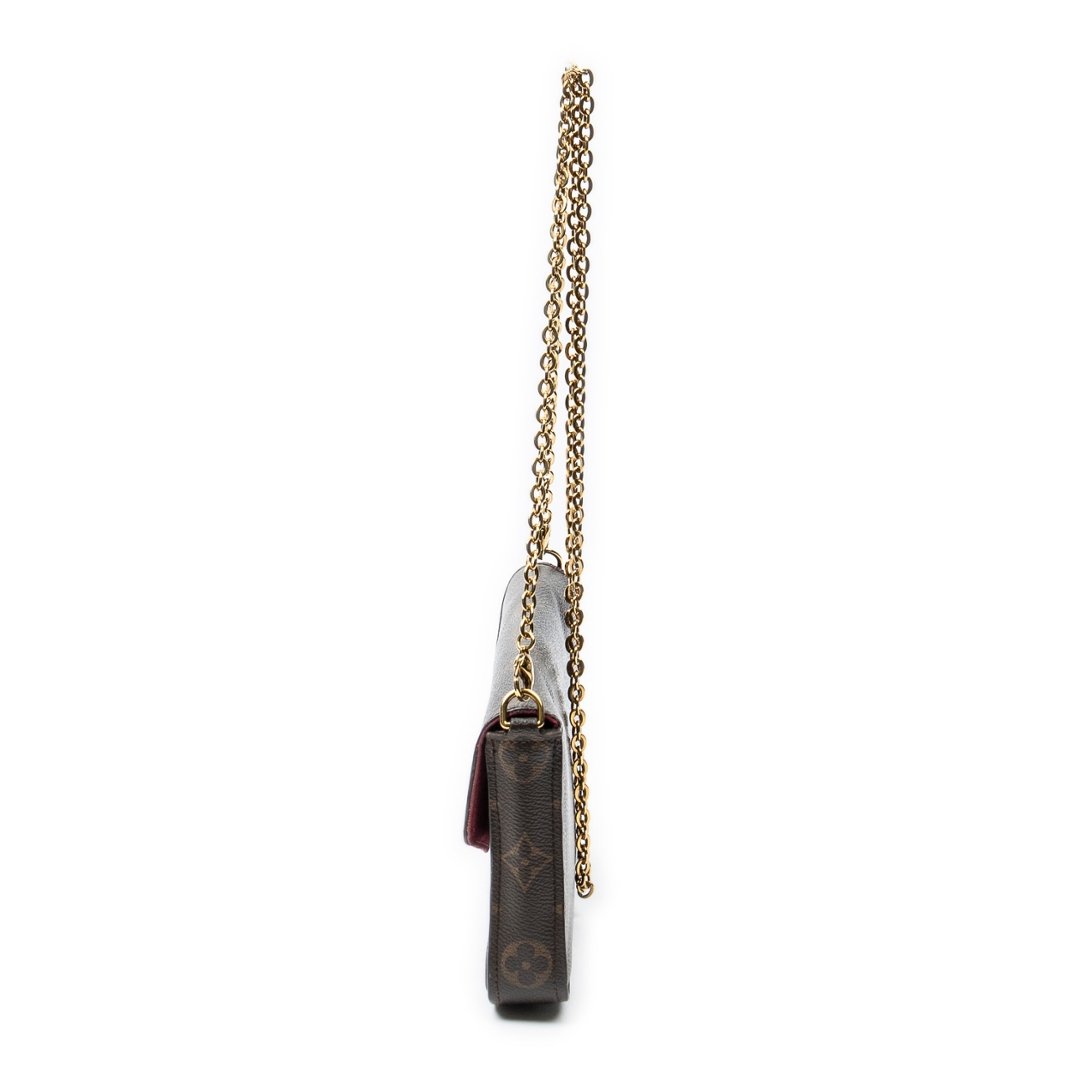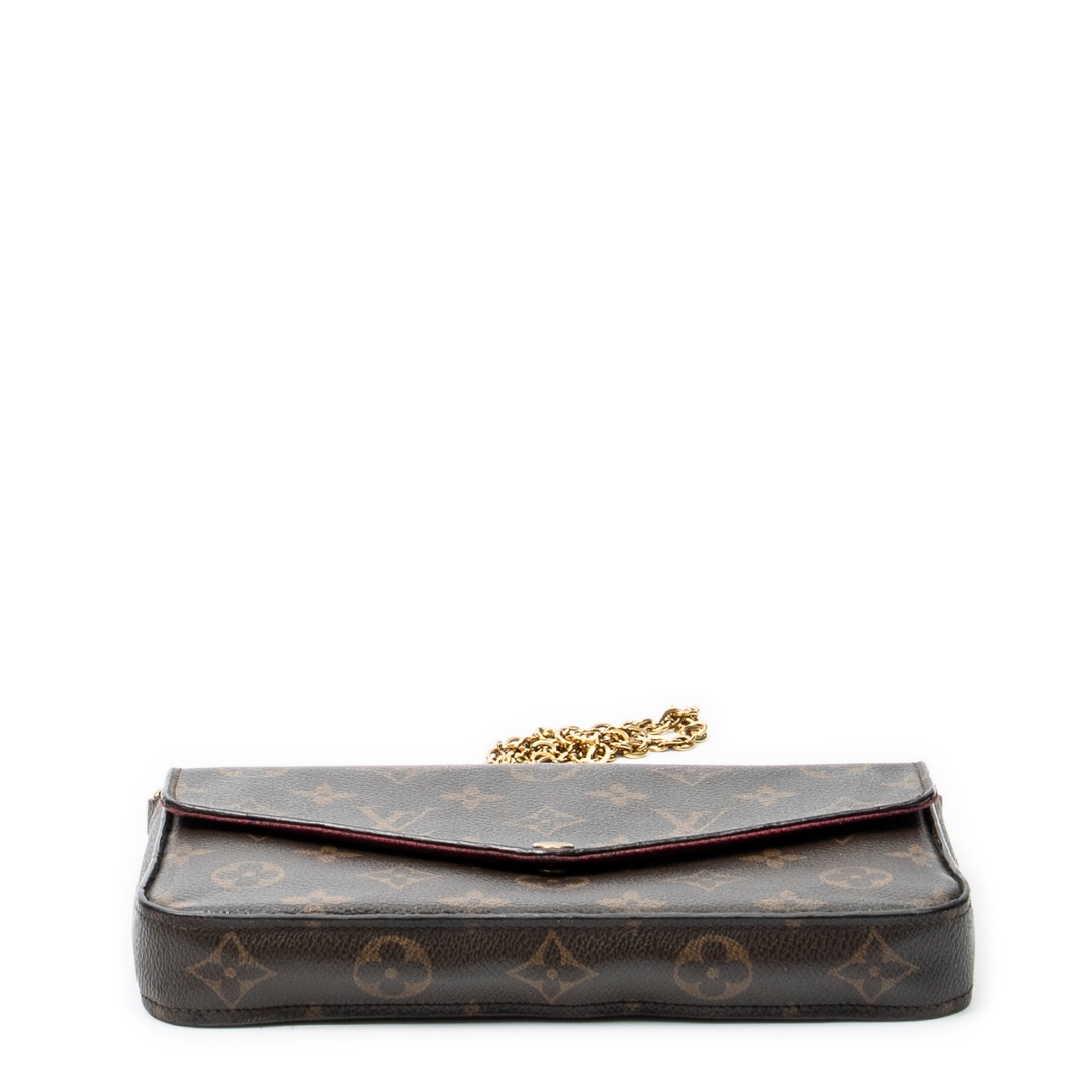 A vintage Louis Vuitton Félicie Pochette bag crafted in the iconic brown coated canvas, showcasing the signature monogram pattern with a sleek envelope-style silhouette. Finished with gold-tone hardware and a detachable chain strap, this refined piece offers both elegance and versatility within a compact design.