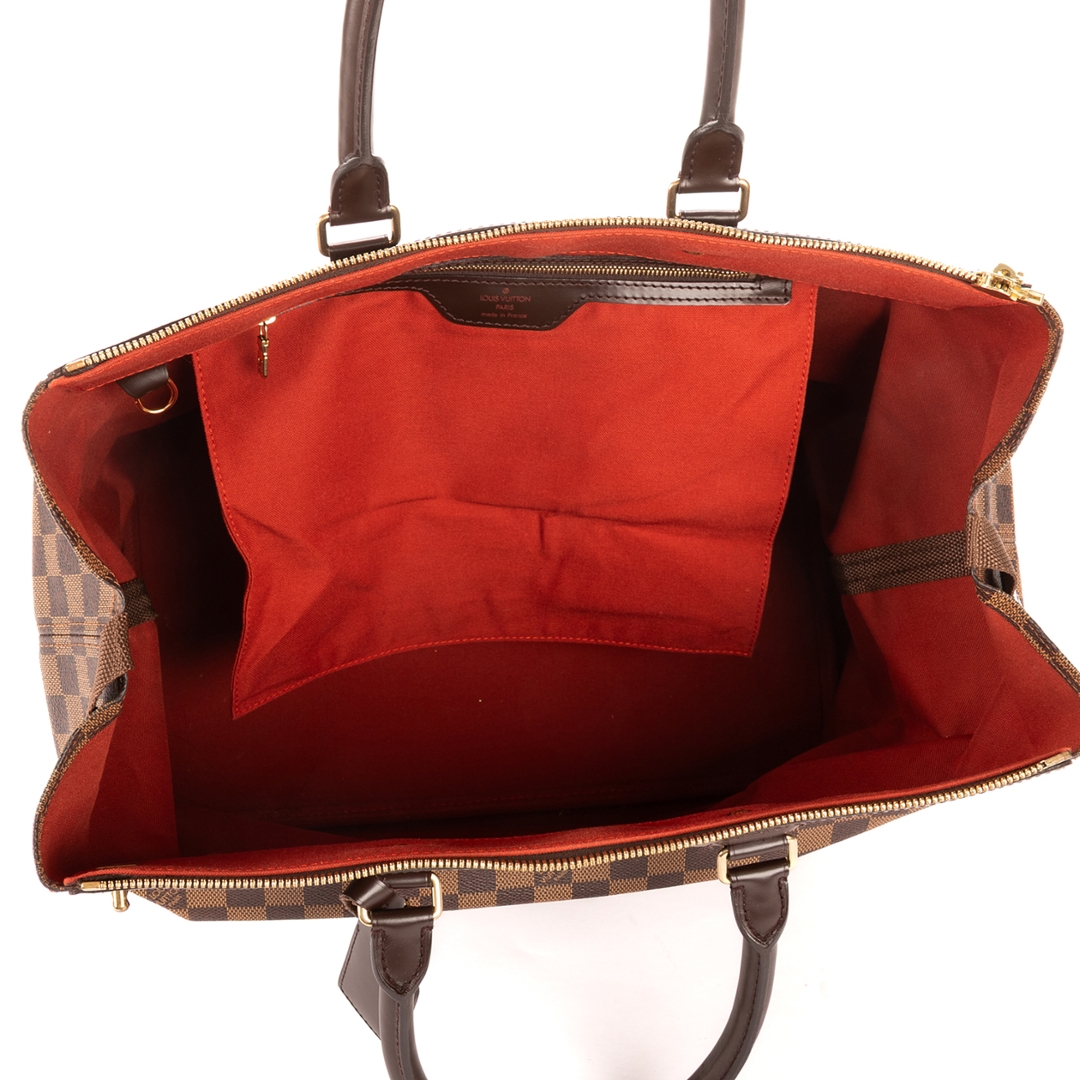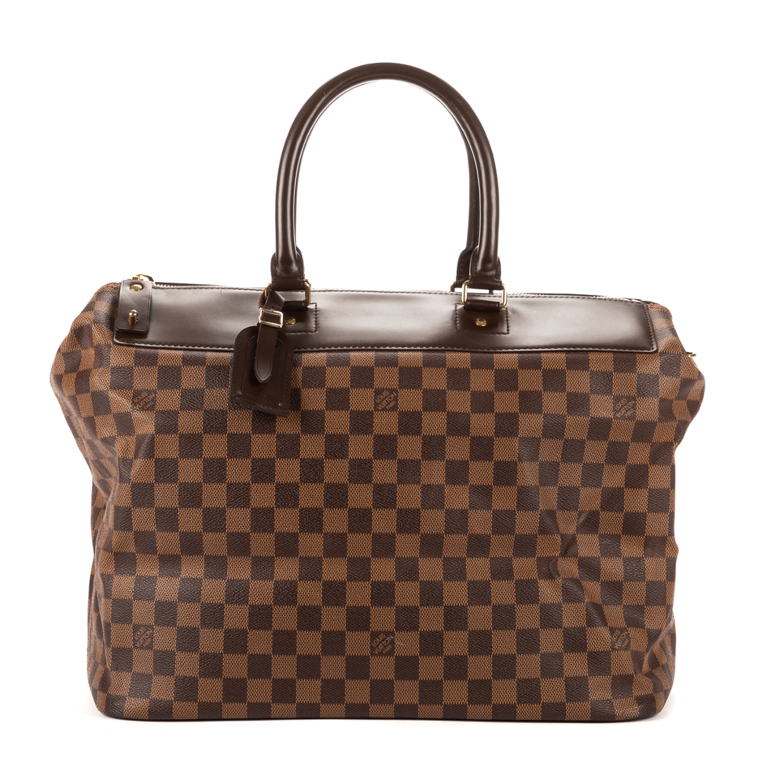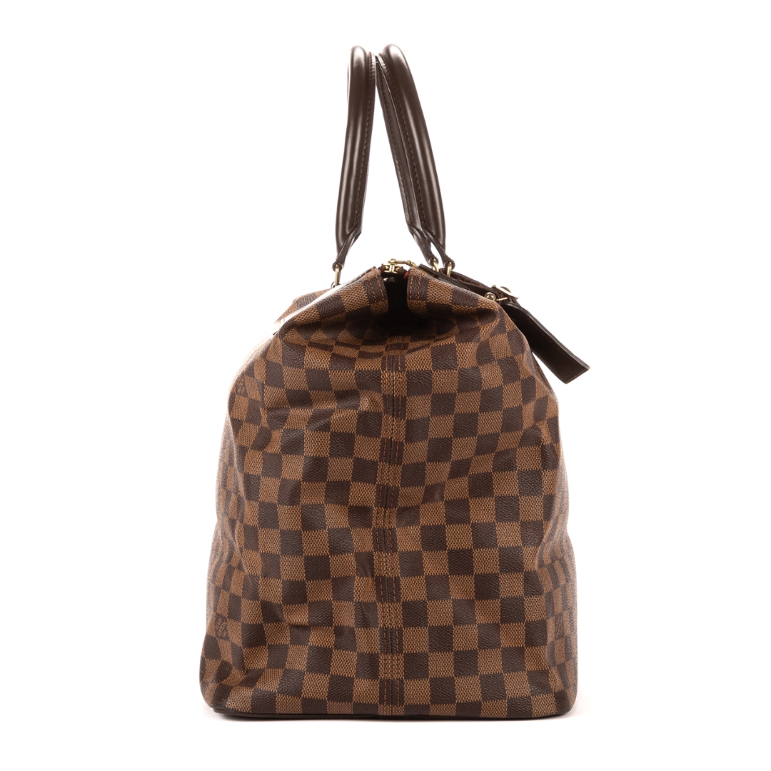 A vintage Louis Vuitton Greenwich bag crafted in the iconic brown Damier Ebene coated canvas, presenting a timeless and highly recognisable aesthetic. The structured silhouette is enhanced by rich leather trim, rolled top handles, and refined gold-tone hardware, creating a sophisticated piece that reflects the enduring appeal of Louis Vuitton’s travel-inspired heritage.