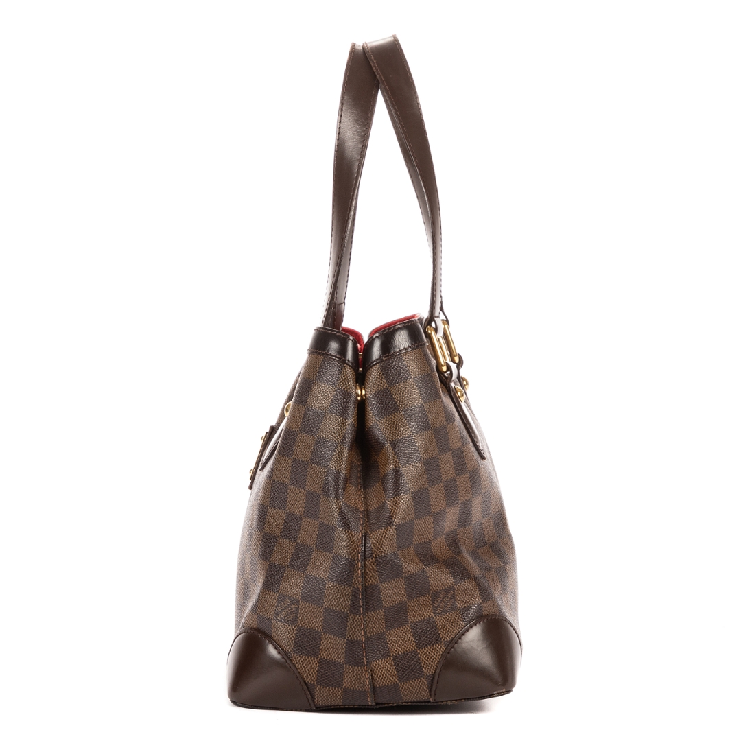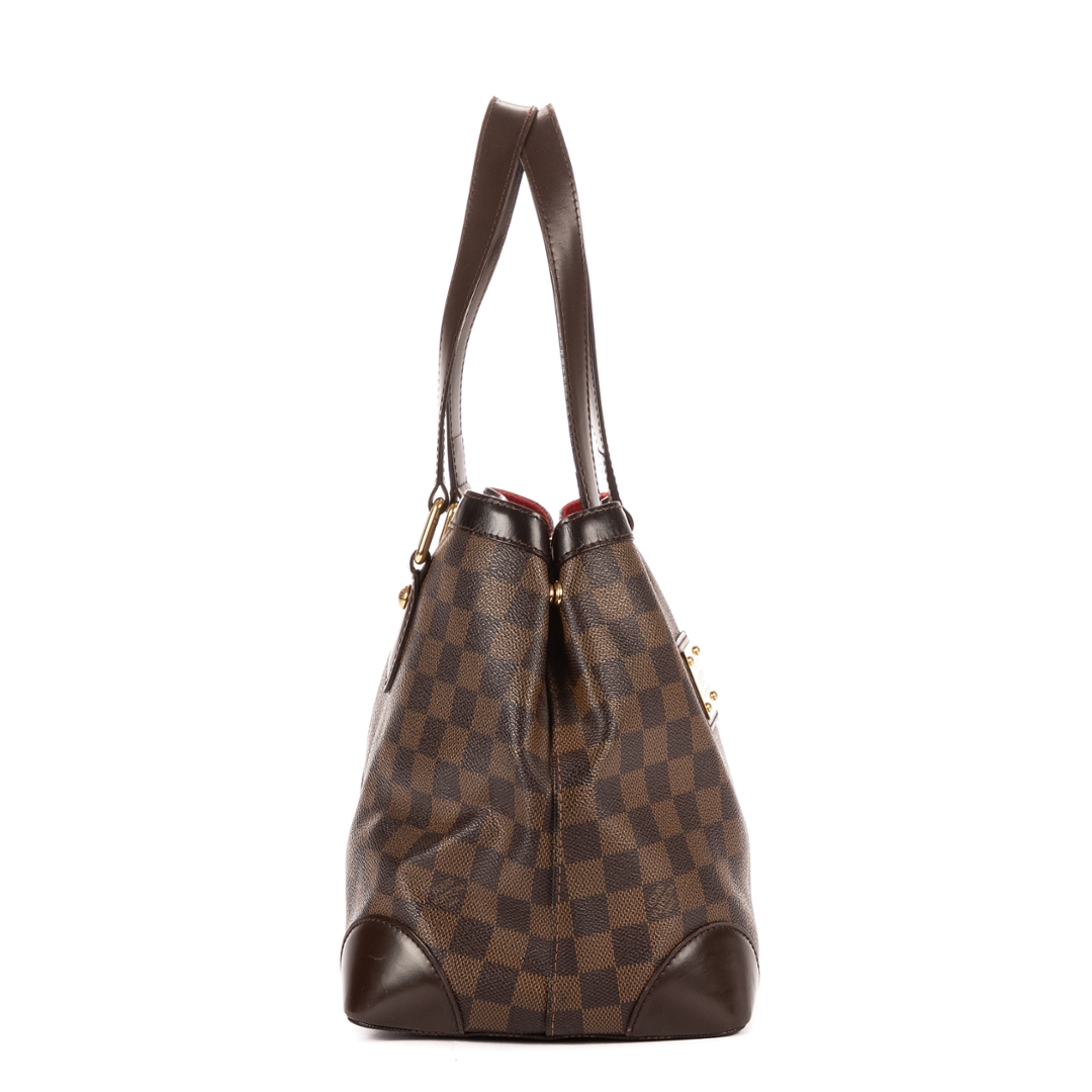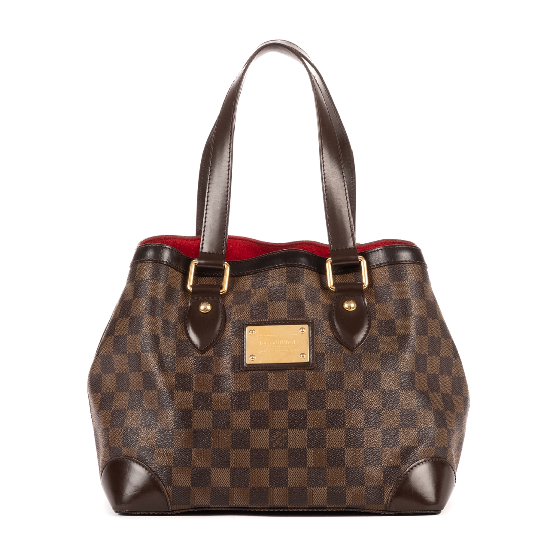 A vintage Louis Vuitton Hampstead bag crafted in dark brown Damier Ebene coated canvas, offering a compact and refined take on one of the brand’s most recognisable silhouettes. The structured design is enhanced by smooth leather trim, elegant shoulder handles, and a signature gold-tone Louis Vuitton plaque to the front, delivering a timeless piece with understated luxury.