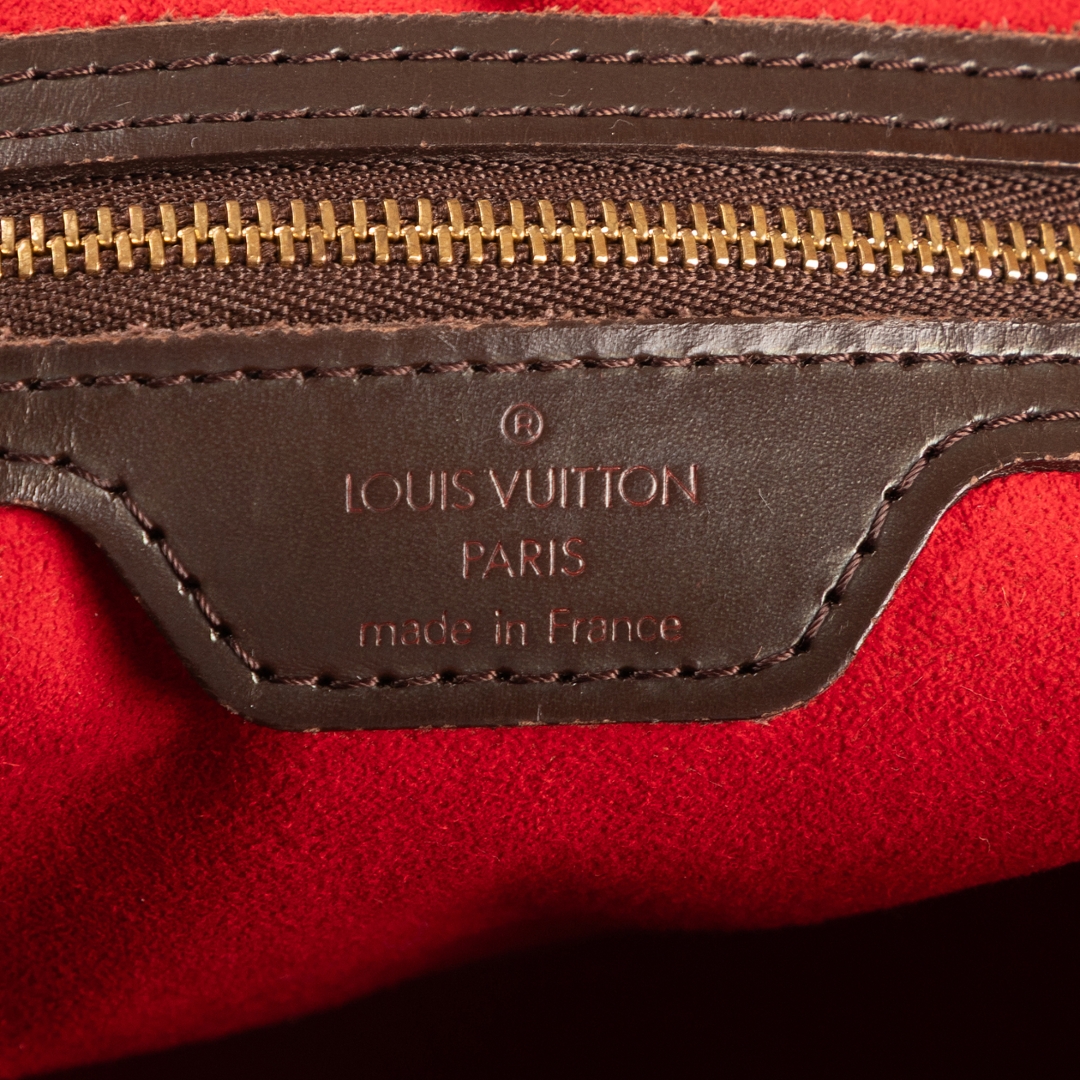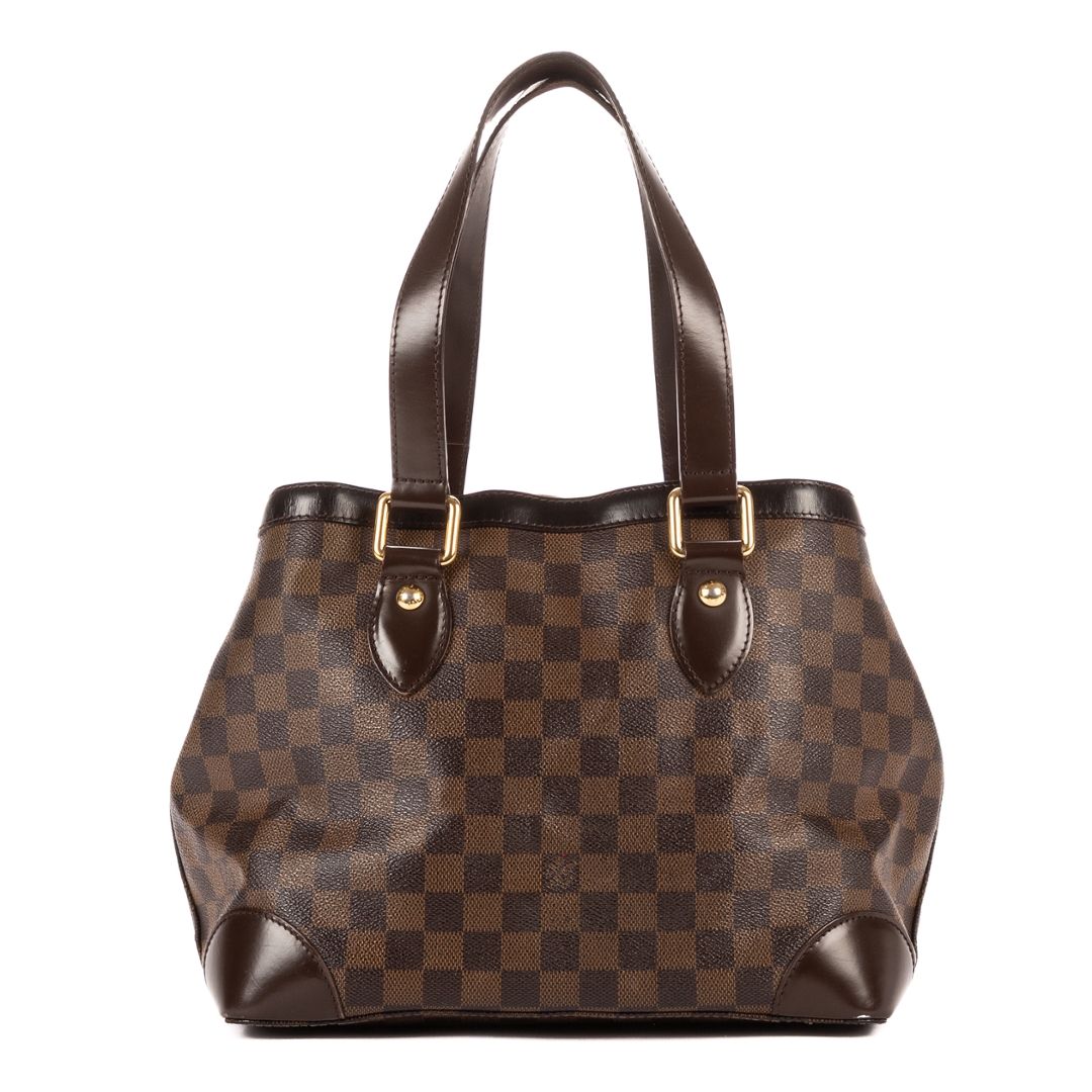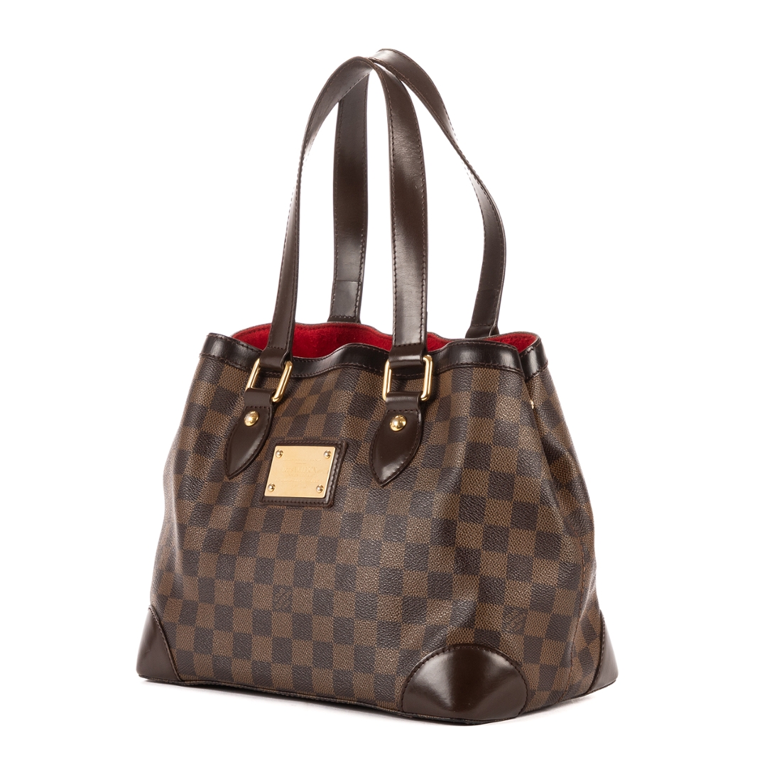 A vintage Louis Vuitton Hampstead bag crafted in dark brown Damier Ebene coated canvas, offering a compact and refined take on one of the brand’s most recognisable silhouettes. The structured design is enhanced by smooth leather trim, elegant shoulder handles, and a signature gold-tone Louis Vuitton plaque to the front, delivering a timeless piece with understated luxury.