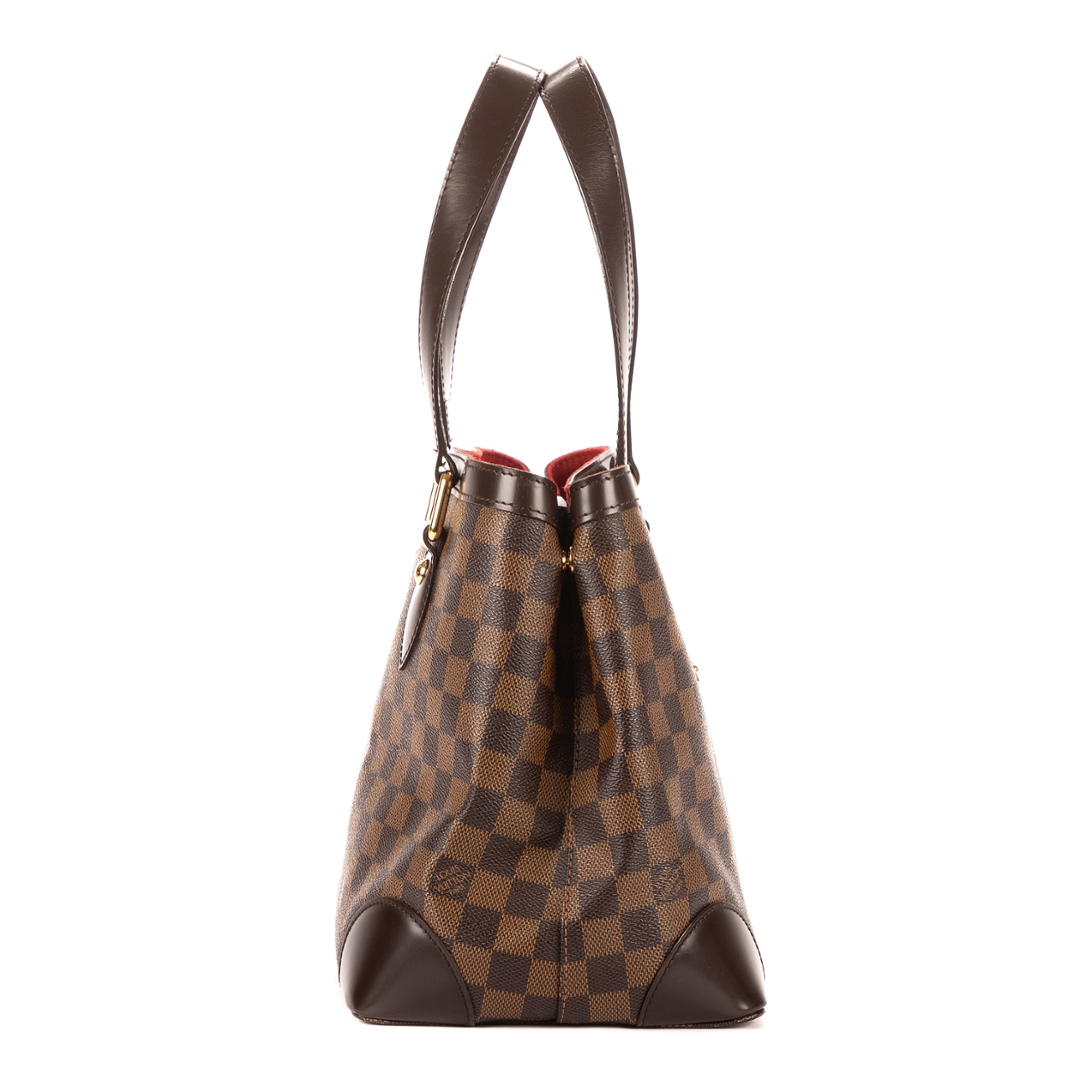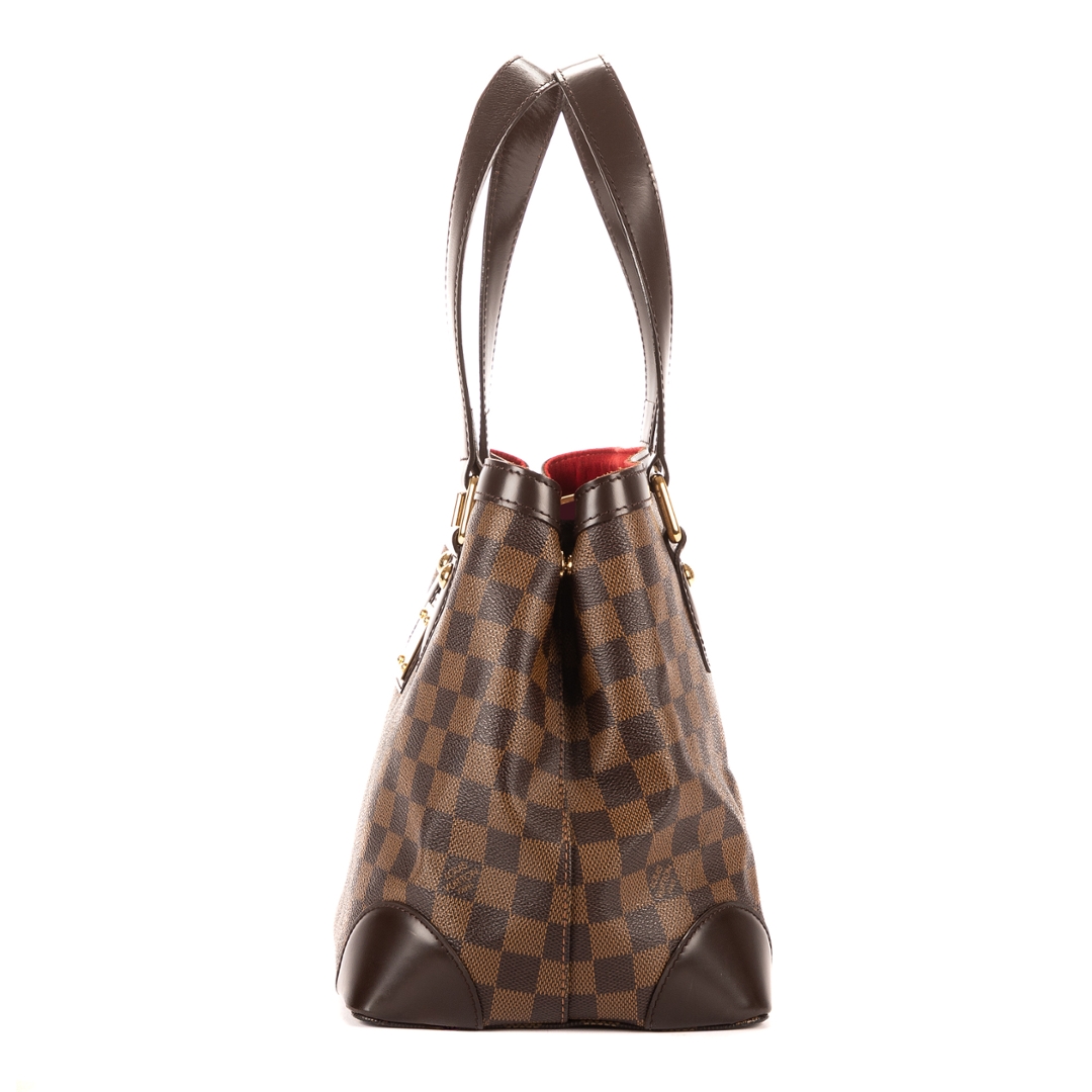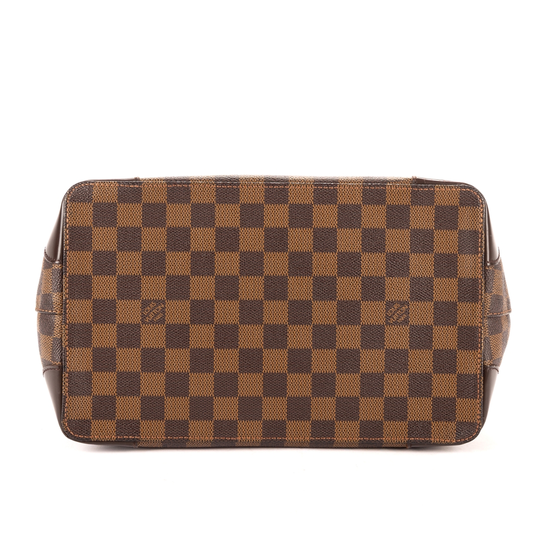 A vintage Louis Vuitton Hampstead bag crafted in dark brown Damier Ebene coated canvas, offering a compact yet elegant interpretation of one of the brand’s most recognisable designs. The structured silhouette is complemented by smooth leather trim, refined shoulder handles, and a signature gold-tone Louis Vuitton plaque to the front, creating a timeless piece with enduring appeal.