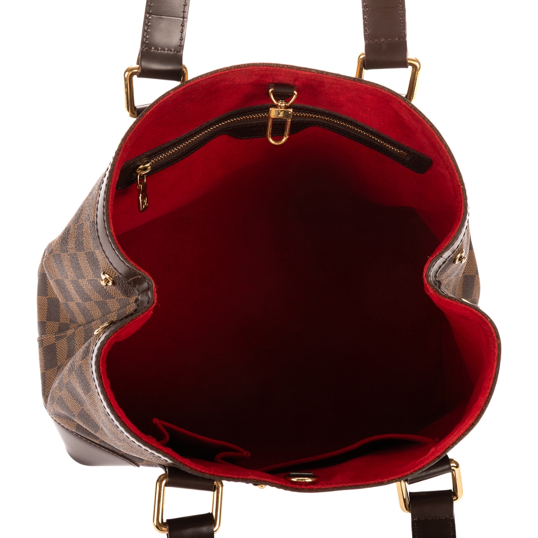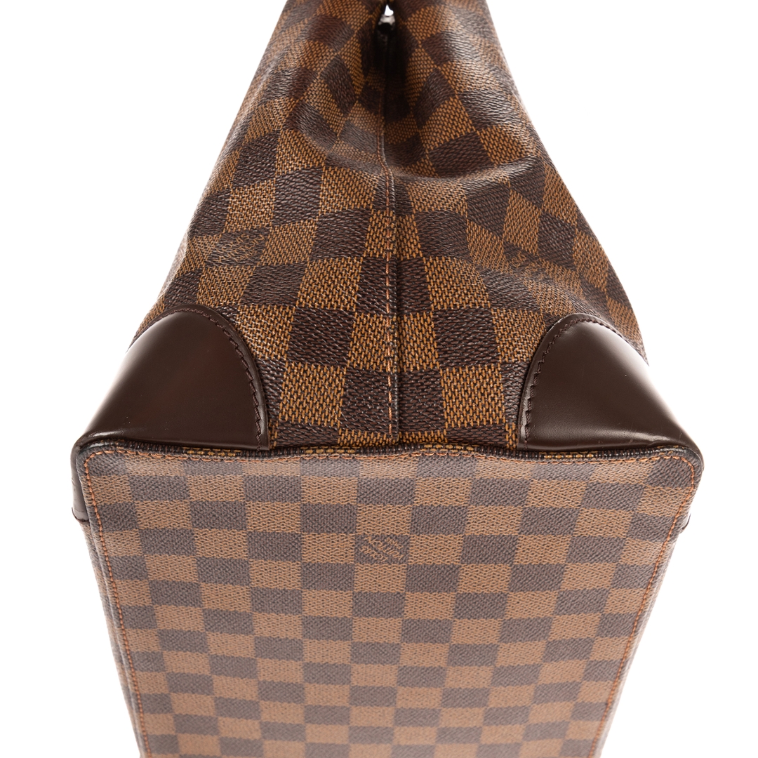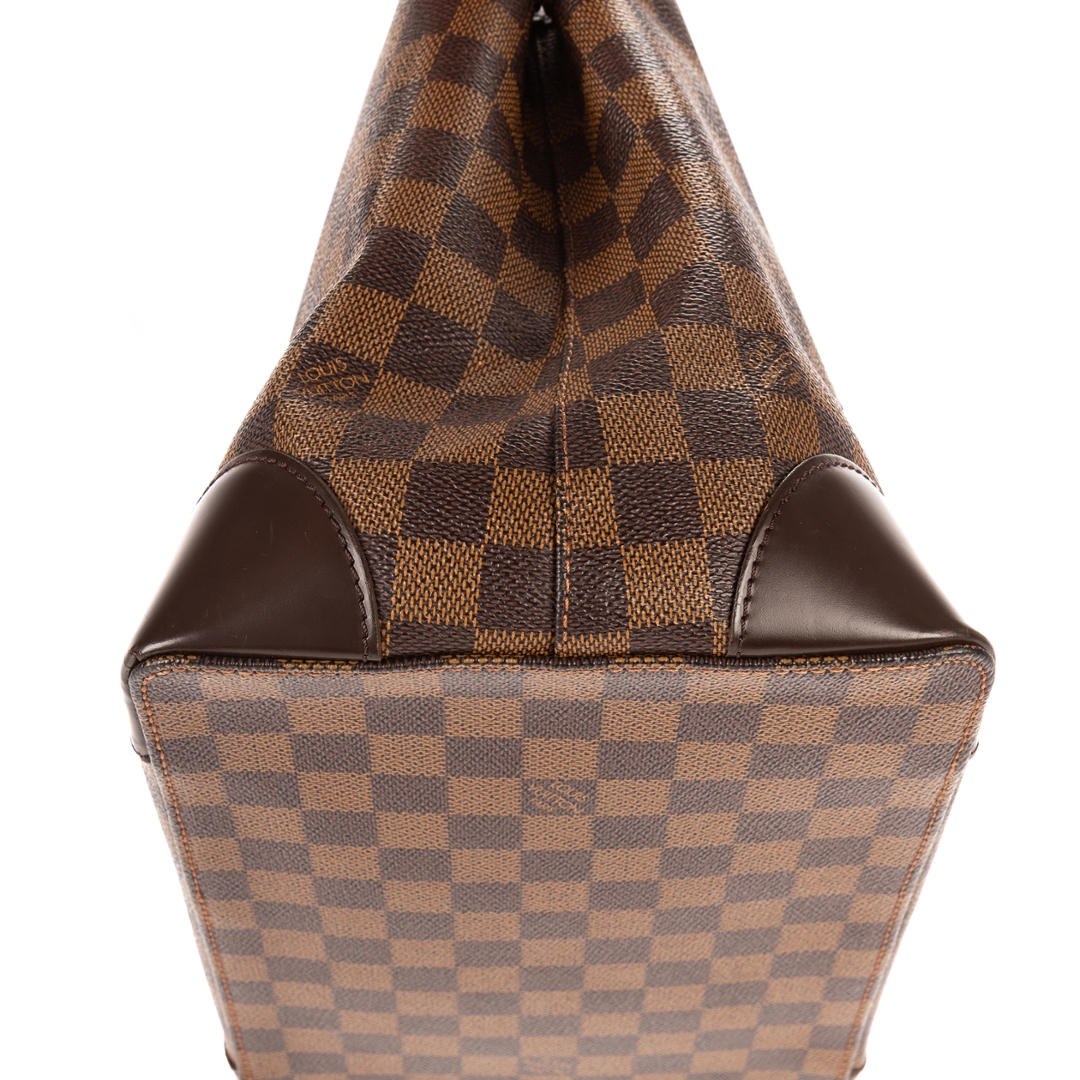 A vintage Louis Vuitton Hampstead bag crafted in dark brown Damier Ebene coated canvas, offering a compact yet elegant interpretation of one of the brand’s most recognisable designs. The structured silhouette is complemented by smooth leather trim, refined shoulder handles, and a signature gold-tone Louis Vuitton plaque to the front, creating a timeless piece with enduring appeal.